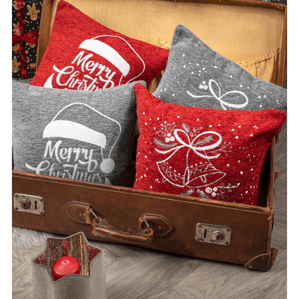 Díszpárna szürke, piros színekben, 2 féle karácsonyi mintával; anyag: 100% poliészter; használat előtt más ruháktól elkülönítve kimosandó.