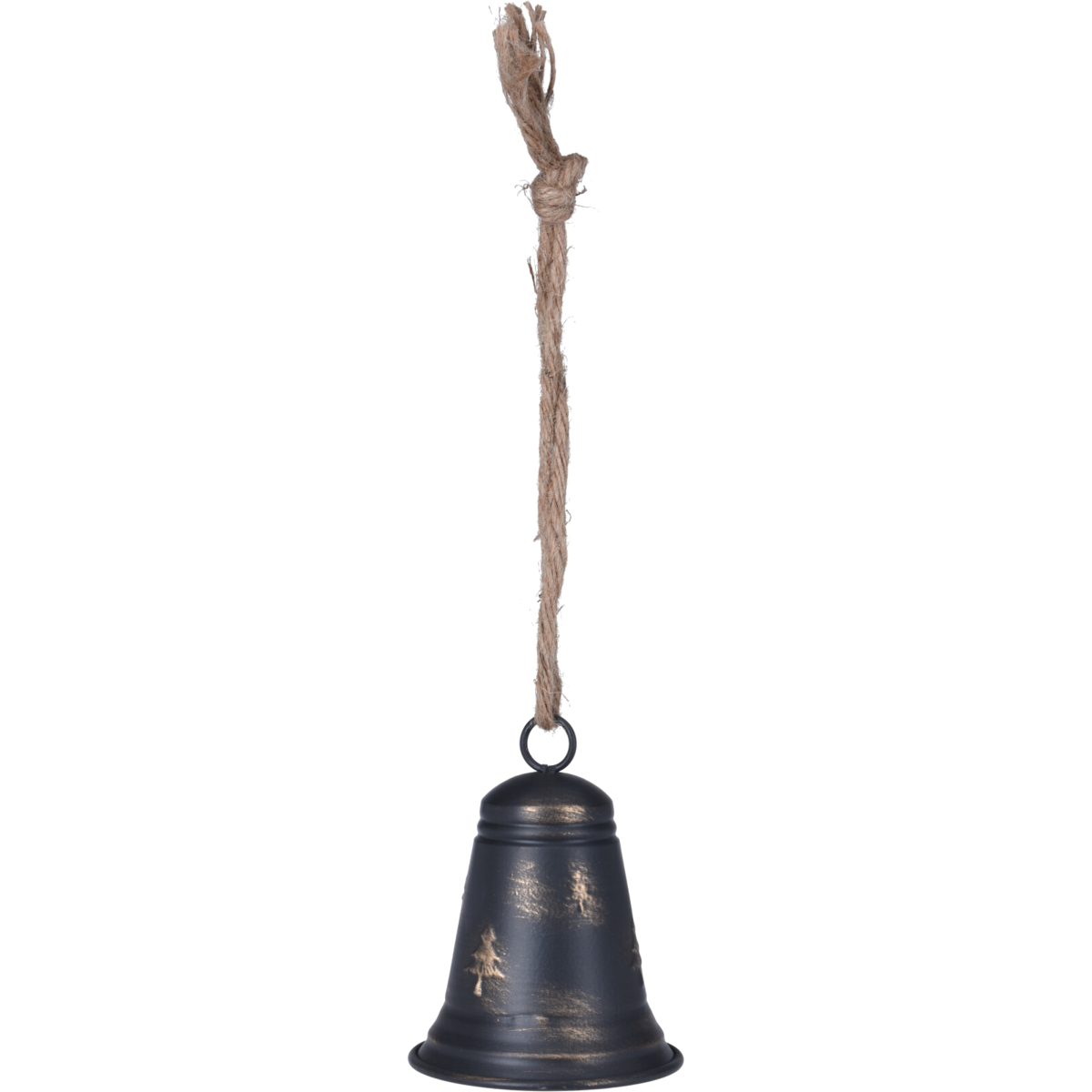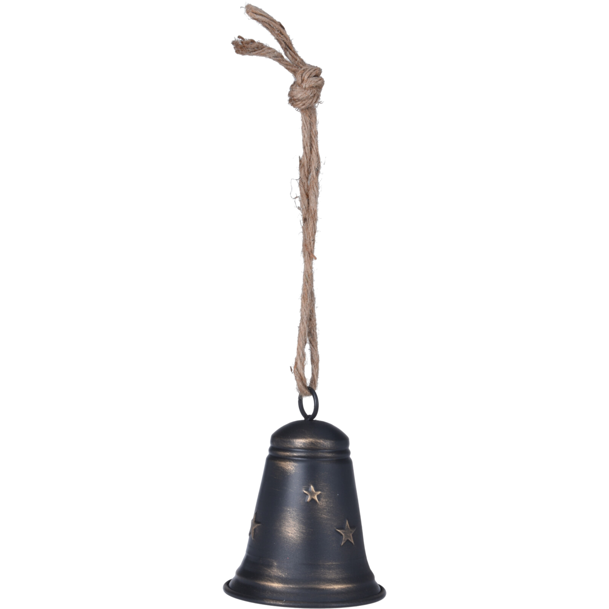 Fém, csengettyű formájú karácsonyfa dísz, fekete színben, kétféle modell (csillag vagy fa mintás).