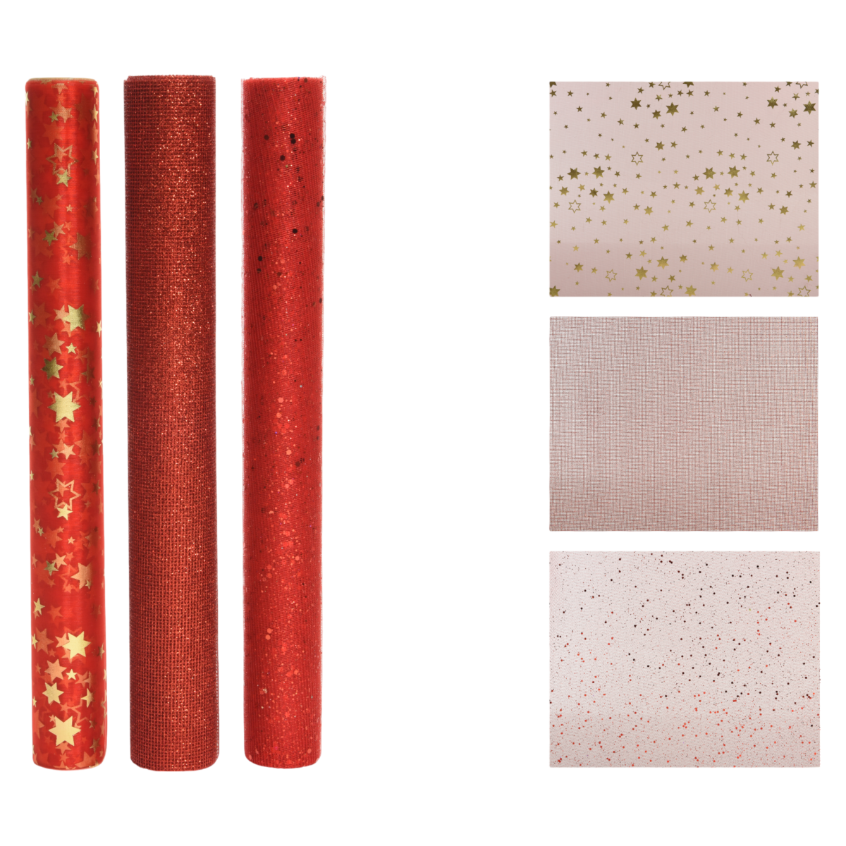 Dobd fel az ünnepi ajándékokat ezzel a 200 cm hosszú, piros színű glitteres csomagolóanyaggal, amely háromféle különböző mintázatban érhető el. A csillámporral díszített anyag látványos megjelenést ad bármilyen csomagolásnak vagy dekorációnak.