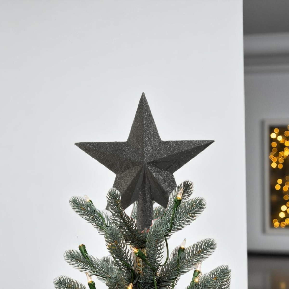 Ez a fekete, glitteres csillag formájú csúcsdísz letisztult, ugyanakkor látványos megjelenést kölcsönöz bármely karácsonyfának. A 19 cm magas, könnyű műanyagból készült dísz egyszerűen rögzíthető, és nem terheli meg a fa felső ágát.