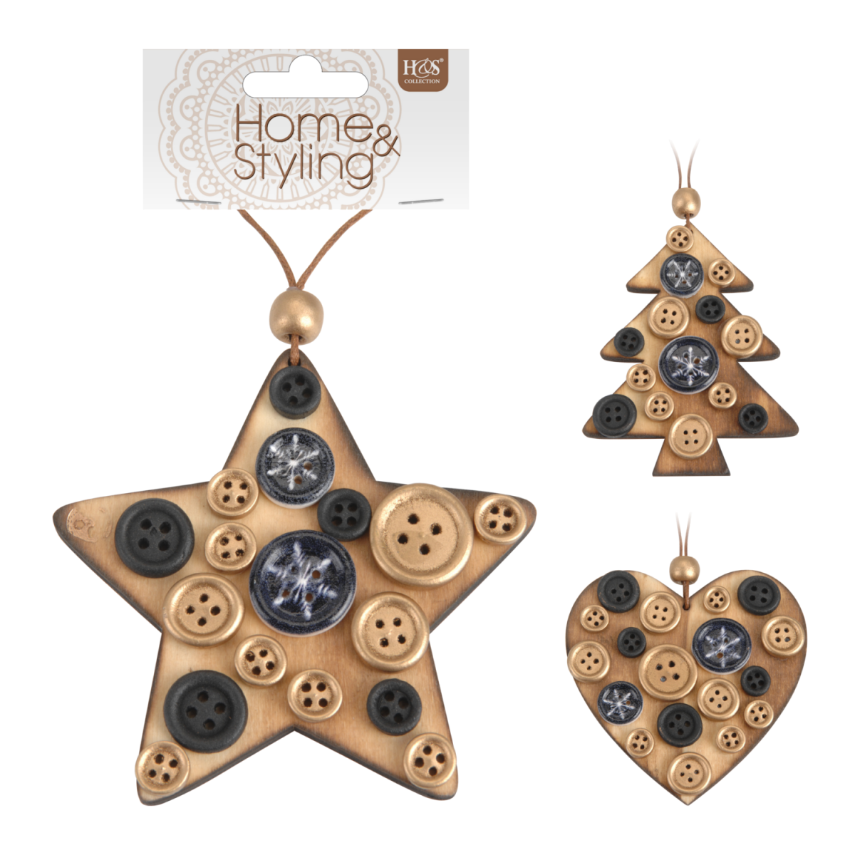 Dísz gomb mintás fa, 3féle 8x1,3x9cm - Karácsonyi dekoráció