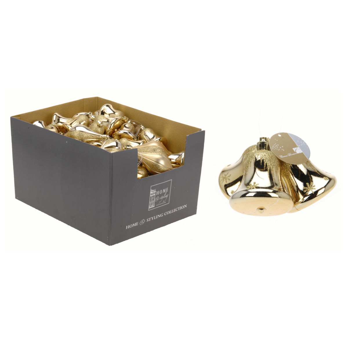 Akasztható dísz szett. 2 féle szett: 1.: 2 db-os kúpos dísz szett. 2.: 3 db-os csengő dísz. Anyaga: műanyag. Arany színben.