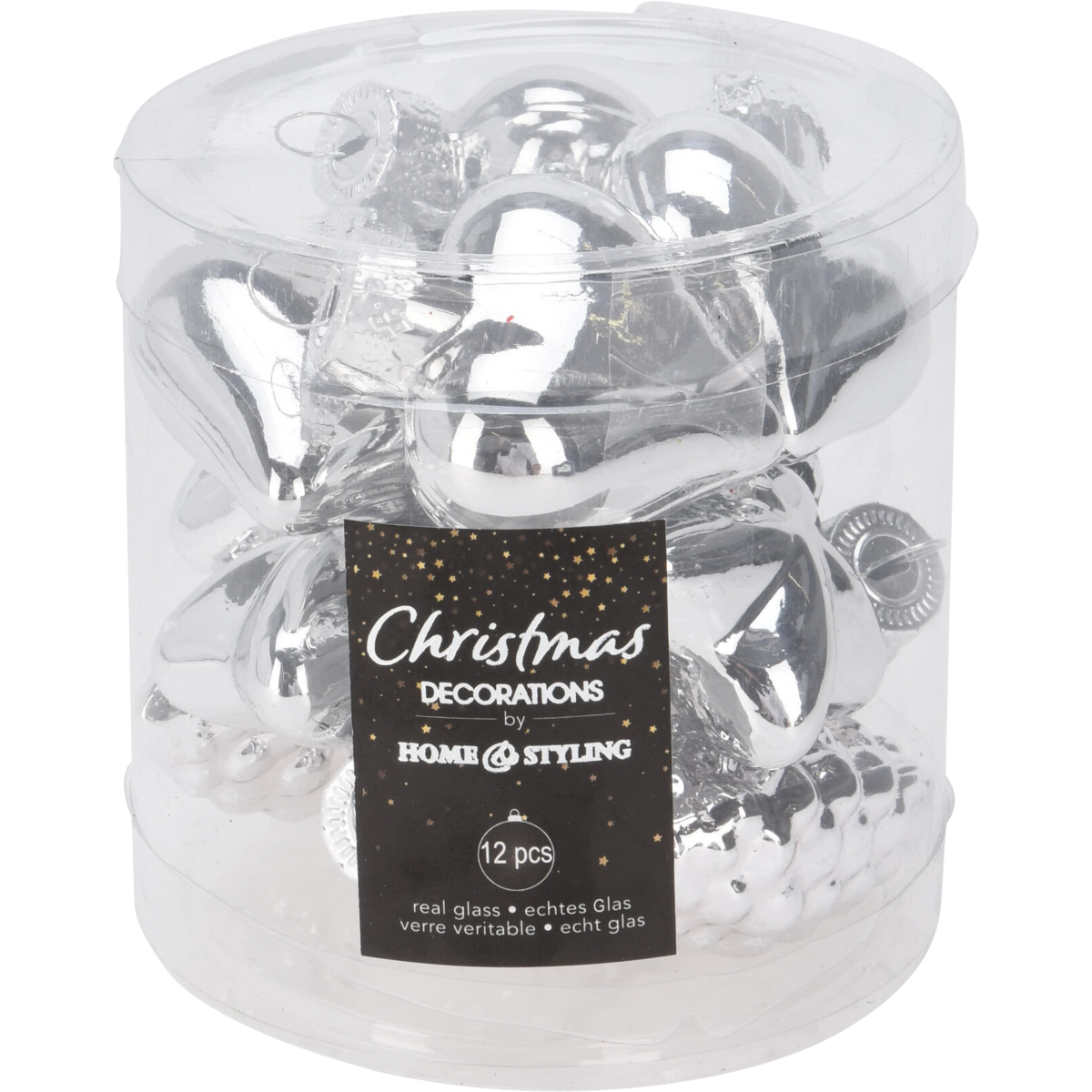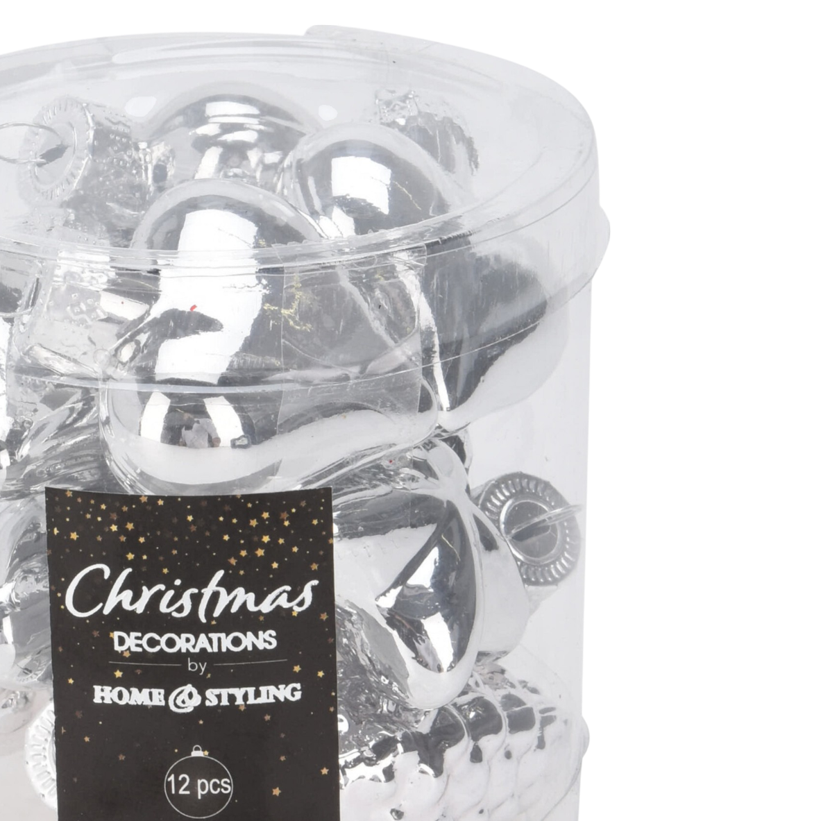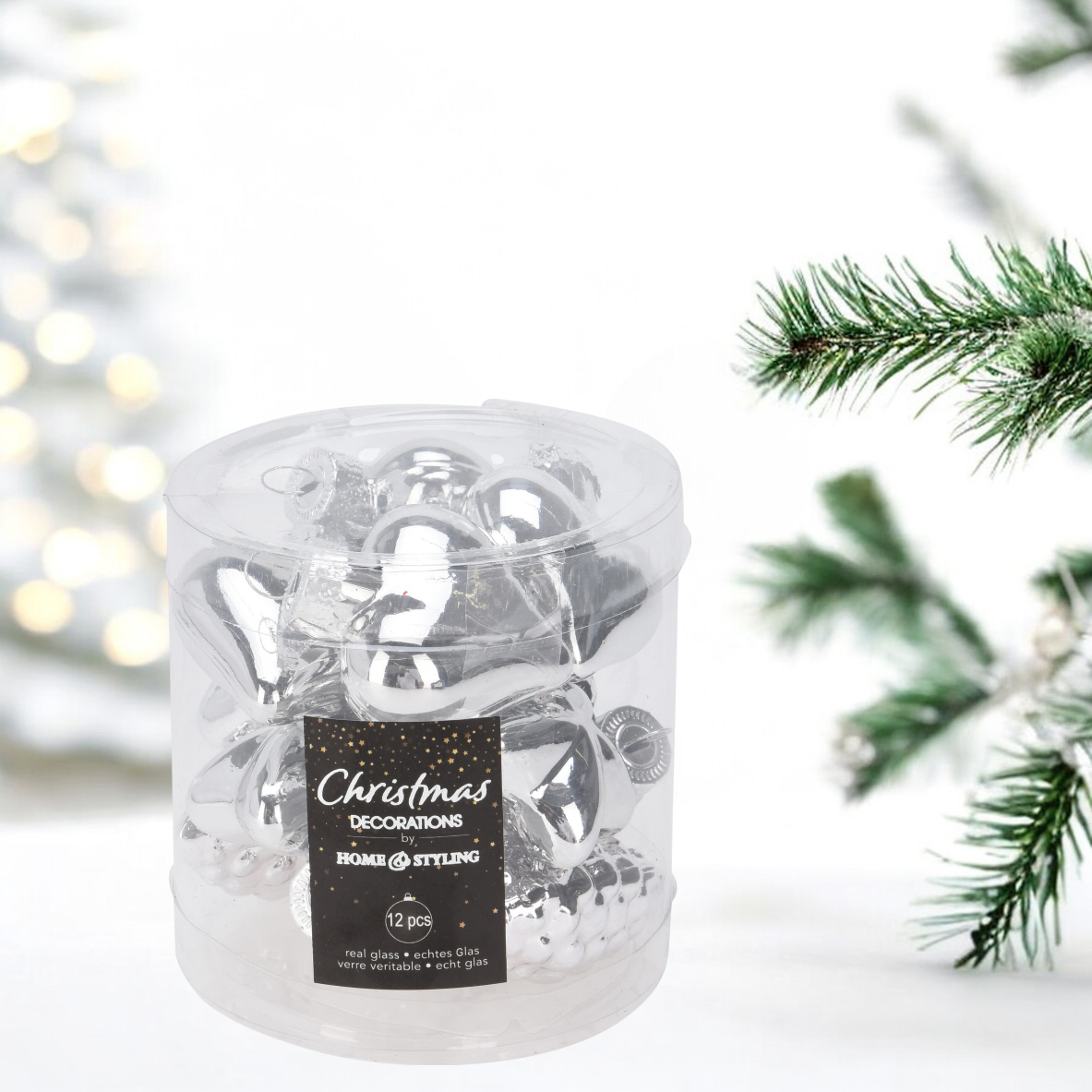A karácsonyi ünnepi hangulatot tökéletesen kiegészíti ez a 12 darabos dísz szett, amely elegáns, fényes felületű és ezüst színben pompázik. A készlet tartalmaz 4 db szív (kb. 4cm), 4 db toboz (kb. 4,5 cm) és 4 db csillag (kb. 4cm) formájú díszeket, melyek mindegyike üvegből készült, így igazán különleges fényt és eleganciát kölcsönöznek a karácsonyfának.