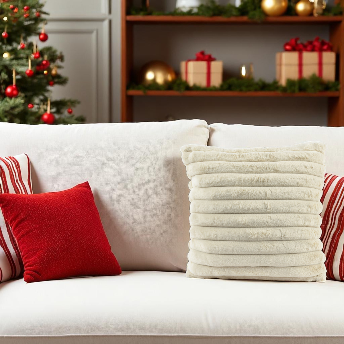 Ez az anyagában bordázott, hófehér díszpárna stílusos kiegészítője lehet bármely nappalinak vagy hálószobának. A plüss hatású, puha felület kényelmes és meleg érzetet nyújt, míg a visszafogott csíkozás modern megjelenést biztosít.