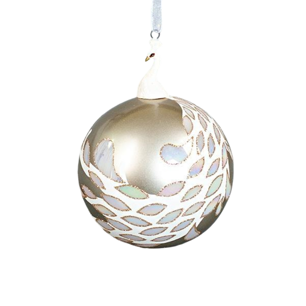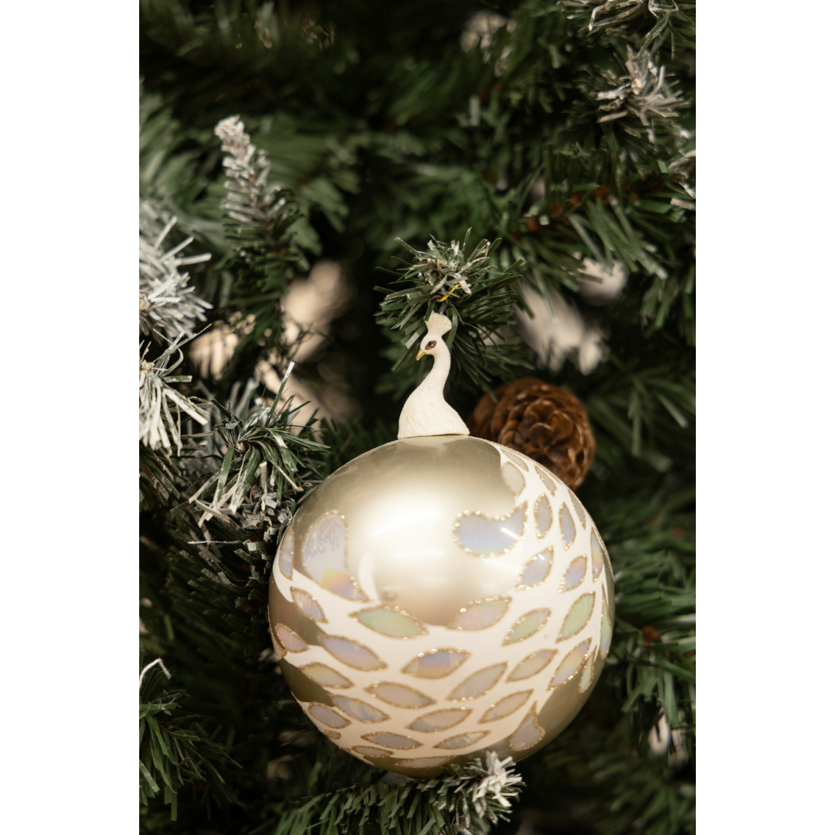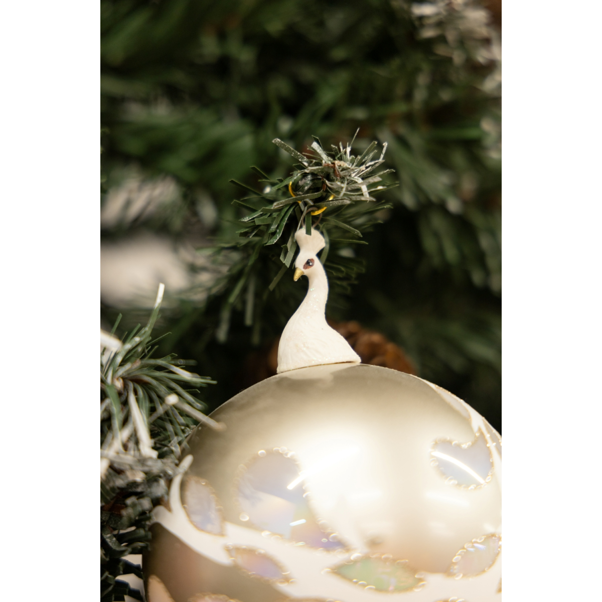 Fedezd fel a téli csodaország varázsát az arany színű, üvegből készült gömbbel. A gömböt továbbá egy porcelánból készült, fehér színű páva ékesíti. Ez a gyönyörűen megalkotott dísz tökéletes választás, ha szeretnéd otthonodat ünnepi hangulattal megtölteni. Felakasztható kialakítása révén könnyedén díszítheted vele a karácsonyfát, ajtót vagy akár ablakot, így varázslatos atmoszférát teremthetsz.