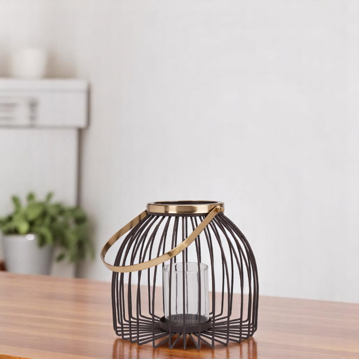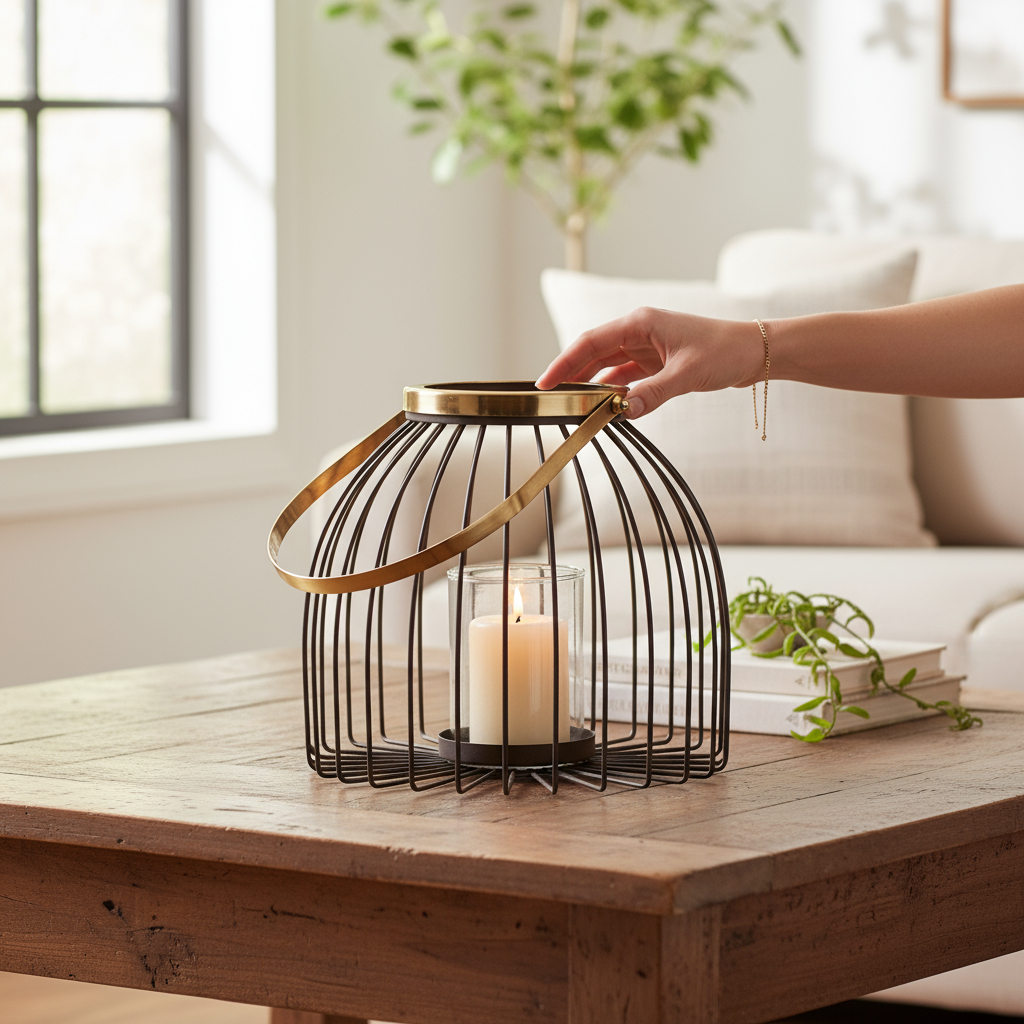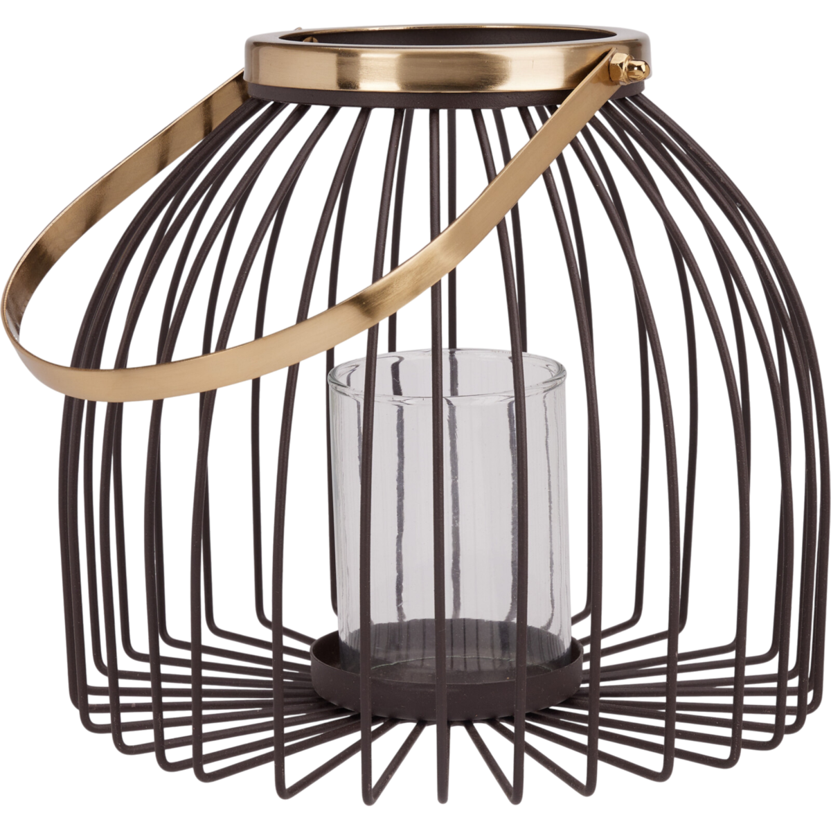 Stílusos, ketrecszerű fém lámpás üveg betéttel. Meleg, hangulatos fényt ad teraszra vagy benti dekorhoz; hordfüllel könnyen mozgatható.