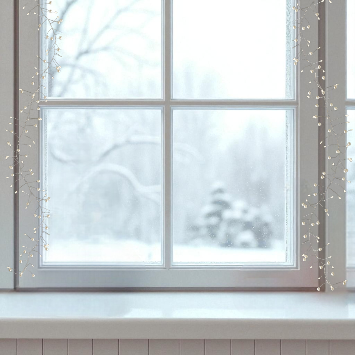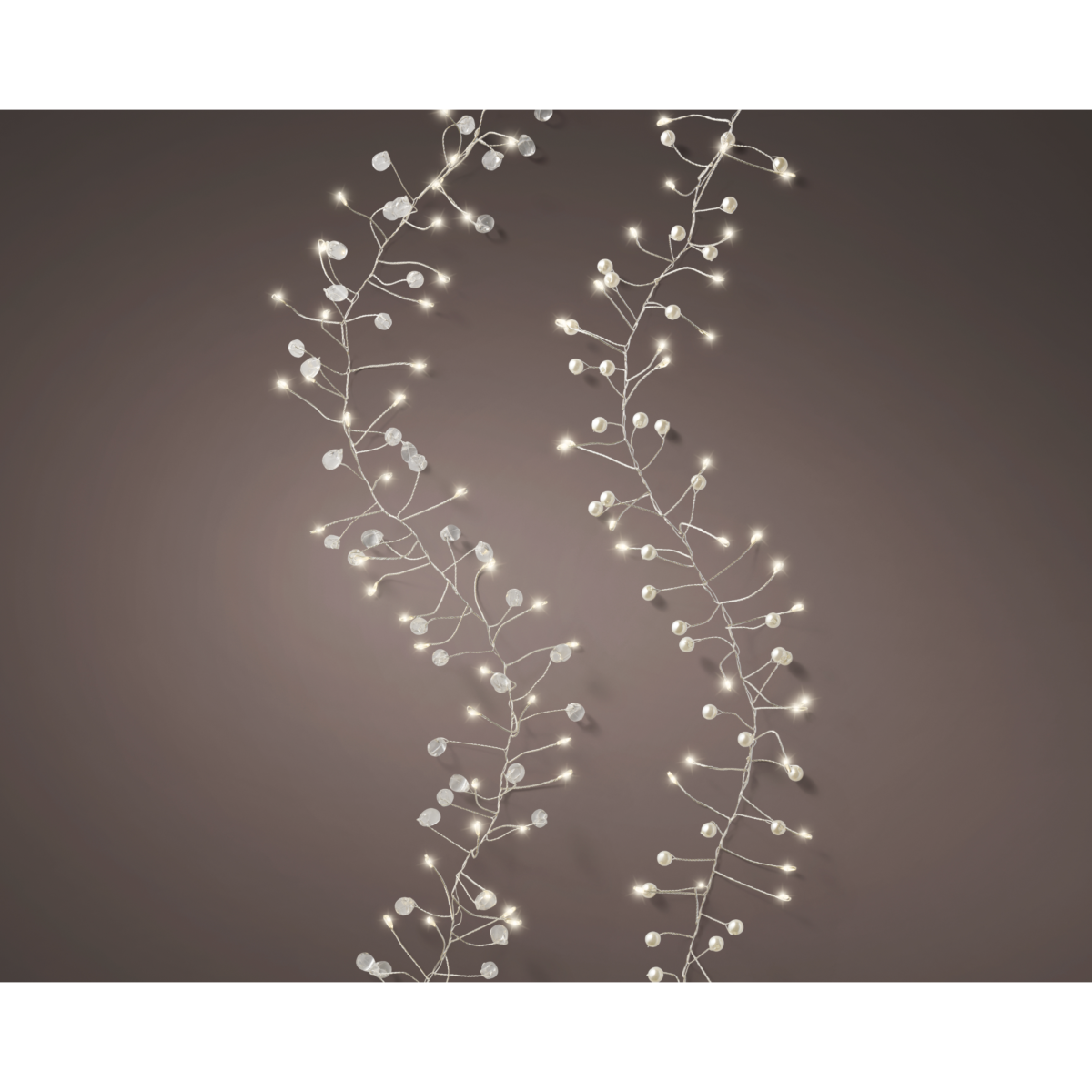 Ez a 120 cm hosszú fényfüzér egyedi kombinációja a melegfehér és hidegfehér LED-eknek, így különleges fényhatást biztosít bármely beltéri dekorációhoz. A vékony, hajlítható ágon elhelyezett 100 LED és áttetsző díszek játékos, mégis visszafogott látványt nyújtanak, akár ünnepi díszítésként, akár hangulatvilágításként használod.