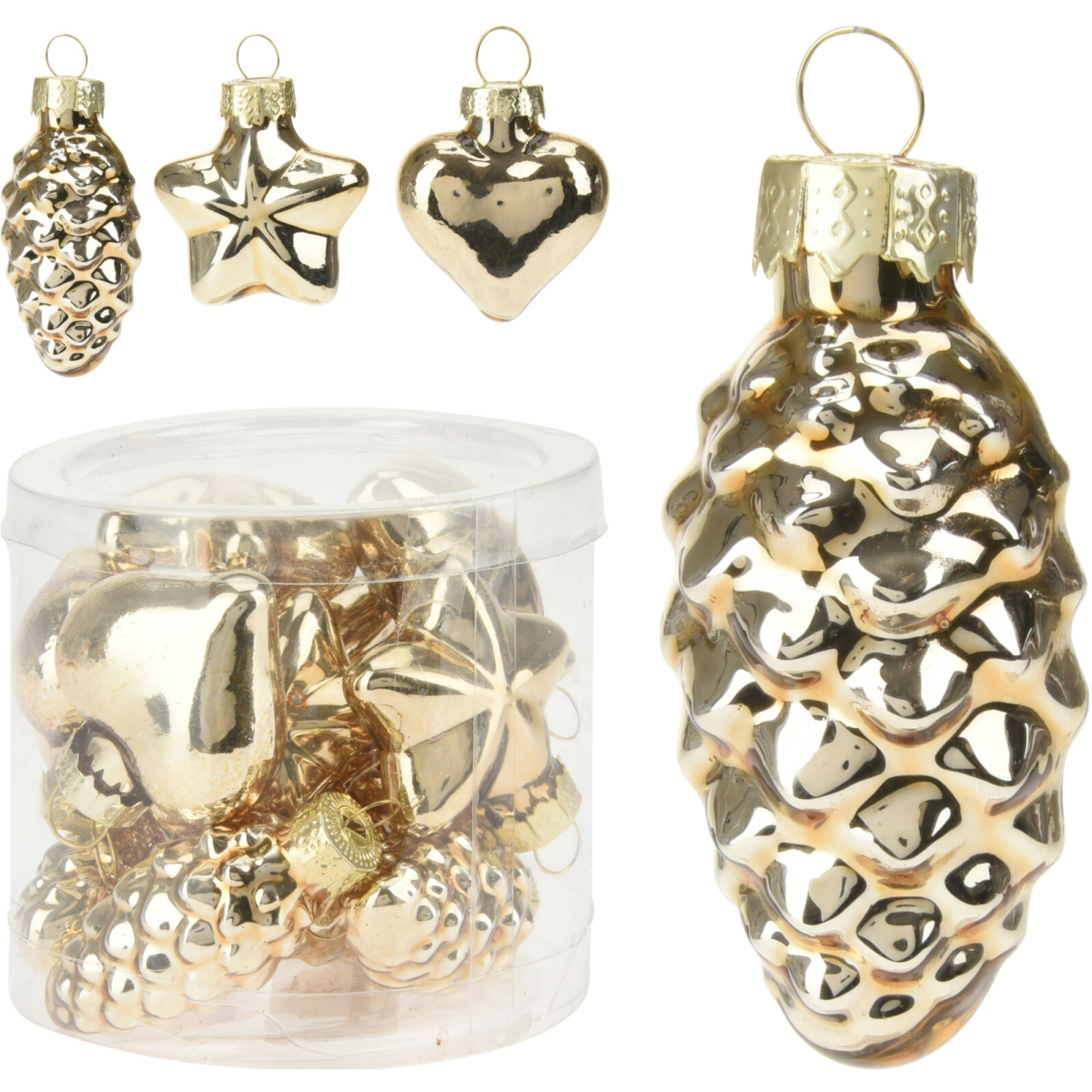 Üvegből készült, arany színű, 12 db-os függő dísz szett (4 csillag / 4 szív / 4 toboz). Ezzel a dekorációs szettel igazán egyedi hangulatúvá varázsolhatjuk karácsonyfánkat vagy akár adott helyiséget.