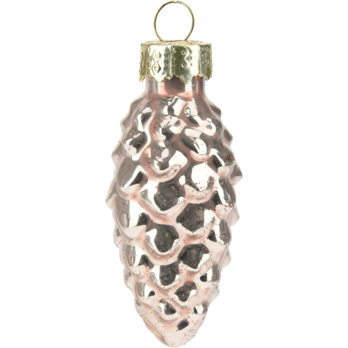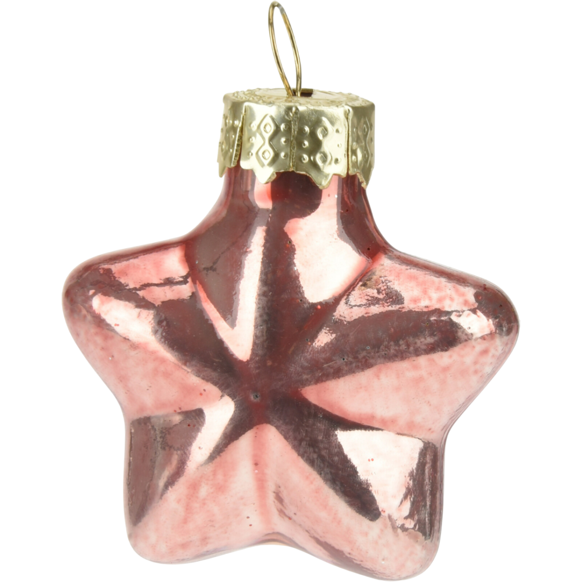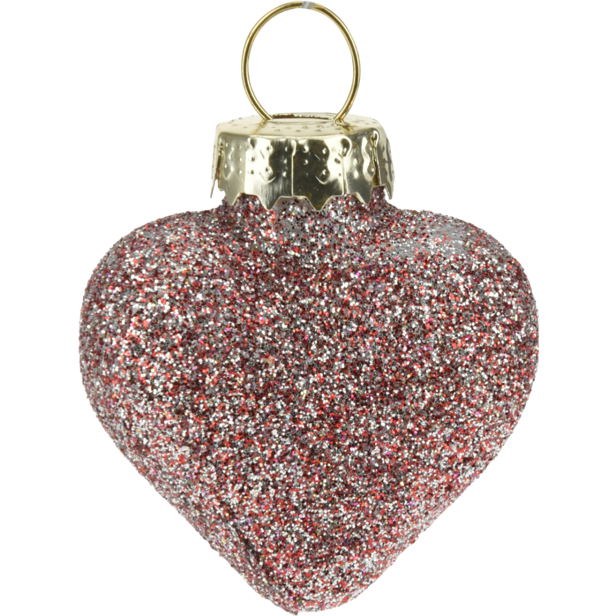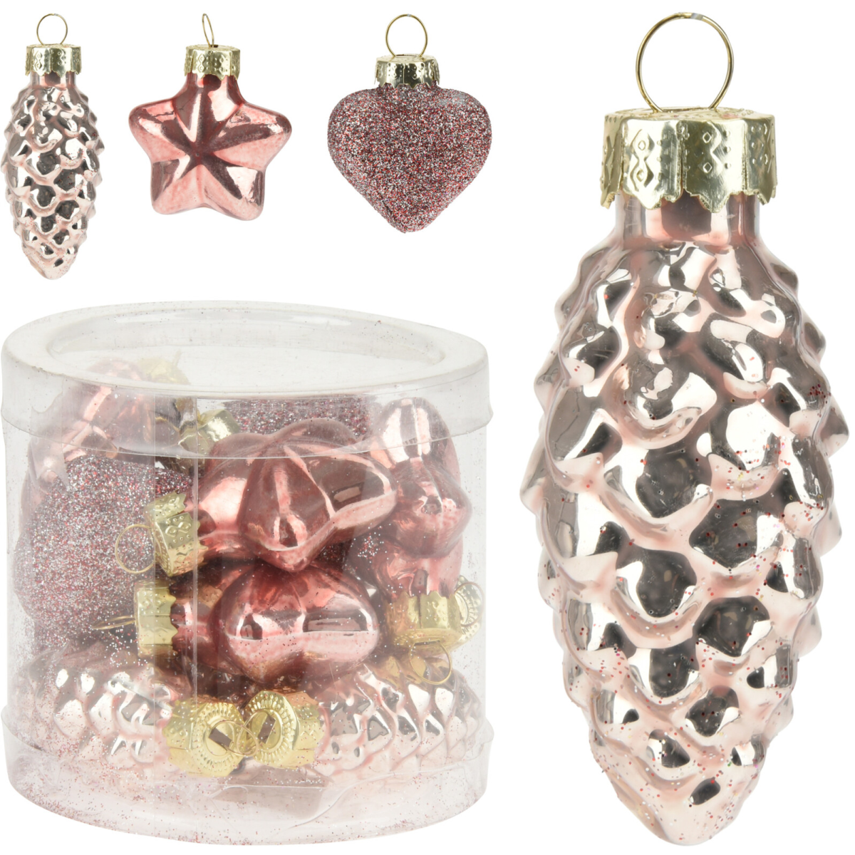 Üvegből készült 12 db-os, csillámos függő dísz szett, pink színben (4 csillag, 4 szív, 4 toboz).