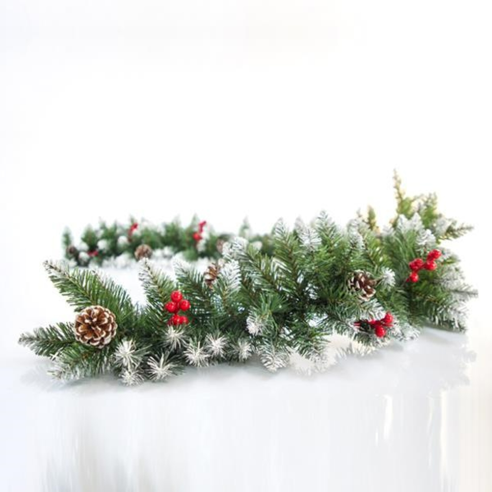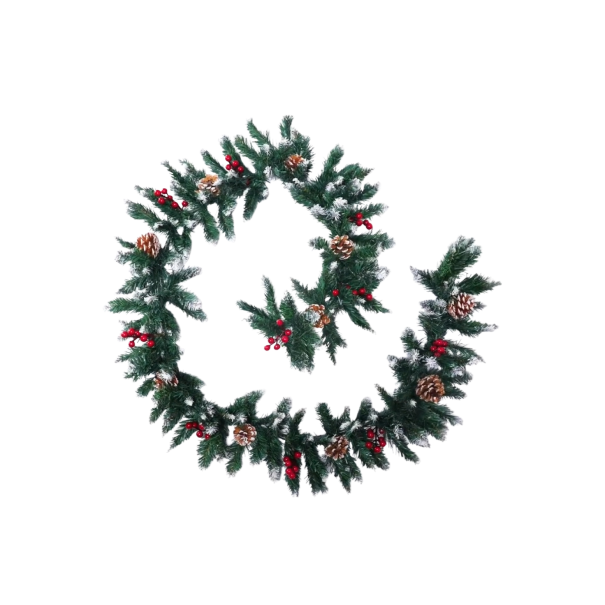 Piros bogyókkal és tobozokkal díszített fenyő girland. A természet szépségét hozza otthonába. Ideális választás karácsonyi ünnepekhez, ünnepi asztalokhoz vagy bármilyen téli díszítéshez.
