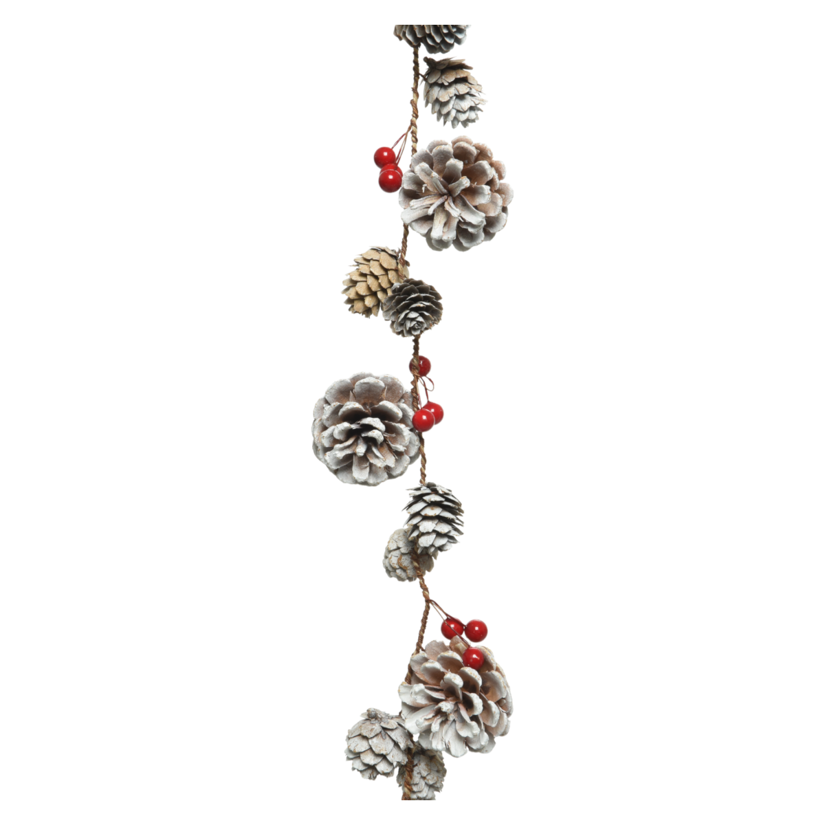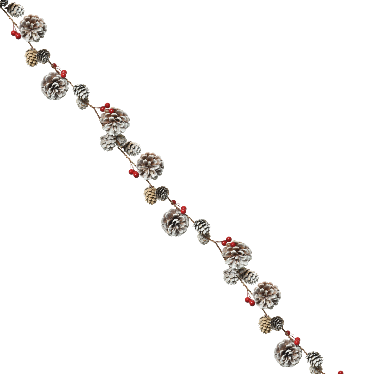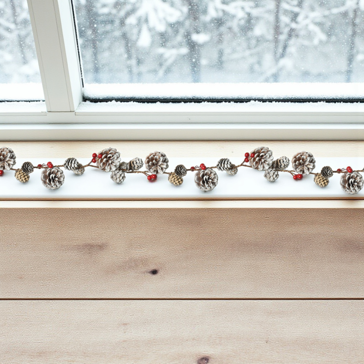 Ez a 130 cm hosszú girland tobozokkal és piros bogyós díszítéssel tökéletes választás, ha természetes, mégis látványos dekorációt keresel az ünnepi időszakra.