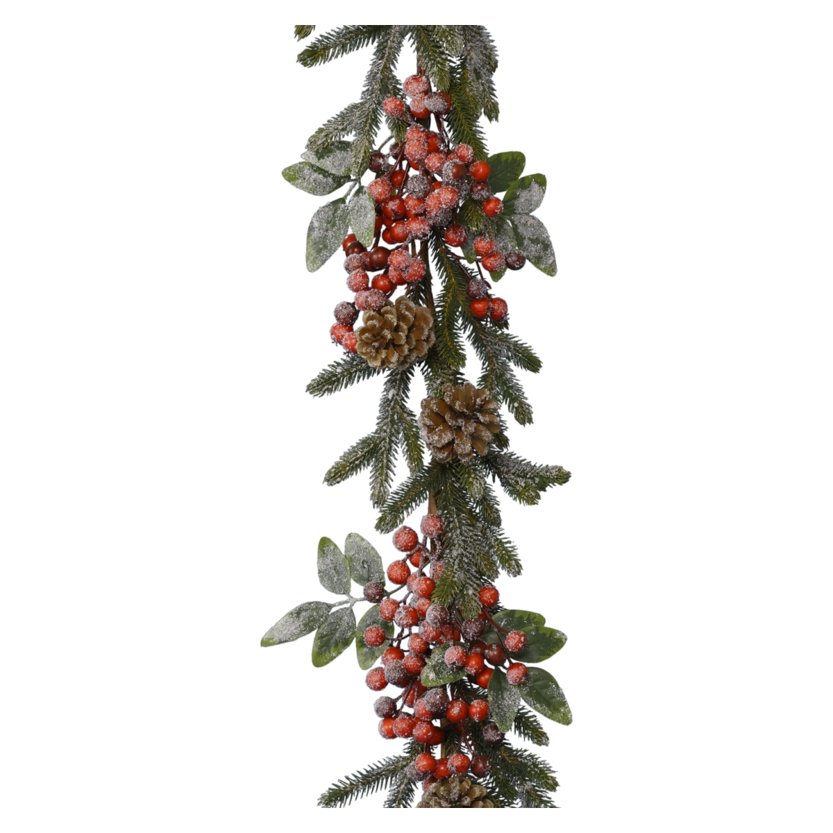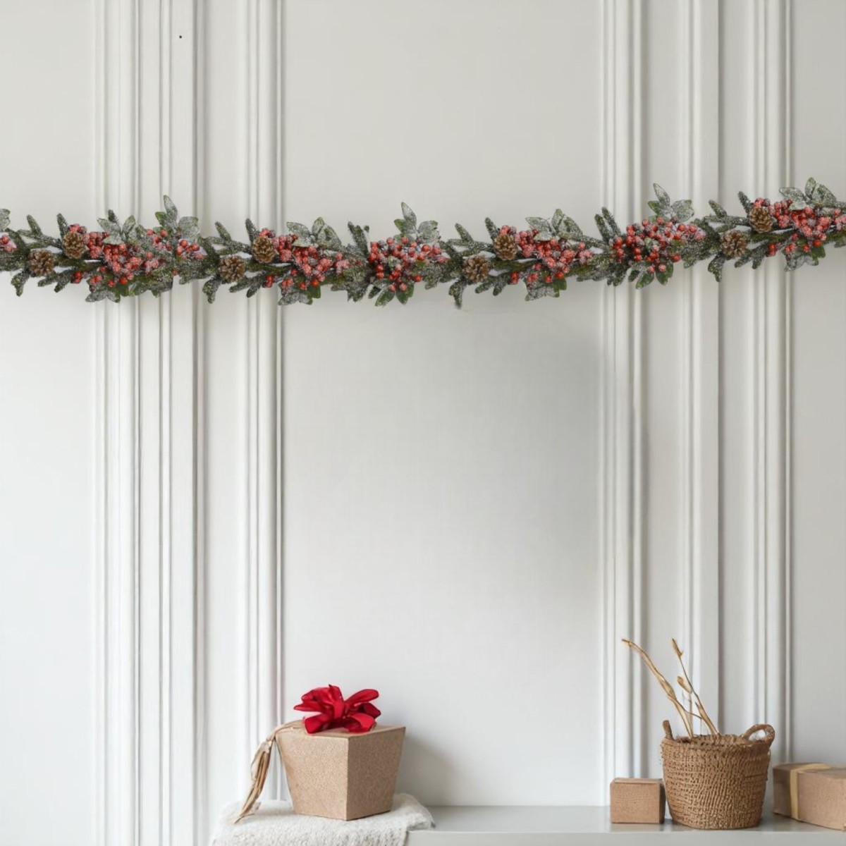Dobd fel az ünnepi hangulatot ezzel a klasszikus stílusú, természetes hatású girlanddal! A 176cm hosszúságú dísz tobozokkal és élénk piros bogyókkal díszített, így látványos, mégis ízléses kiegészítője lehet az otthonodnak az adventi és karácsonyi időszakban.