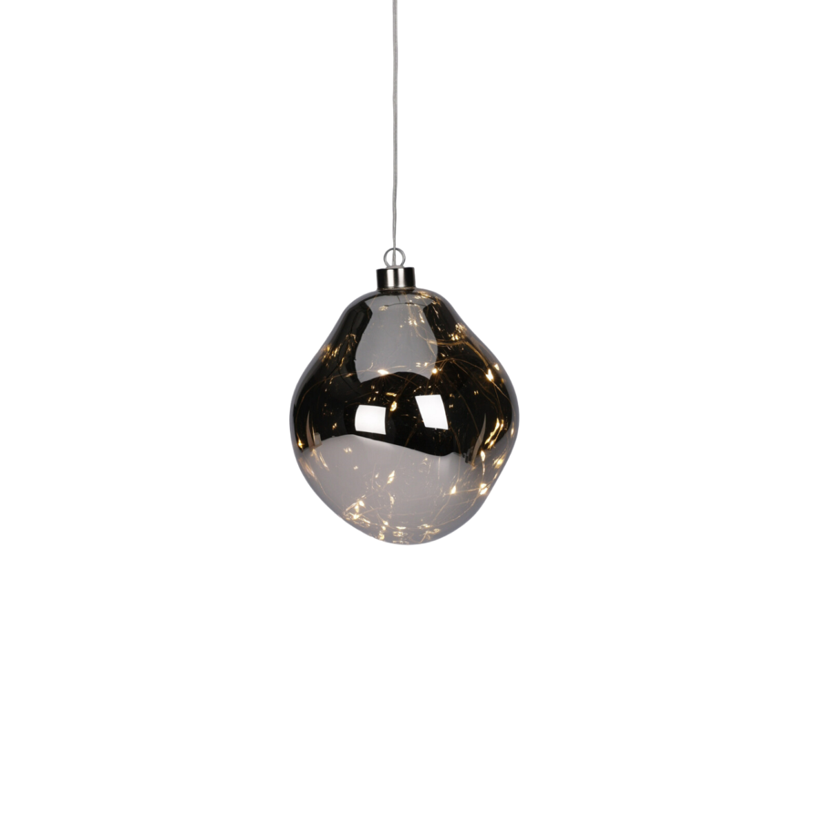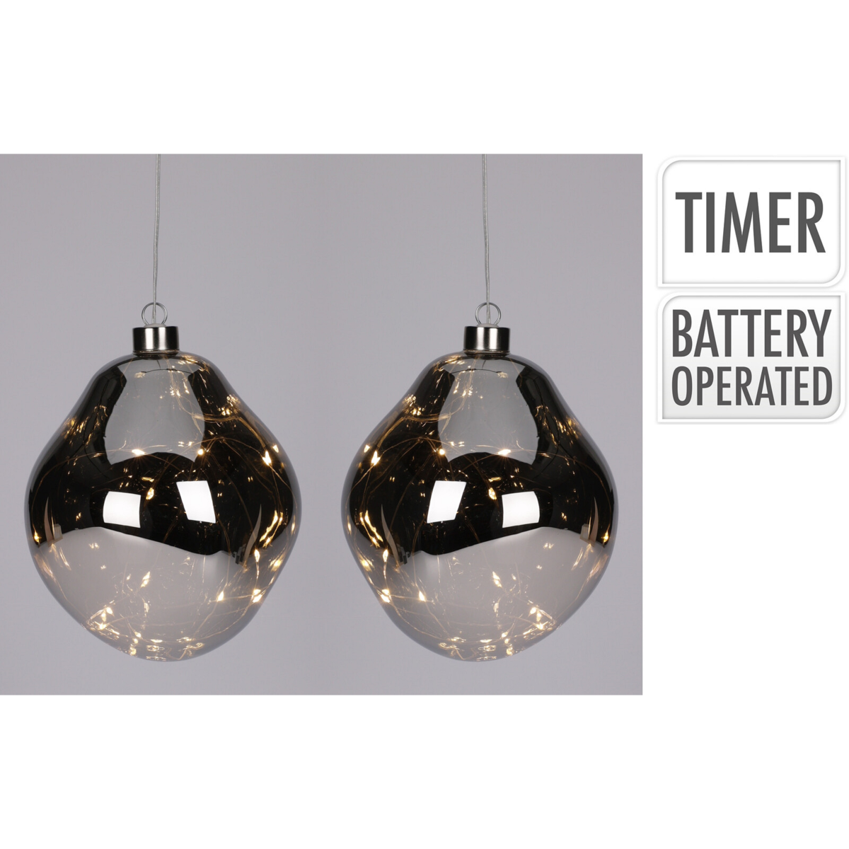 Karácsonyi hangulatú dekorációs kellék, mellyel szebbé varázsolható az otthon. Üvegből készült és a legszélesebb pontja 12 cm. 2 db AA elemmel működik, melyet nem tartalmaz a cikk. A tartókábel hossza 50 cm, egy kábelen 2 db üveg dísz található. Időzítő kapcsolóval ellátott, bekapcsolástól számított 8 órán keresztül működik, majd automatikusan lekapcsol és 16 óra múlva automatikusan visszakapcsol. Ezzel a dekorációs termékkel igazán egyedi hangulatot varázsolhatunk adott helyiségben.