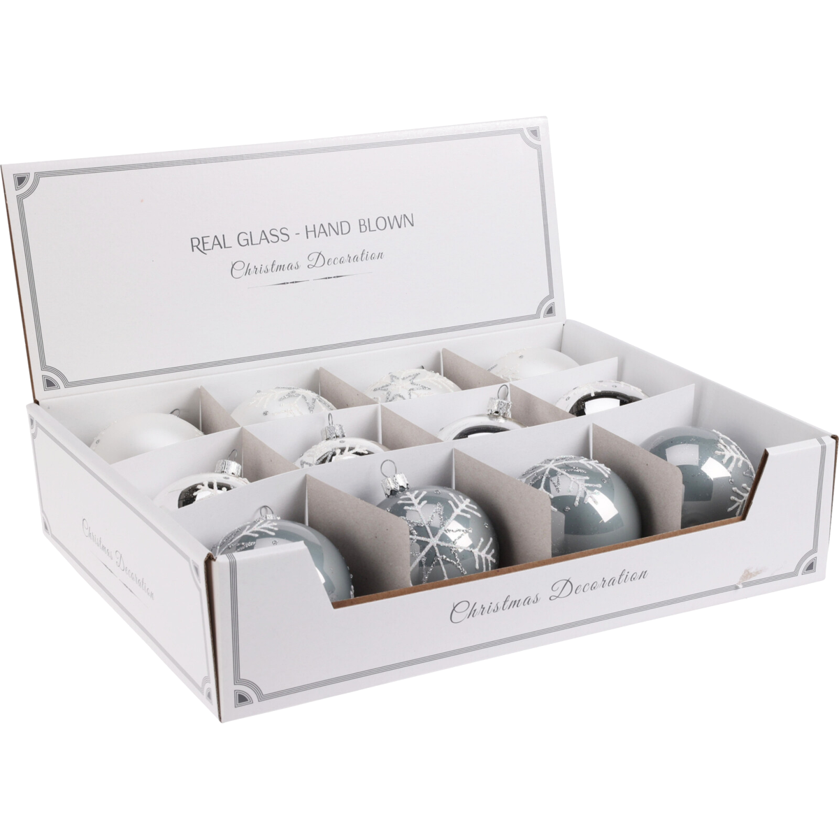 A termék egy elegáns üveg gömb dísz, melynek méretei 8x8x8 cm. Háromféle kivitelben érhető el: matt ezüst, matt fehér és fényes szürke, így tökéletesen illeszkedik a modern vagy hagyományos karácsonyi dekorációkhoz. Az üvegből készült díszek nemcsak szépségükkel, hanem tartósságukkal is kiemelkednek, és minden karácsonyfát különlegessé varázsolnak.