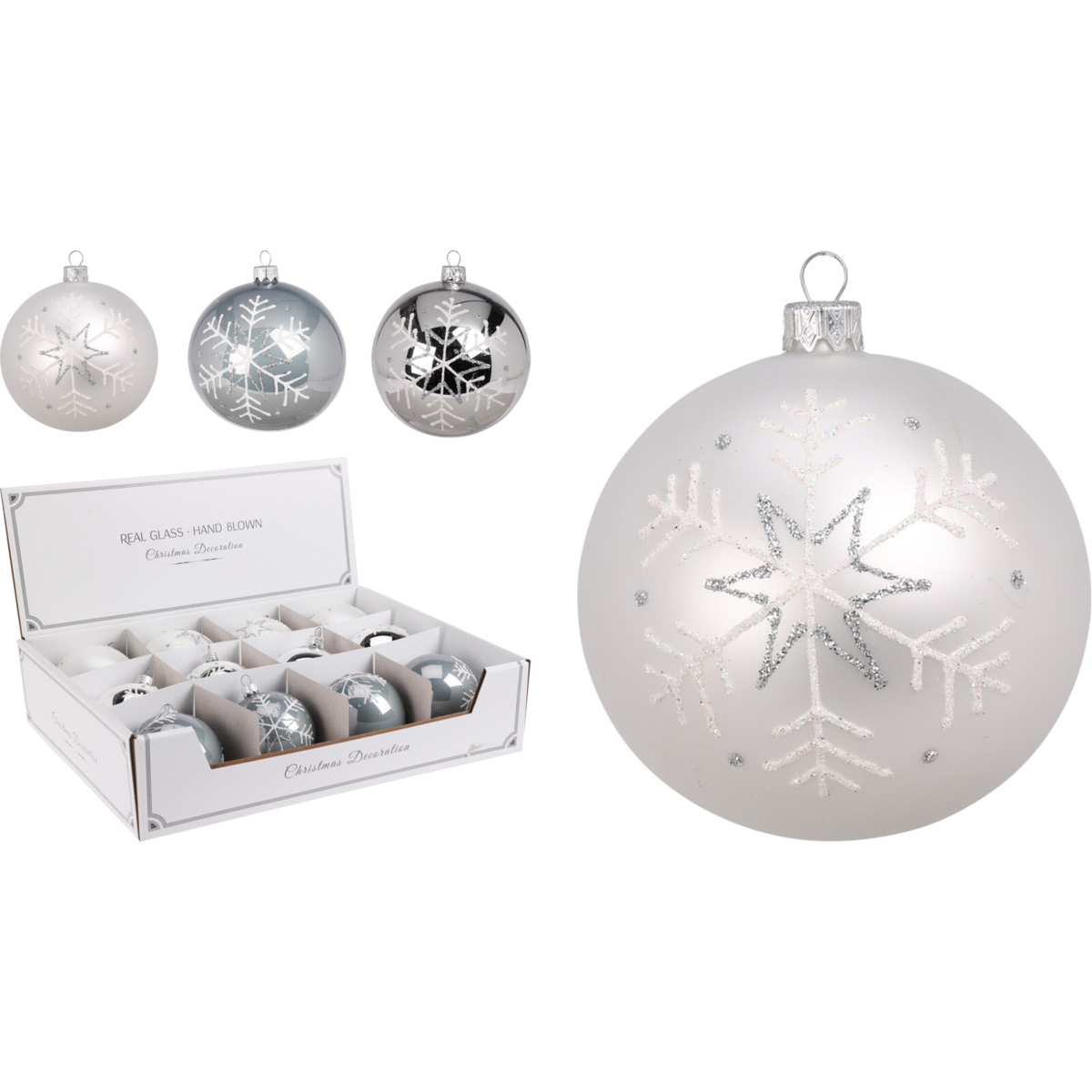 GÖMB DÍSZ ÜVEG 8X8X8CM 3 FÉLE MATT EZÜST, MATT FEHÉR, FÉNYES SZÜRKE