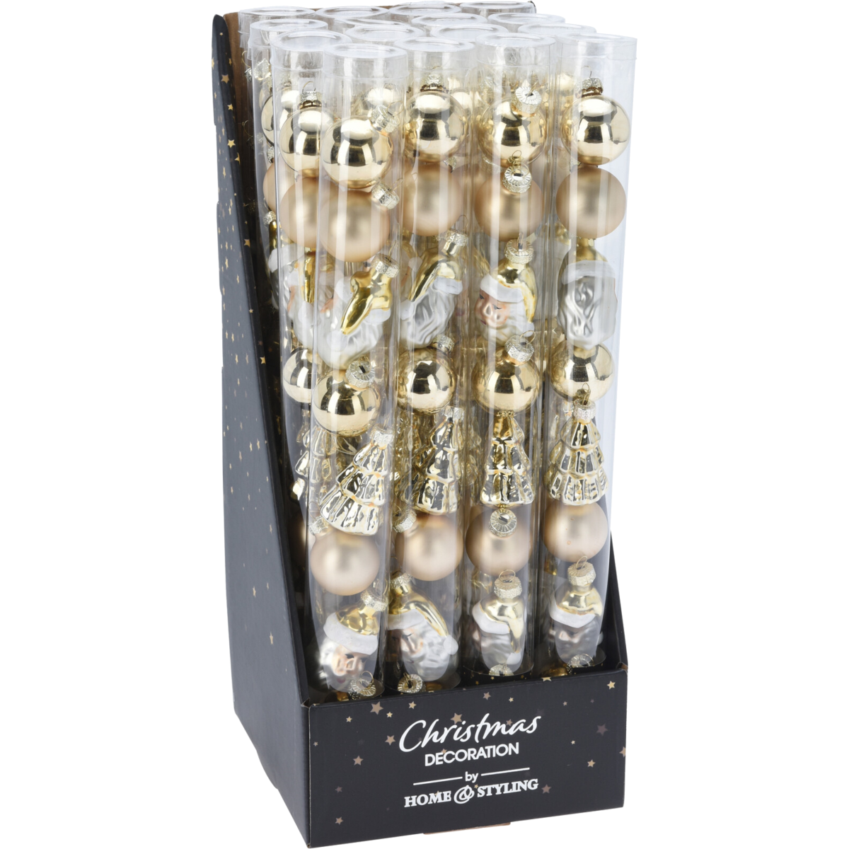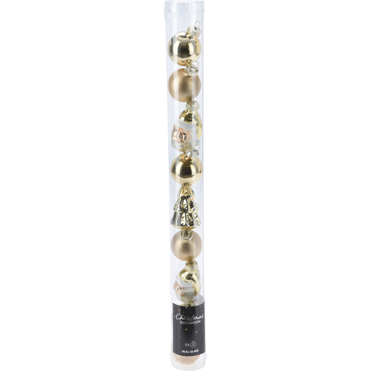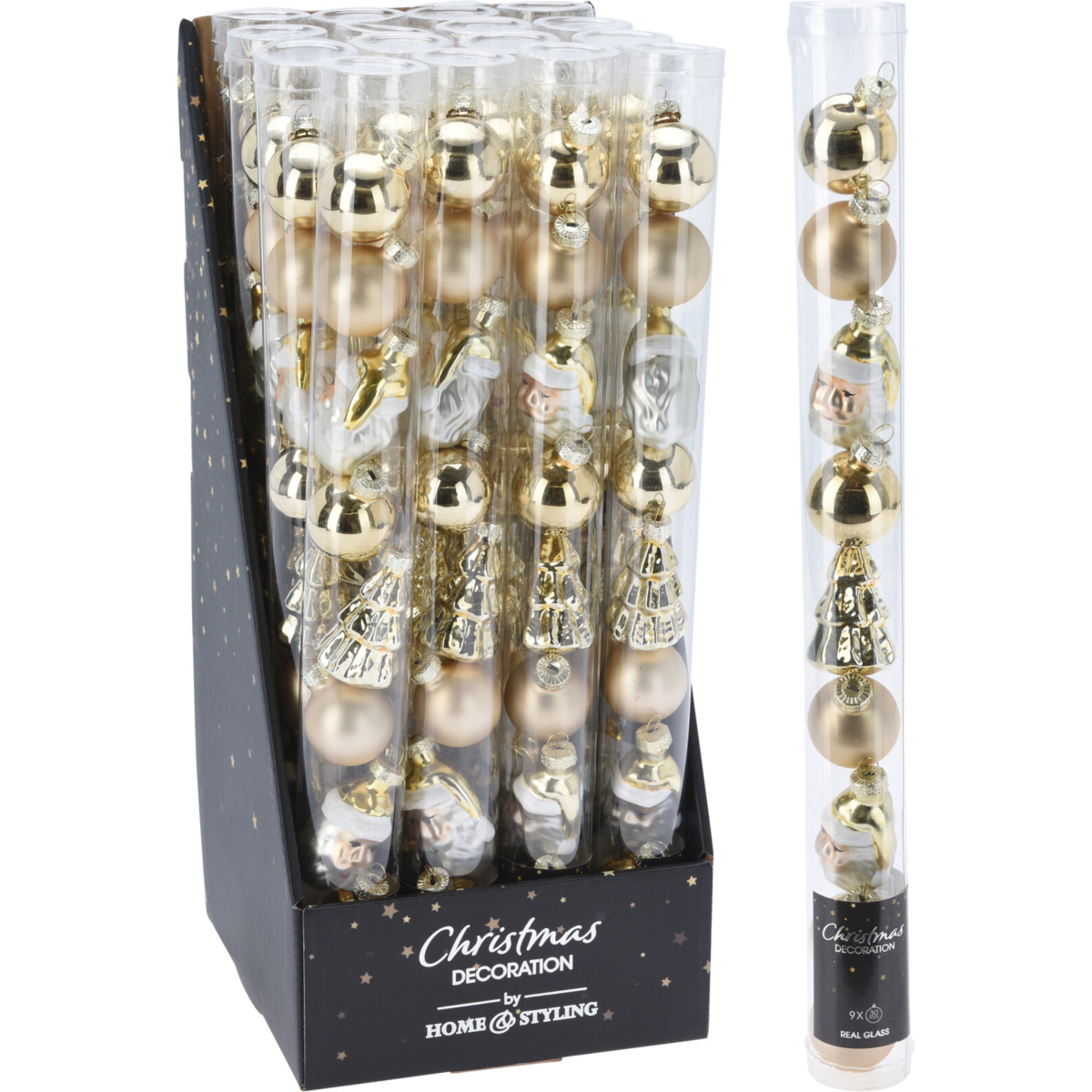 A termék egy elegáns díszkészlet, amely magában foglal hat arany színű, üvegből készült gömböt és három különböző figurát (2 db mikulást és egy fenyőfát). A gömbök méretei tökéletesen alkalmasak karácsonyfa vagy egyéb ünnepi dekoráció díszítésére. A szettben található figurák különleges hangulatot kölcsönöznek bármilyen dekorációs koncepciónak, legyen szó modern vagy hagyományos stílusról. Ez a szett nemcsak dekoratív, hanem praktikus is, hiszen könnyen tárolható és több évadon át is felhasználható.