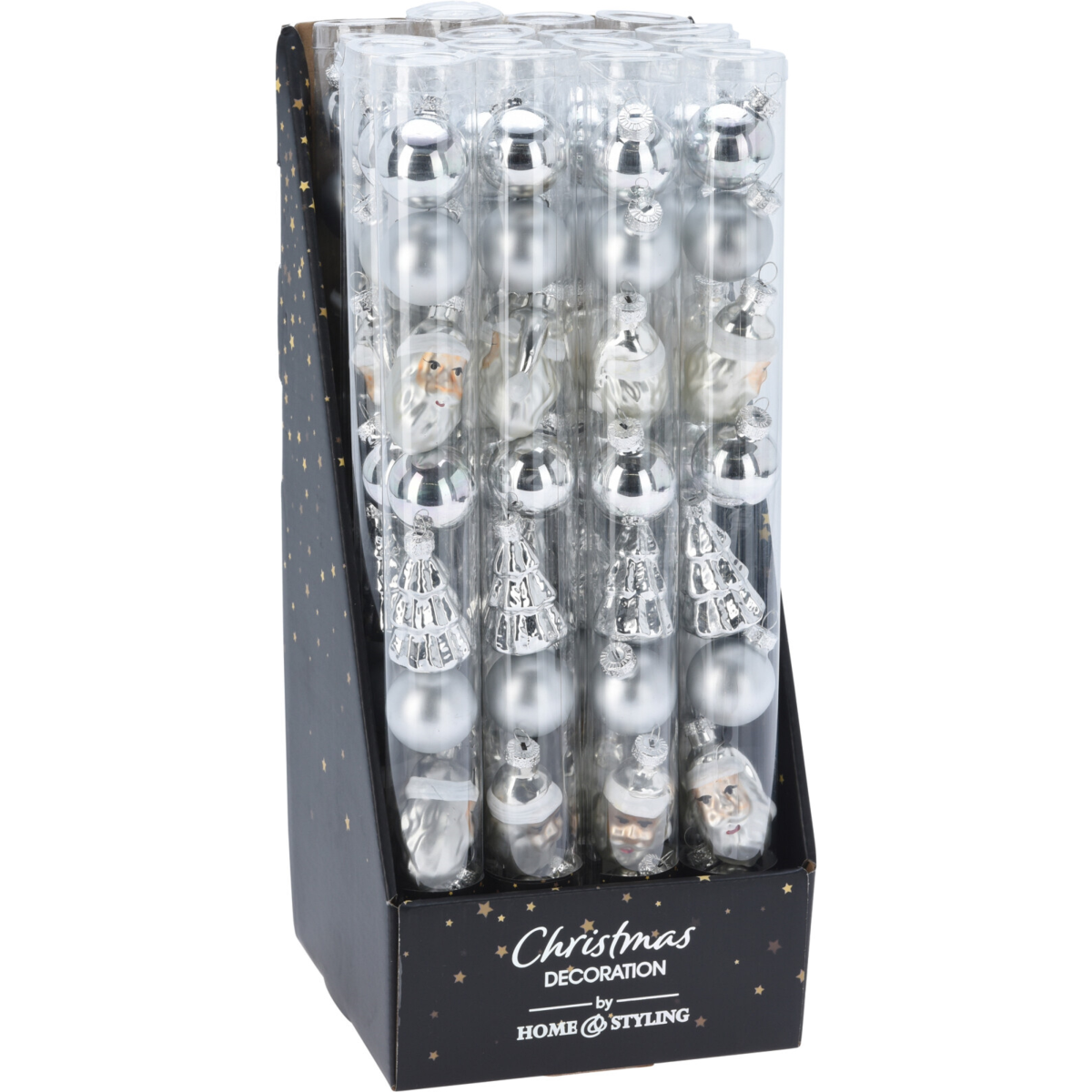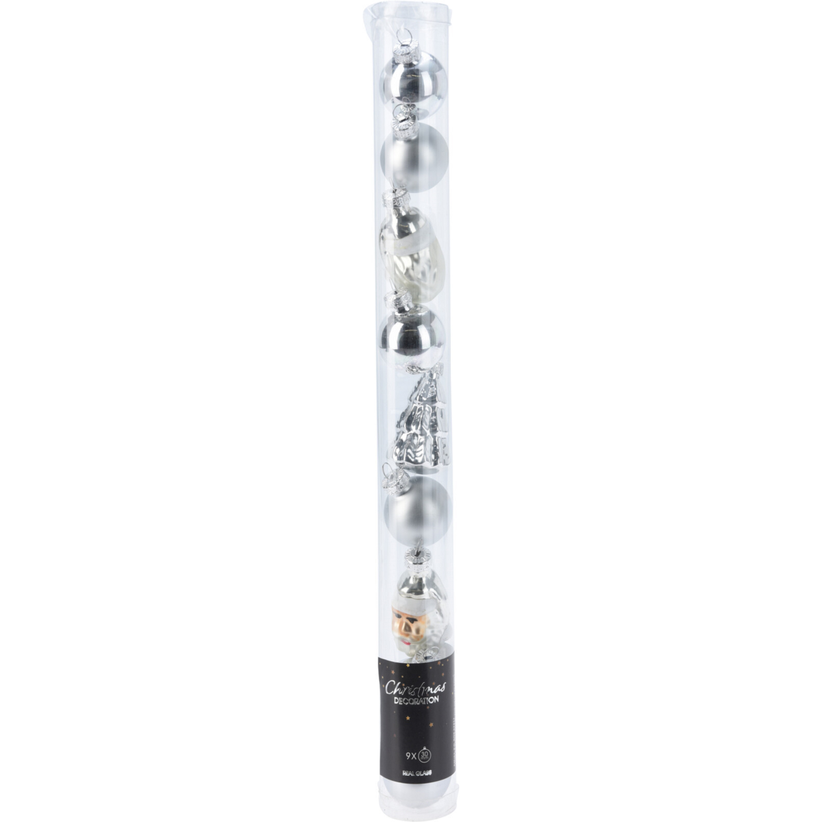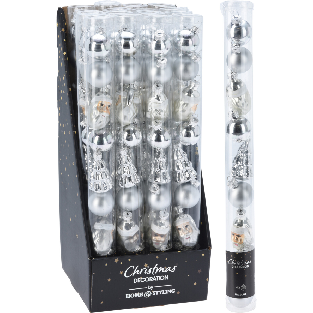 A termék egy elegáns díszkészlet, amely magában foglal hat ezüst színű, üvegből készült gömböt és három különböző figurát (2 db mikulást és egy fenyőfát). A gömbök méretei tökéletesen alkalmasak karácsonyfa vagy egyéb ünnepi dekoráció díszítésére. A szettben található figurák különleges hangulatot kölcsönöznek bármilyen dekorációs koncepciónak, legyen szó modern vagy hagyományos stílusról. Ez a szett nemcsak dekoratív, hanem praktikus is, hiszen könnyen tárolható és több évadon át is felhasználható.