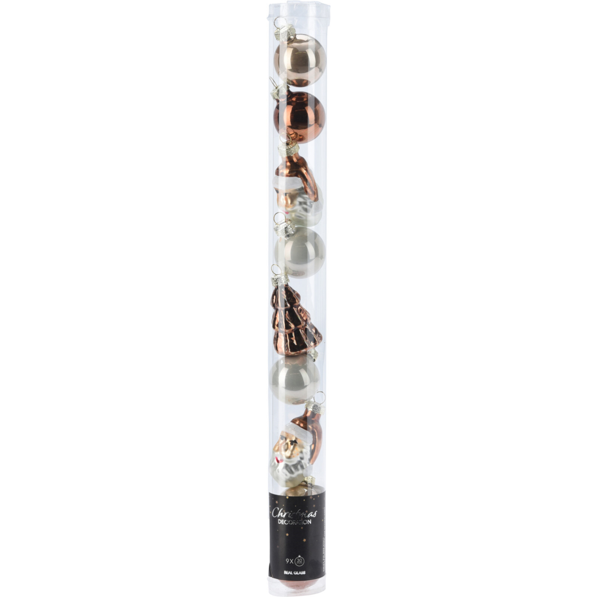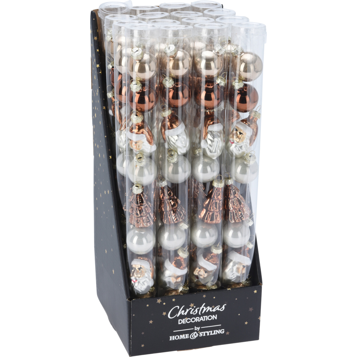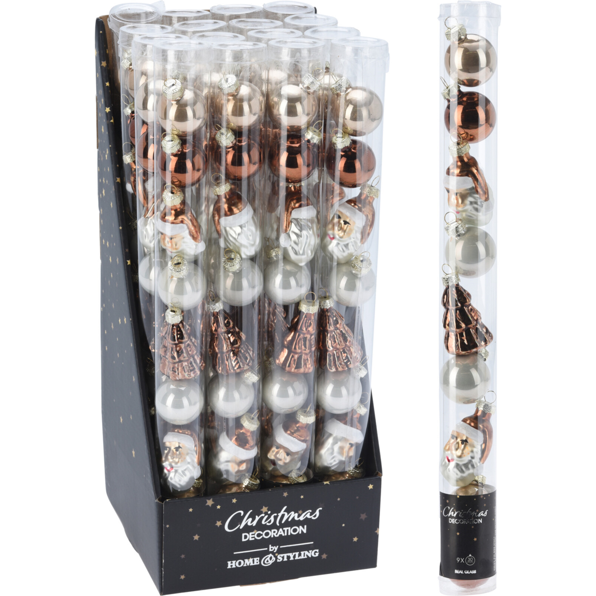 A termék egy elegáns díszkészlet, amely magában foglal hat kávé színű, üvegből készült gömböt és három különböző figurát (2 db mikulást és egy fenyőfát). A gömbök méretei tökéletesen alkalmasak karácsonyfa vagy egyéb ünnepi dekoráció díszítésére. A szettben található figurák különleges hangulatot kölcsönöznek bármilyen dekorációs koncepciónak, legyen szó modern vagy hagyományos stílusról. Ez a szett nemcsak dekoratív, hanem praktikus is, hiszen könnyen tárolható és több évadon át is felhasználható.