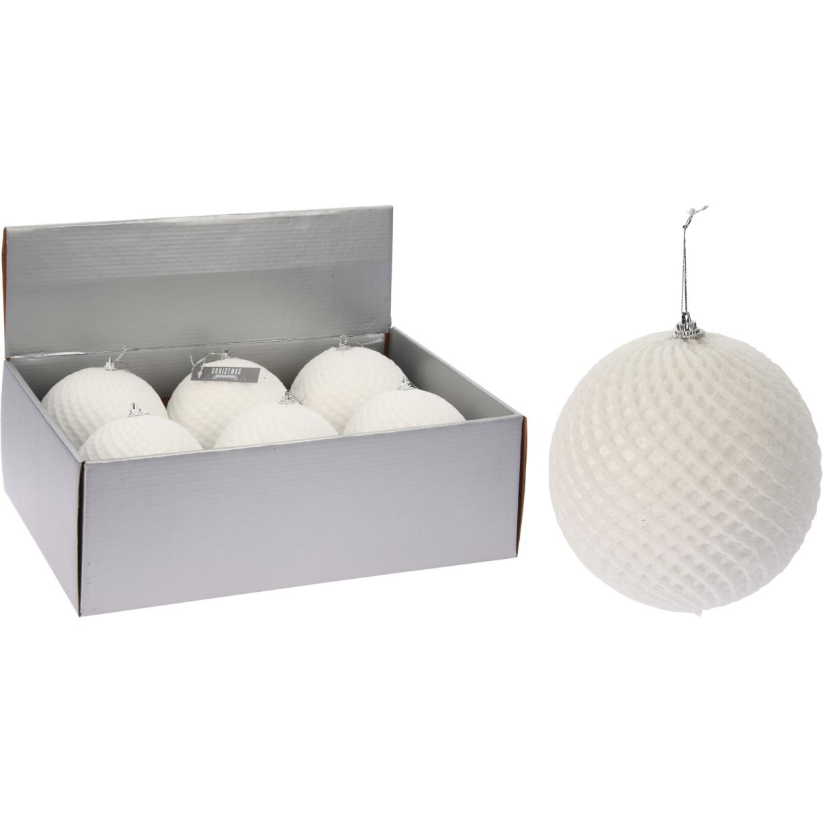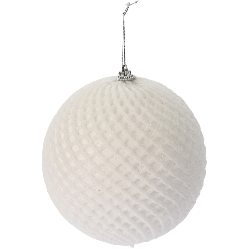 Polisztirén gömb fehér színben, glitteres, 12 cm-es átmérővel.
