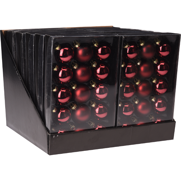 15 darabos üveggömb dísz szett, burgundi színű, arany akasztóval.. 5 db matt és 10 db fényes fekete átlátszó fedelű dobozban. Minden gömb mérete 45 mm.