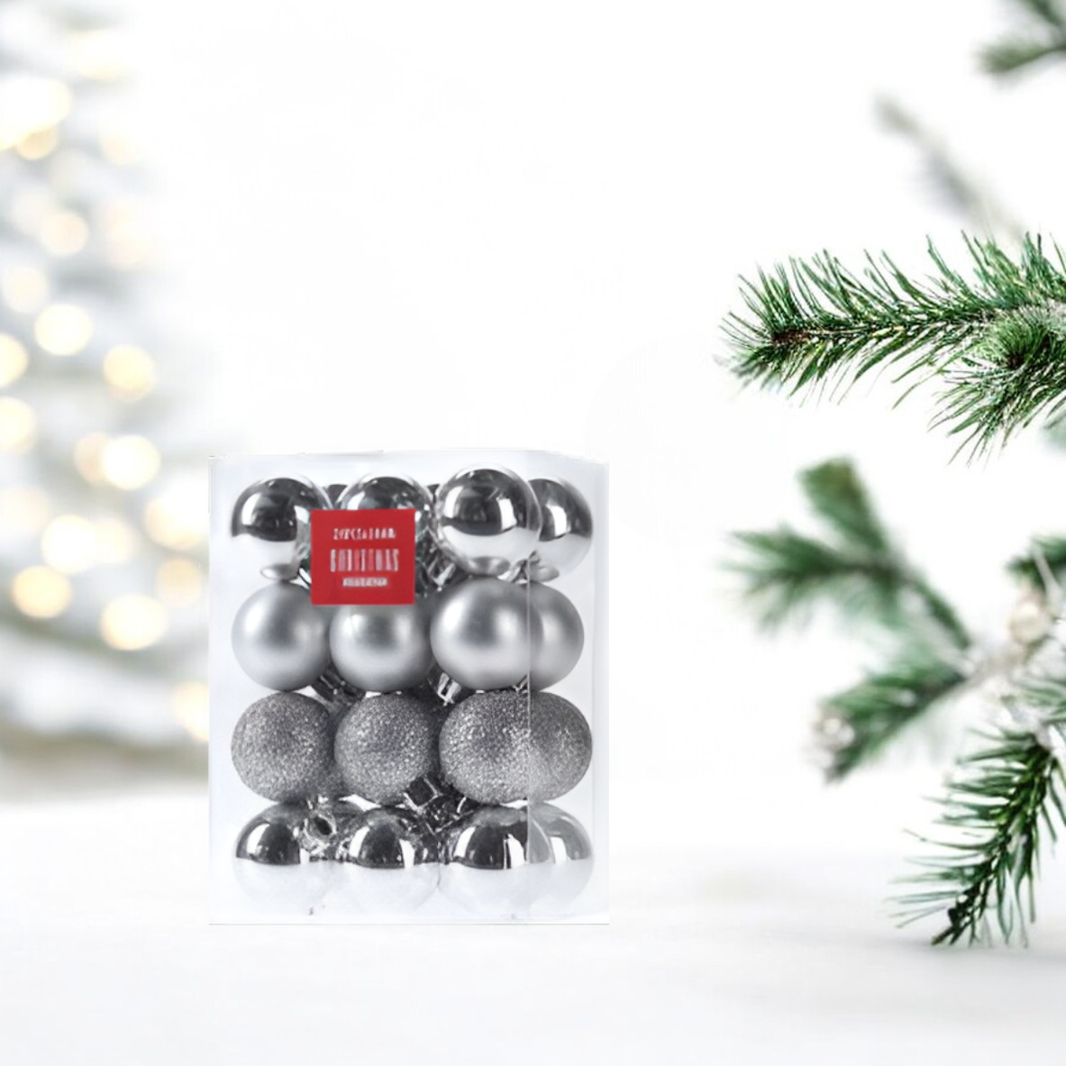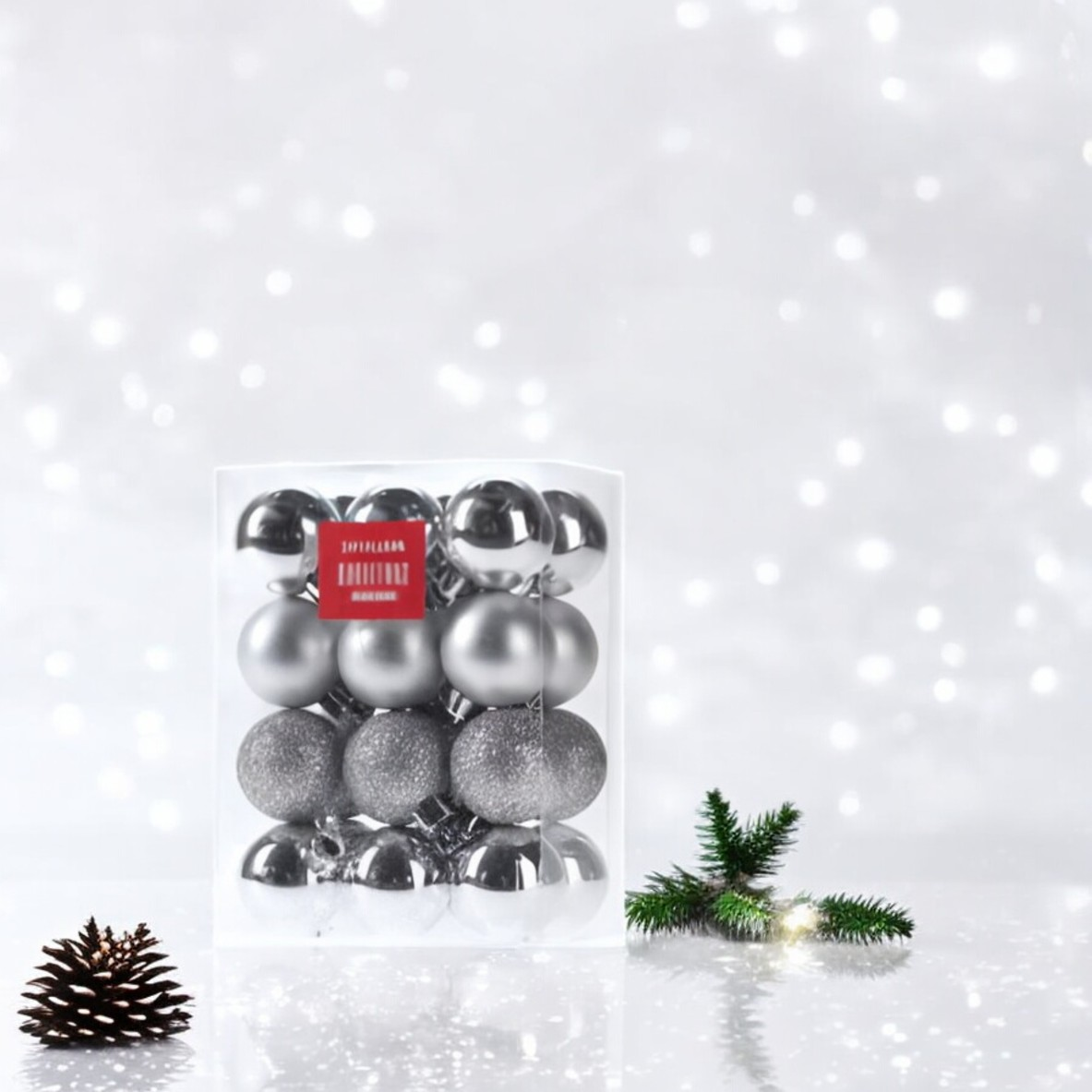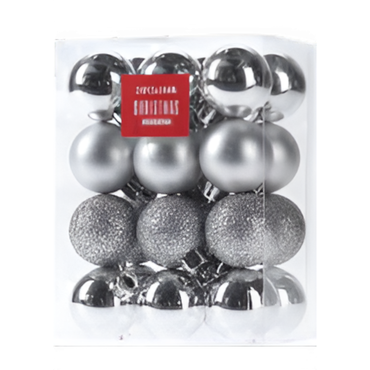Műanyagból készült 24 darabos 3 cm-es gömb szett ezüst színben. A szett tartalma: 12 db fényes, 6 db matt, 6 db glitteres. Ezzel a gömb szettel biztosan egyedivé varázsolhatjuk karácsonyfánkat vagy adott helyiséget.