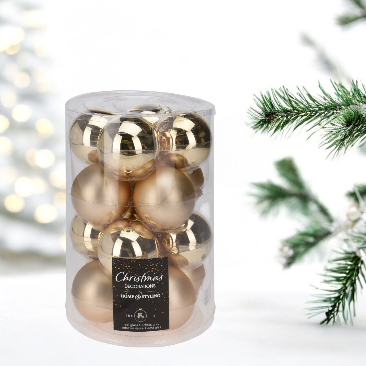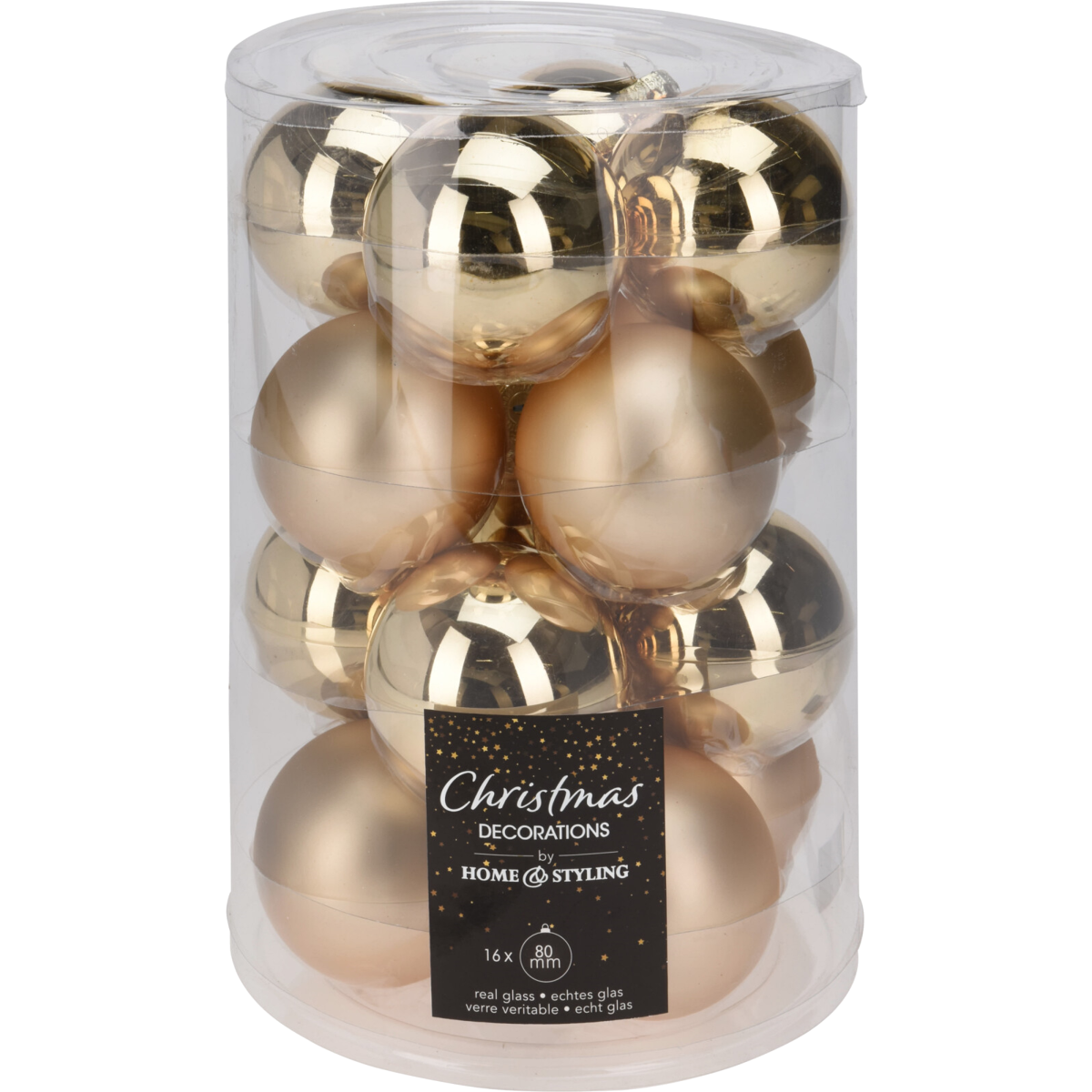 Ez a 16 darabos díszgömb készlet, amelynek anyaga üveg, tökéletes választás az ünnepi dekorációhoz. A készlet tartalmaz 8 fényes és 8 matt felületű gömböt, mindegyik 80 mm átmérőjű, így variálhatja a fények és textúrák játékát. Az arany színű gömbök eleganciát és melegséget visznek otthona díszítésébe, ideálisak a karácsonyfa vagy egyéb ünnepi dekorációk kiegészítésére. A különböző felületek kombinációja lehetővé teszi, hogy egyedi és figyelemfelkeltő látványt hozzon létre.