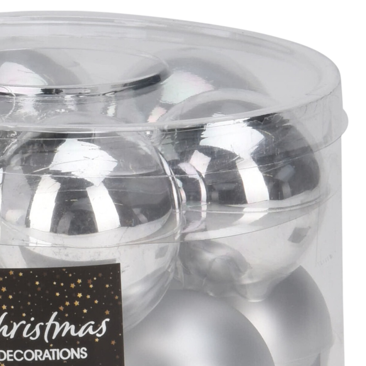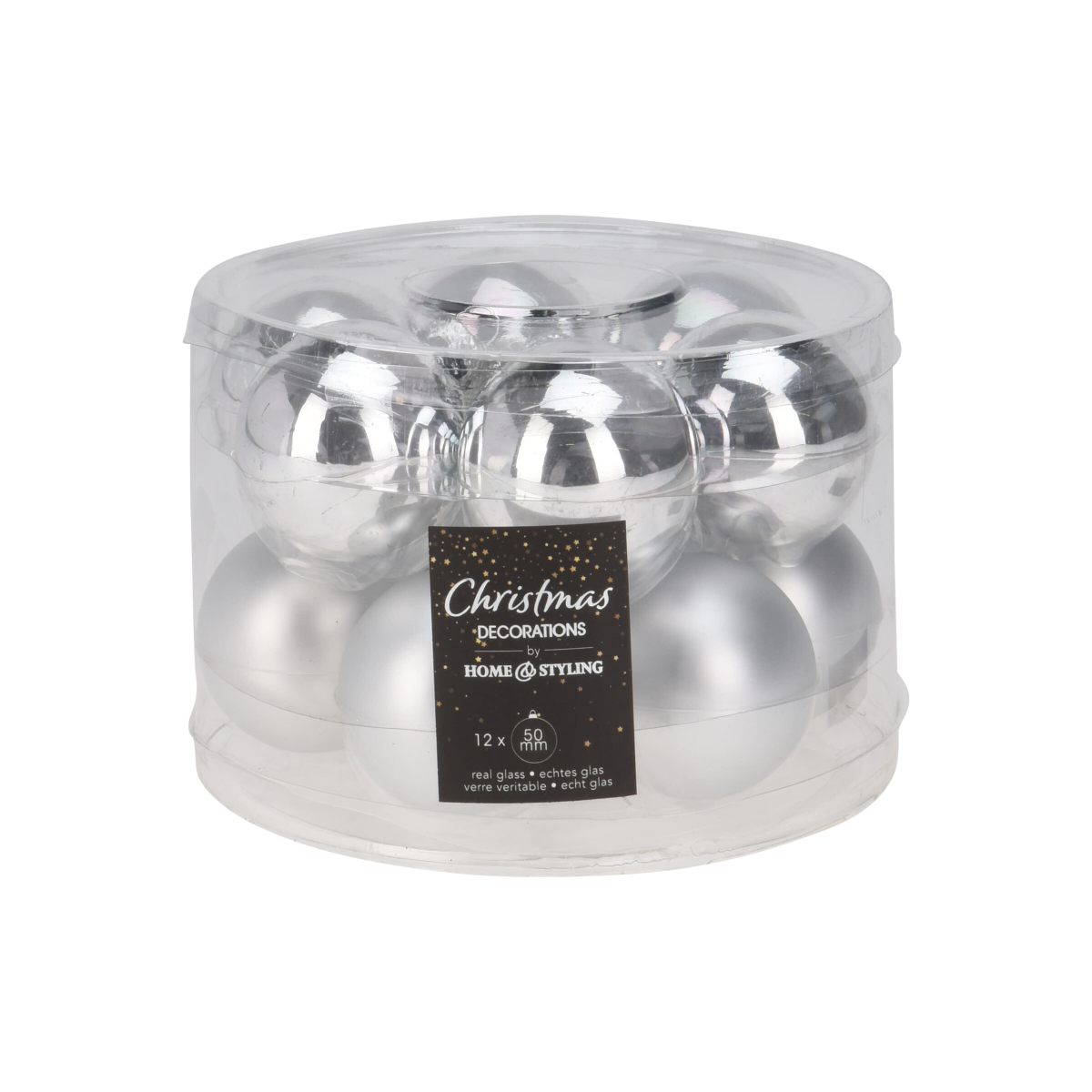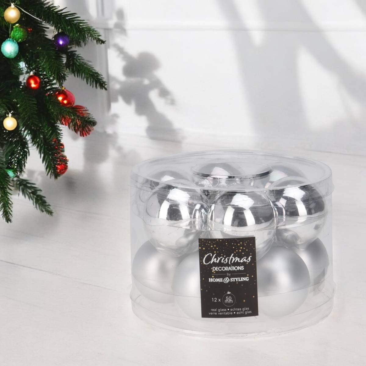 Ez a 12 darabos díszgömb készlet, amelynek anyaga üveg, tökéletes választás az ünnepi dekorációhoz. A készlet tartalmaz 6 fényes és 6 matt felületű gömböt, mindegyik 50 mm átmérőjű, így variálhatja a fények és textúrák játékát. Az ezüst színű gömbök eleganciát és stílust visznek otthona díszítésébe, ideálisak a karácsonyfa vagy egyéb ünnepi dekorációk kiegészítésére. A különböző felületek kombinációja lehetővé teszi, hogy egyedi és figyelemfelkeltő látványt hozzon létre.