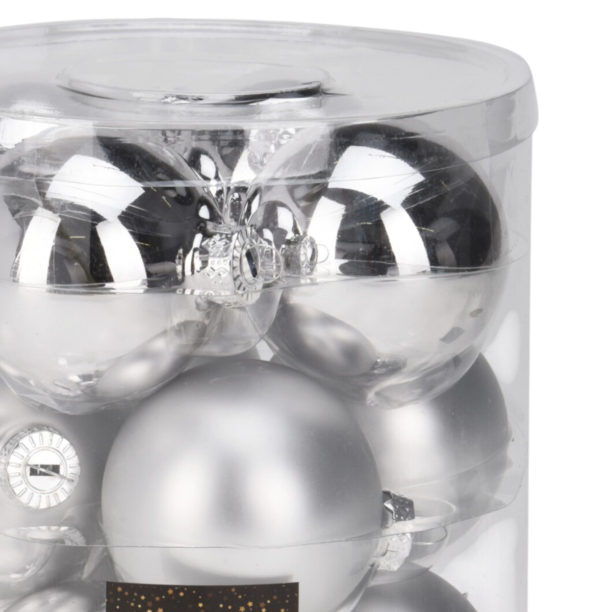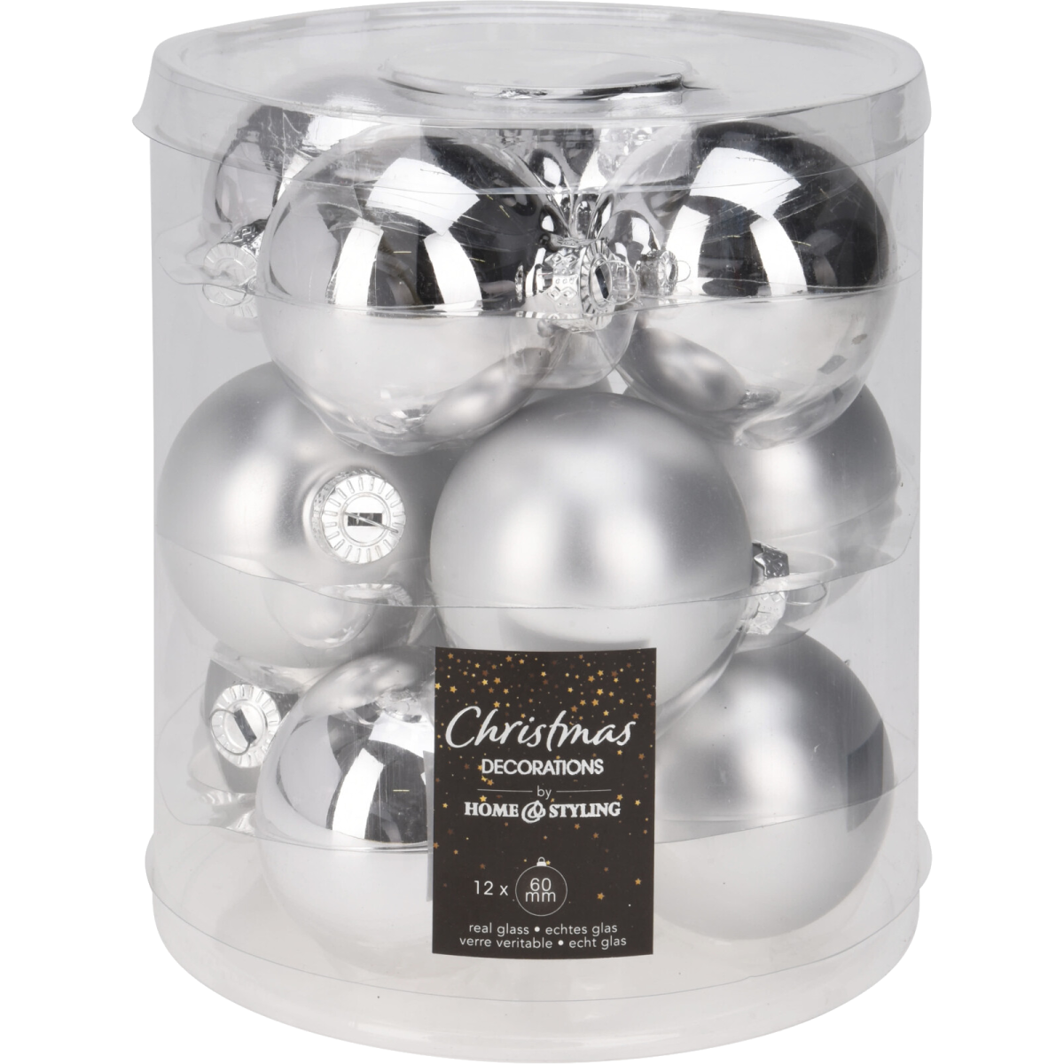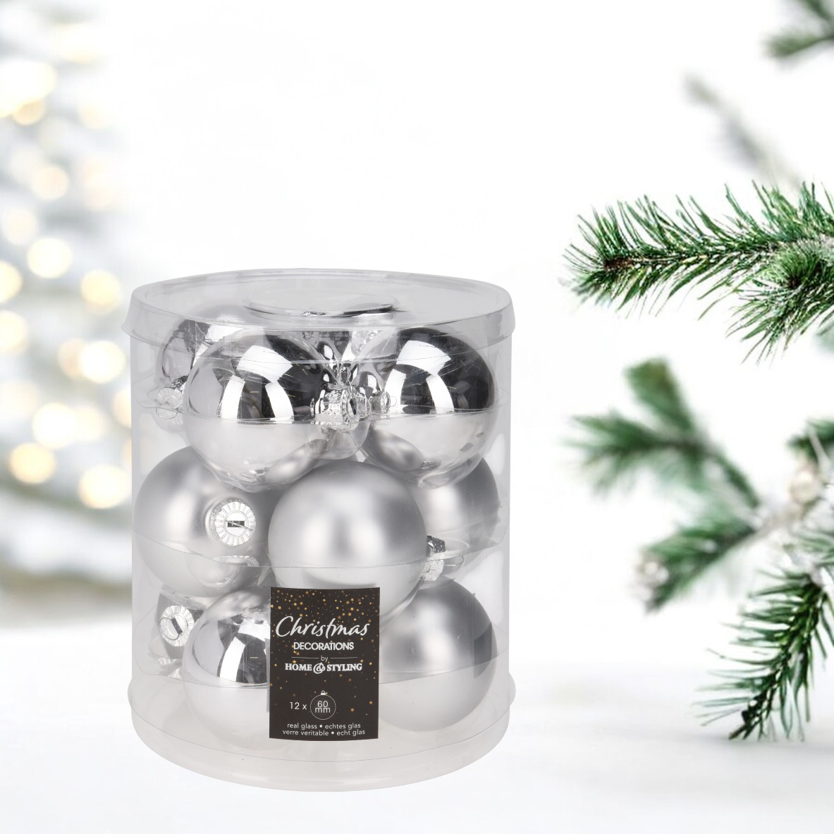 Ez a 12 darabos díszgömb készlet, amelynek anyaga üveg, tökéletes választás az ünnepi dekorációhoz. A készlet tartalmaz 6 fényes és 6 matt felületű gömböt, mindegyik 60 mm átmérőjű, így variálhatja a fények és textúrák játékát. Az ezüst színű gömbök eleganciát és stílust visznek otthona díszítésébe, ideálisak a karácsonyfa vagy egyéb ünnepi dekorációk kiegészítésére. A különböző felületek kombinációja lehetővé teszi, hogy egyedi és figyelemfelkeltő látványt hozzon létre.