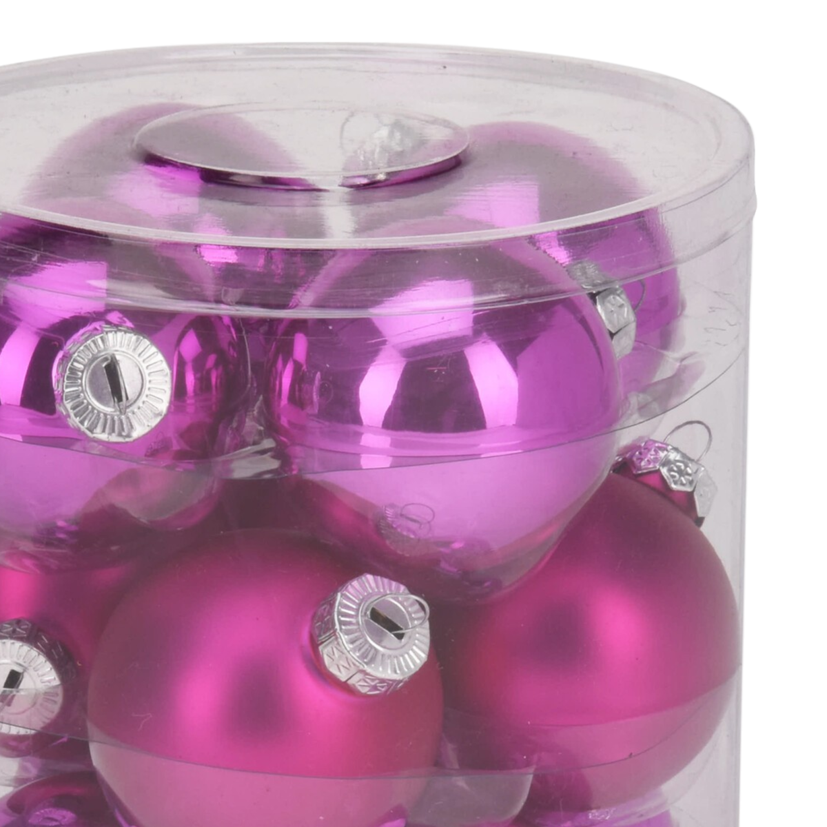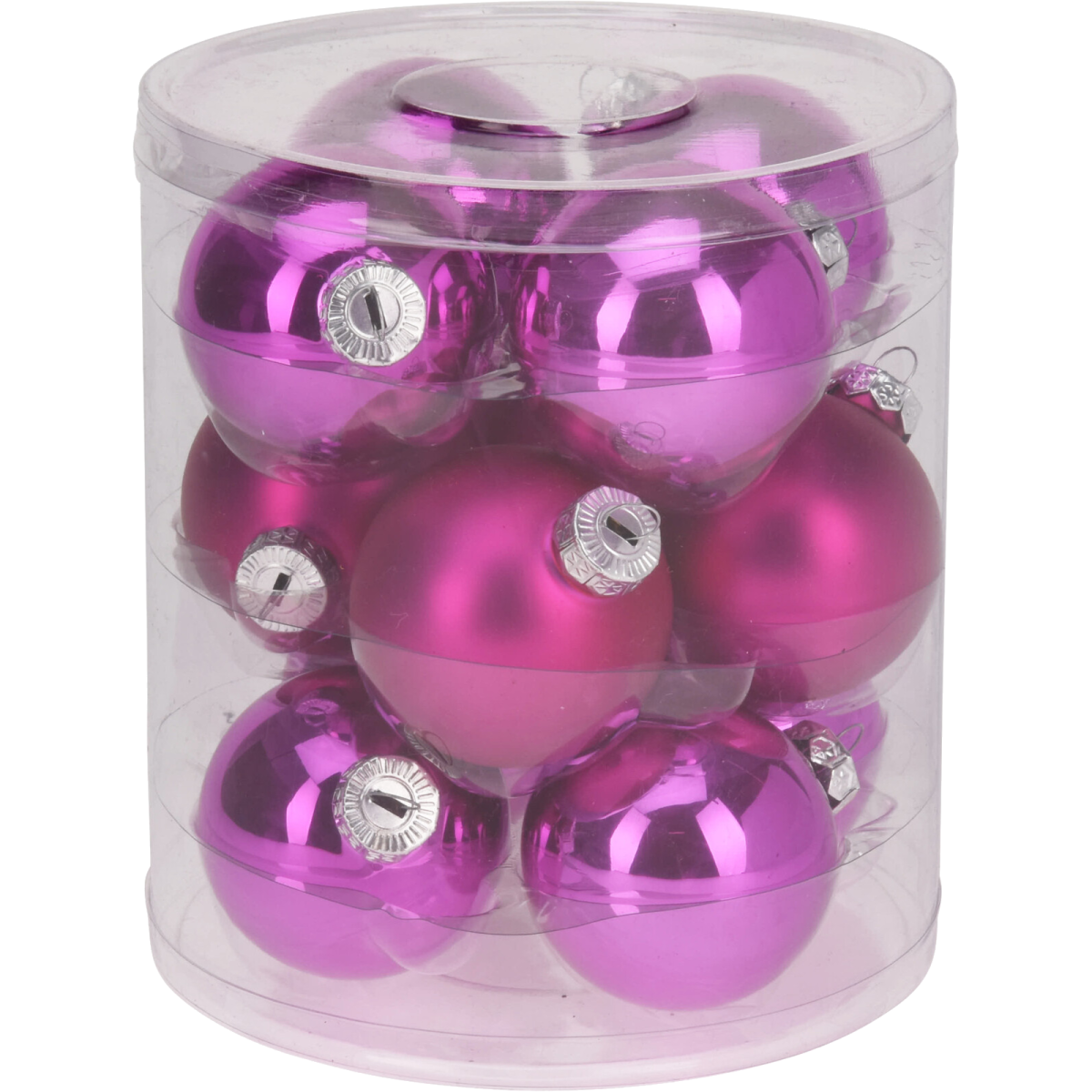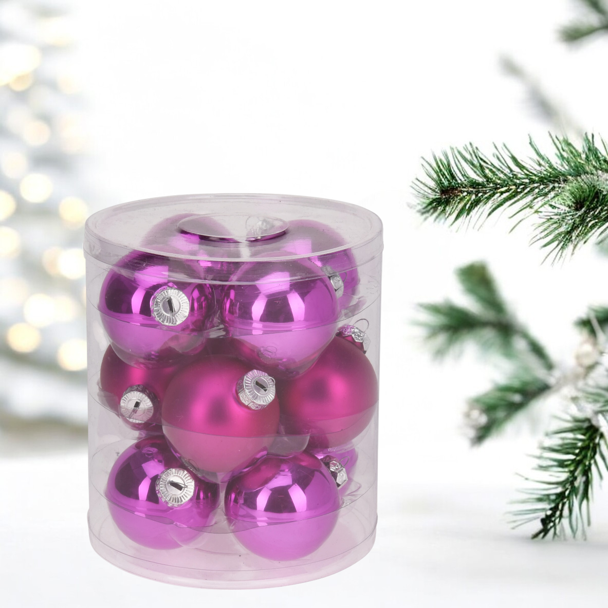 Ez a 12 db-os, üvegből készült díszgömb készlet tökéletes választás az ünnepi dekorációhoz. A készlet tartalmaz 6 fényes és 6 matt felületű gömböt, melyek mindegyike 60 mm átmérőjű, így variálhatja a fények és textúrák játékát. Az fukszia színű gömbök eleganciát és melegséget visznek otthona díszítésébe, ideálisak a karácsonyfa vagy egyéb ünnepi dekorációk kiegészítésére. A különböző felületek kombinációja lehetővé teszi, hogy egyedi és figyelemfelkeltő látványt hozzon létre.