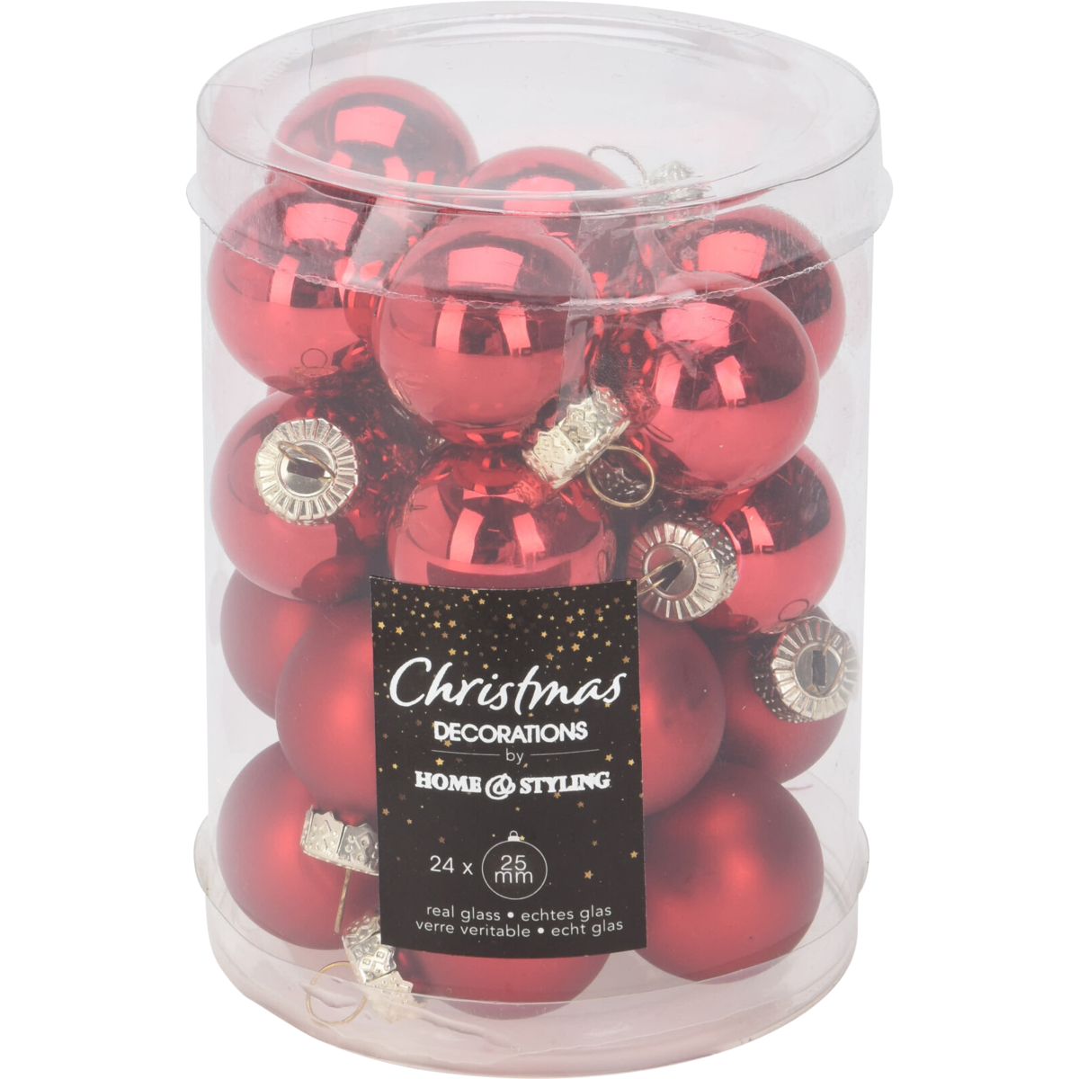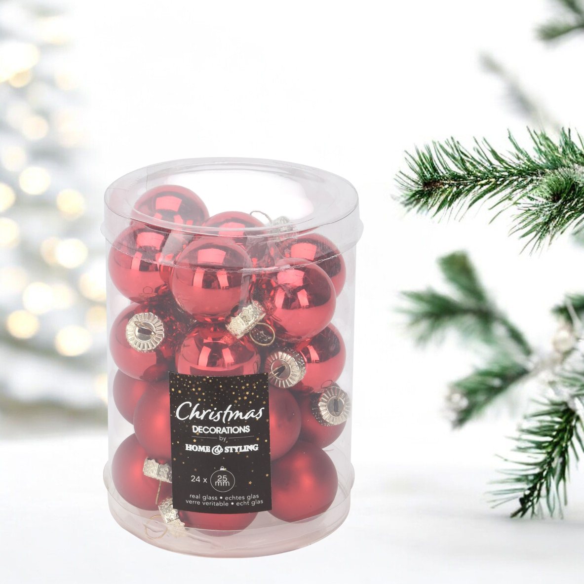Ez a 24 darabos díszgömb készlet, amelynek anyaga üveg, tökéletes választás az ünnepi dekorációhoz. A készlet tartalmaz 12 fényes és 12 matt felületű gömböt, mindegyik 25 mm átmérőjű, így variálhatja a fények és textúrák játékát. A piros színű gömbök eleganciát és melegséget visznek otthona díszítésébe, ideálisak a karácsonyfa vagy egyéb ünnepi dekorációk kiegészítésére. A különböző felületek kombinációja lehetővé teszi, hogy egyedi és figyelemfelkeltő látványt hozzon létre.