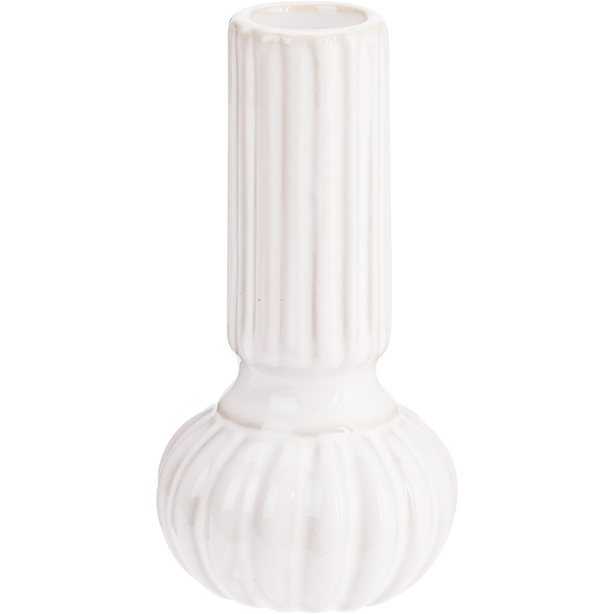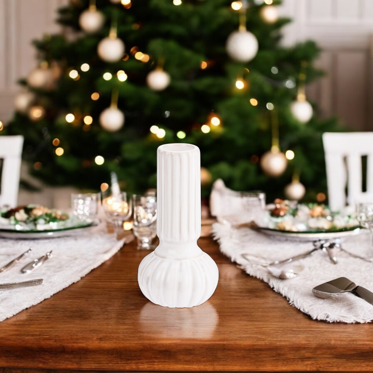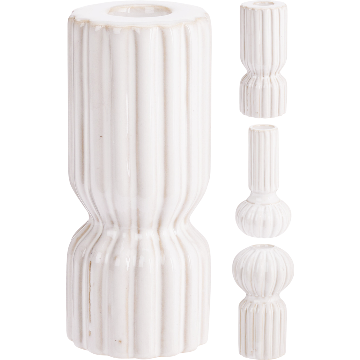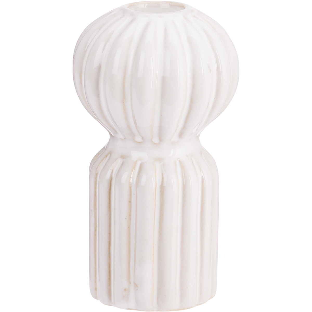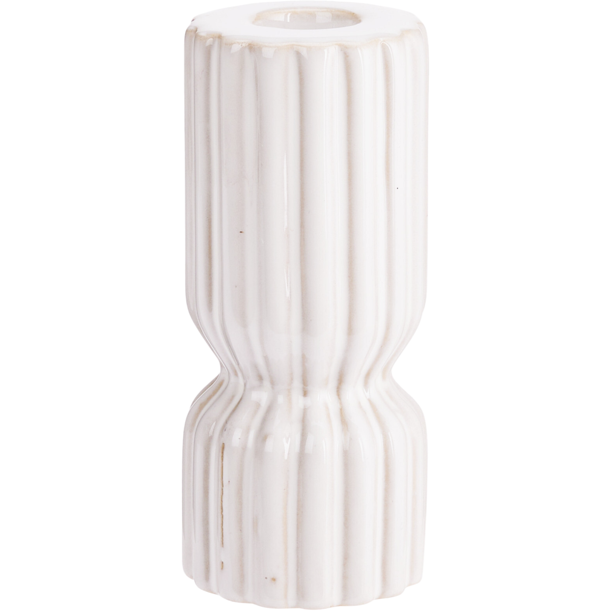 Ez a 12,5×5×5 cm-es méretű, krémszínű porcelán gyertyatartó finoman bordázott kialakításával letisztult és elegáns megjelenést kölcsönöz otthonodnak. Kiváló választás ünnepi asztaldíszhez, romantikus vacsorához vagy akár mindennapi dekorációként is. A fényes mázas felület és a visszafogott árnyalat harmonikusan illeszkedik modern és klasszikus enteriőrökhöz egyaránt.