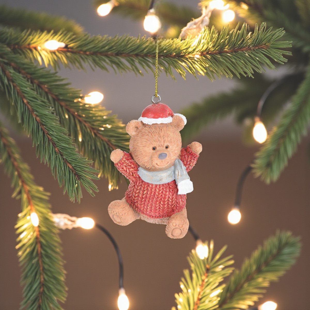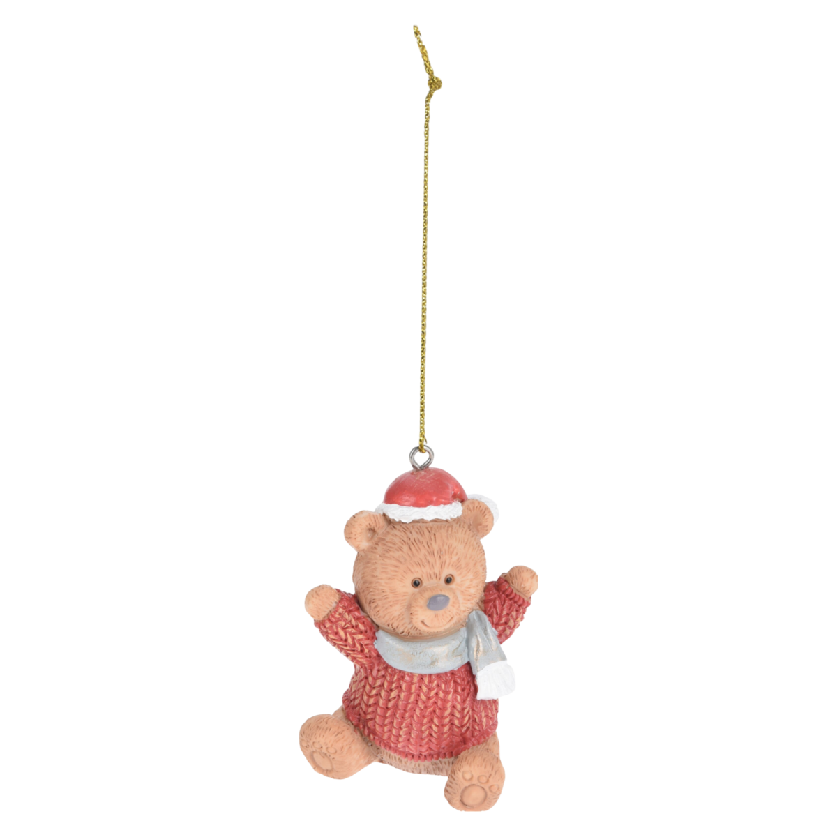 Hangulatos és részletgazdag karácsonyfadísz két klasszikus karácsonyi mintában: egy szerethető medvefigurával és egy hagyományos hintalóval.