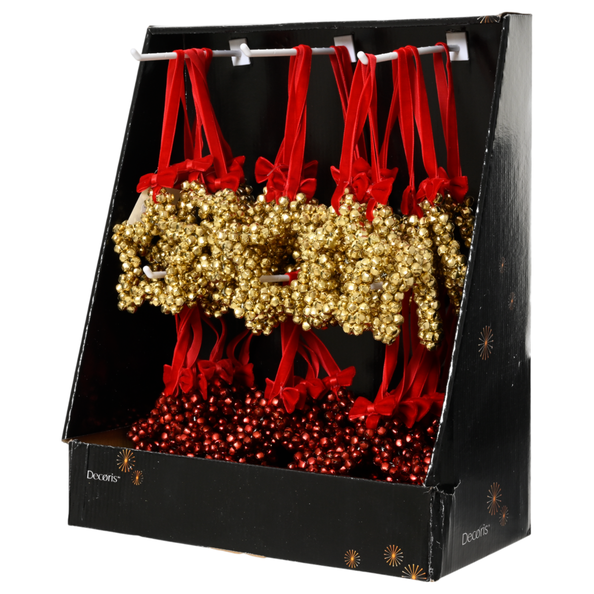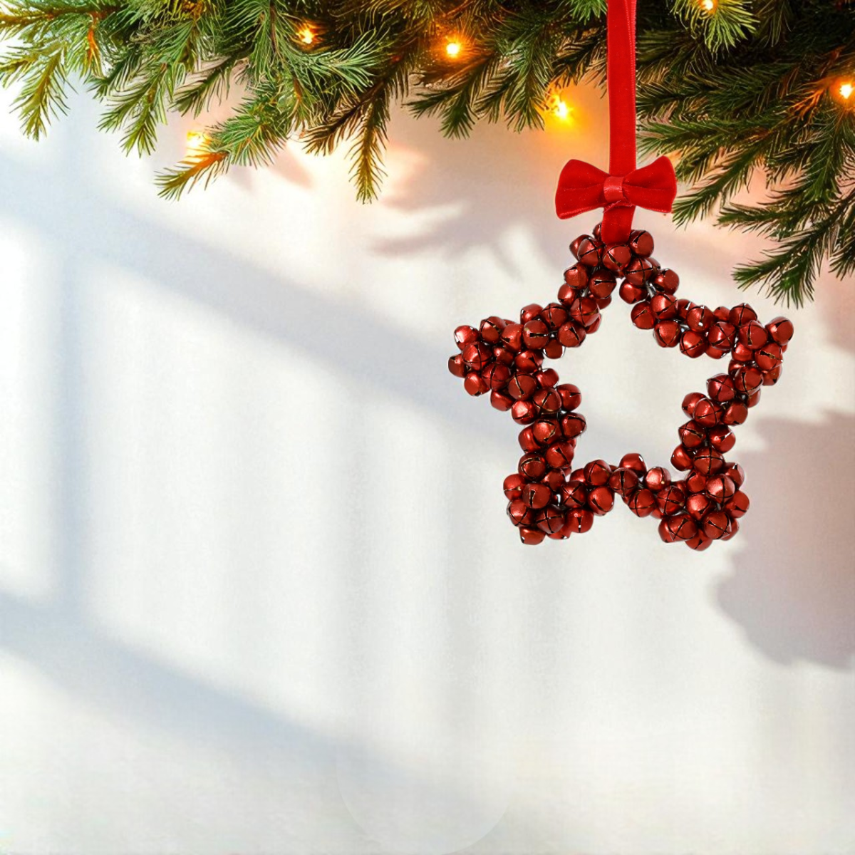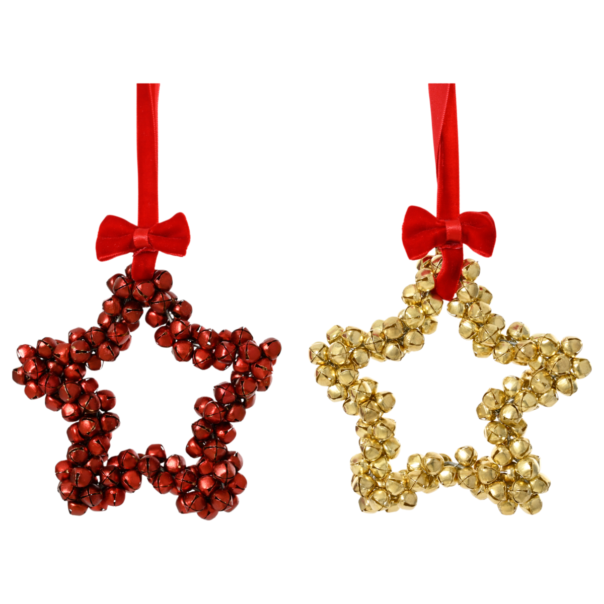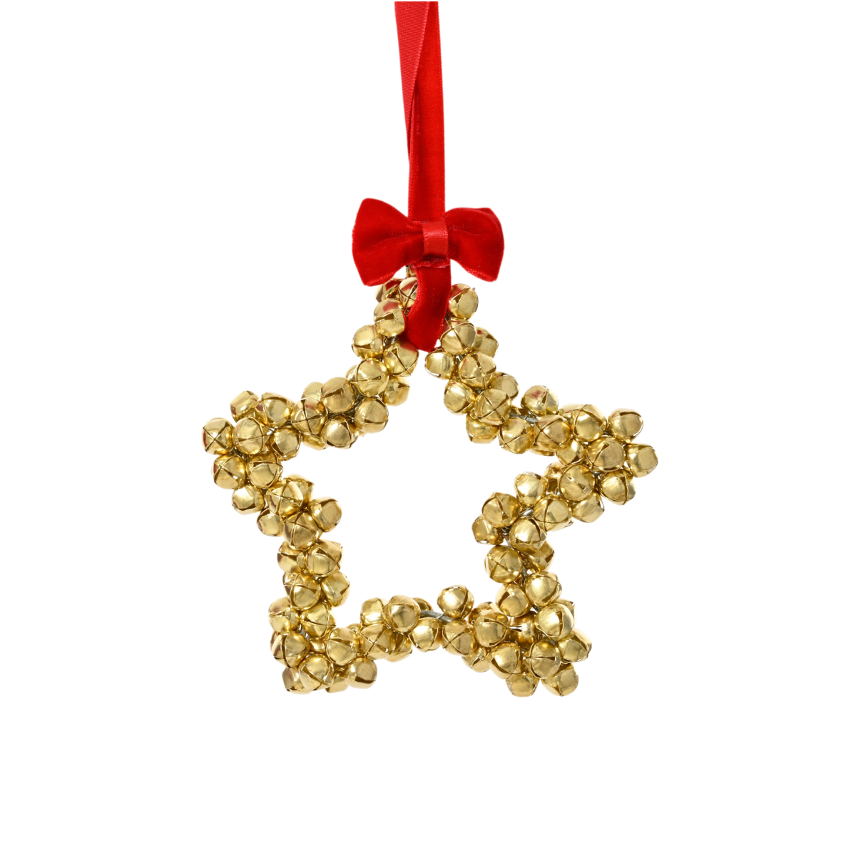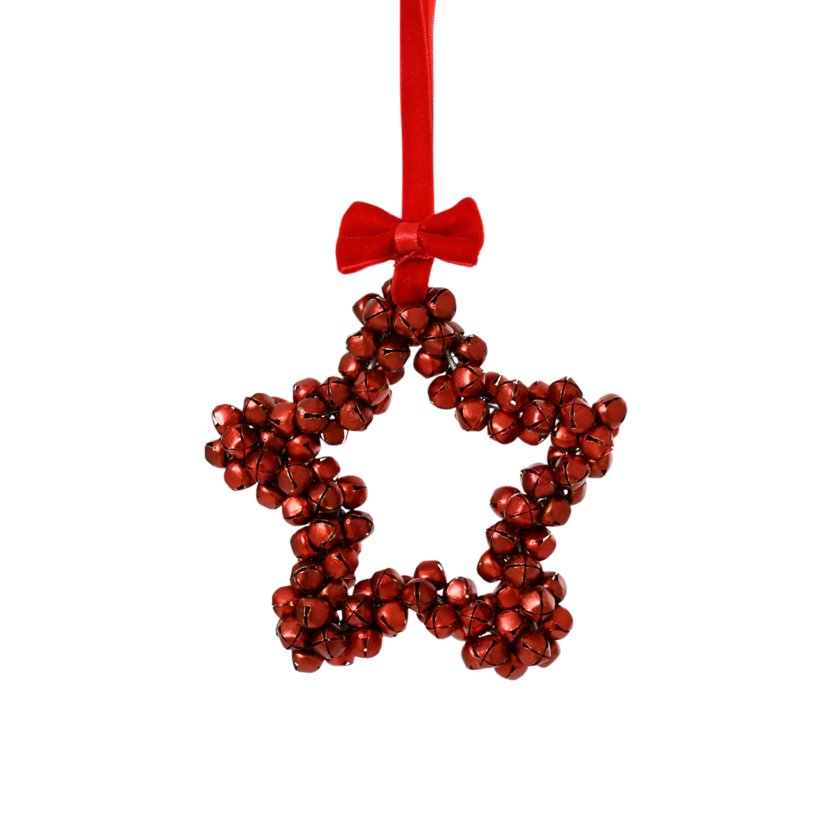 Ez a különleges, csillag alakú karácsonyfadísz 10 cm-es méretben, apró fém csengőkből készült. Kétféle változatban érhető el: arany és piros színben, piros szaténszalaggal és masnival kiegészítve. A dísz rusztikus, mégis látványos hatást kelt, legyen szó karácsonyfáról, ajtókopogtatóról vagy ünnepi dekorációról.