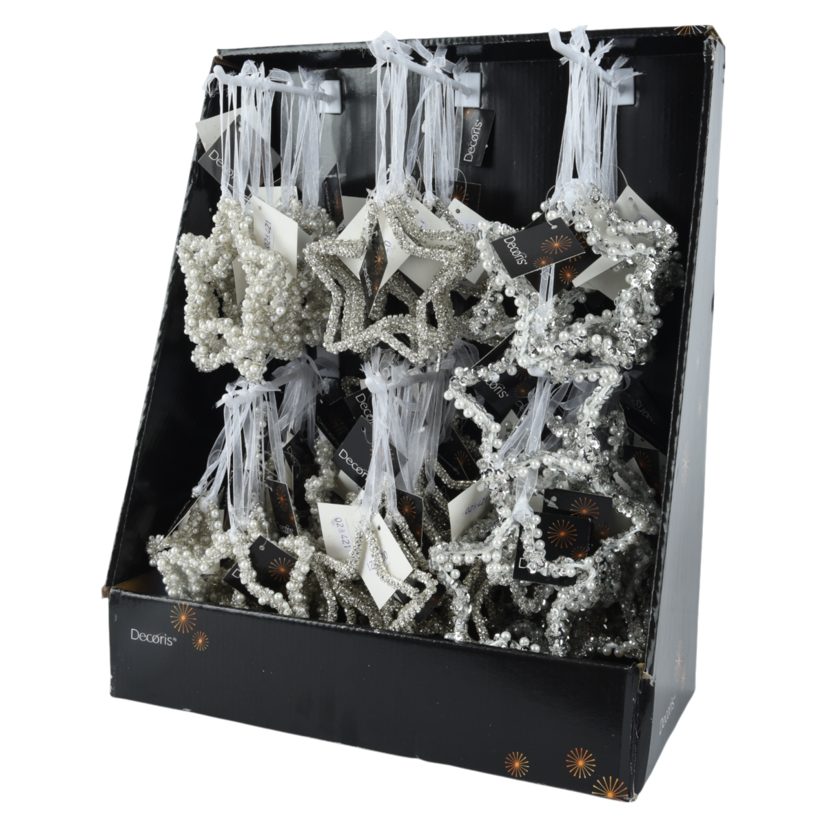 Dobd fel a karácsonyfádat ezekkel a látványos, csillag formájú díszekkel, amelyek háromféle mintában érhetők el: gyöngyös, gyémánthatású és glitteres kivitelben. Az áttört csillagok könnyed hatást keltenek, miközben ragyogó részleteikkel elegáns, mégis modern karácsonyi hangulatot teremtenek.