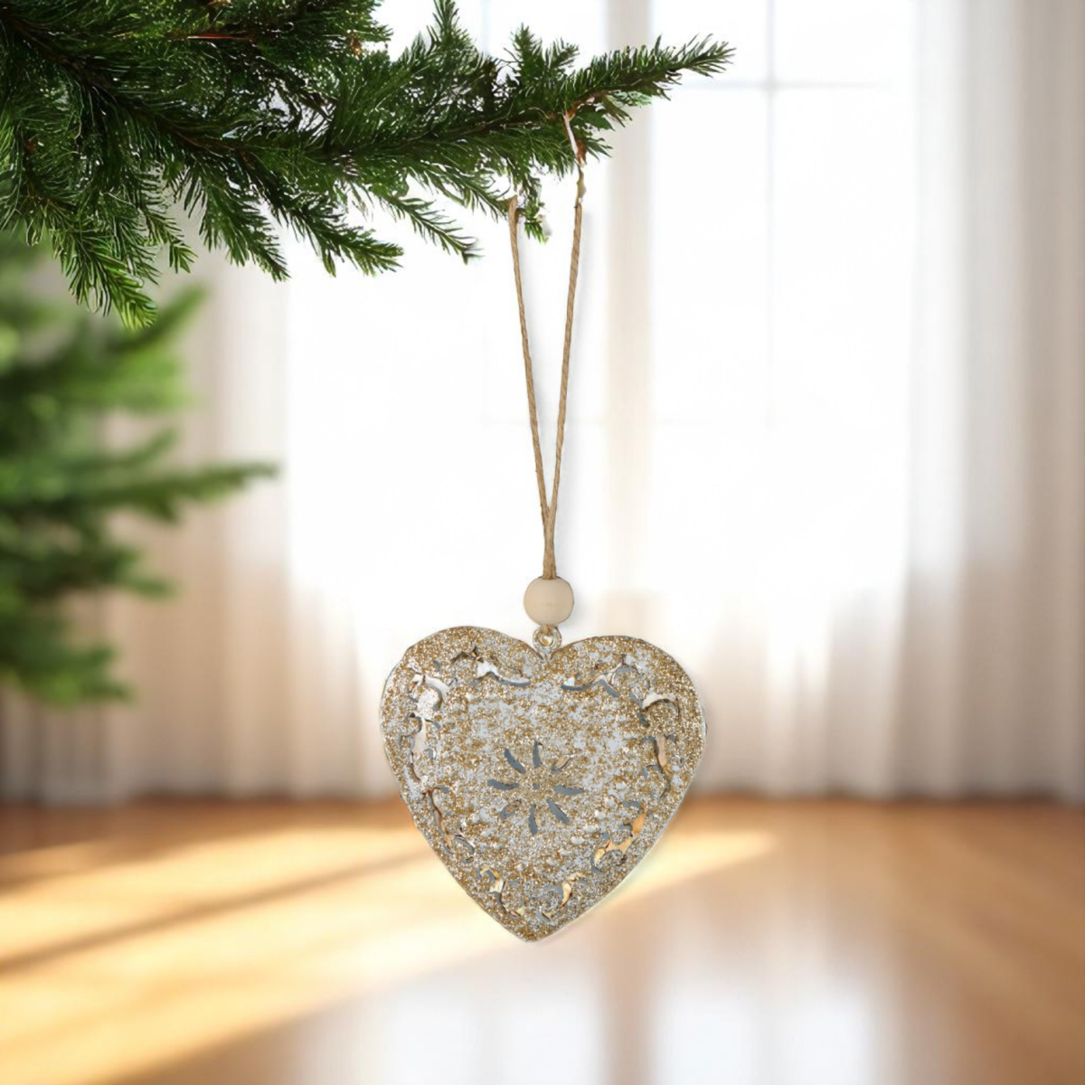 Dobd fel az ünnepi dekorációt ezekkel a különleges megjelenésű, pezsgőszínű fém karácsonyfadíszekkel, amelyek visszafogott csillogásukkal és juta részleteikkel egyszerre természetes és elegáns hatást keltenek. A díszek háromféle formában kaphatók: szív, csillag és fenyőfa.