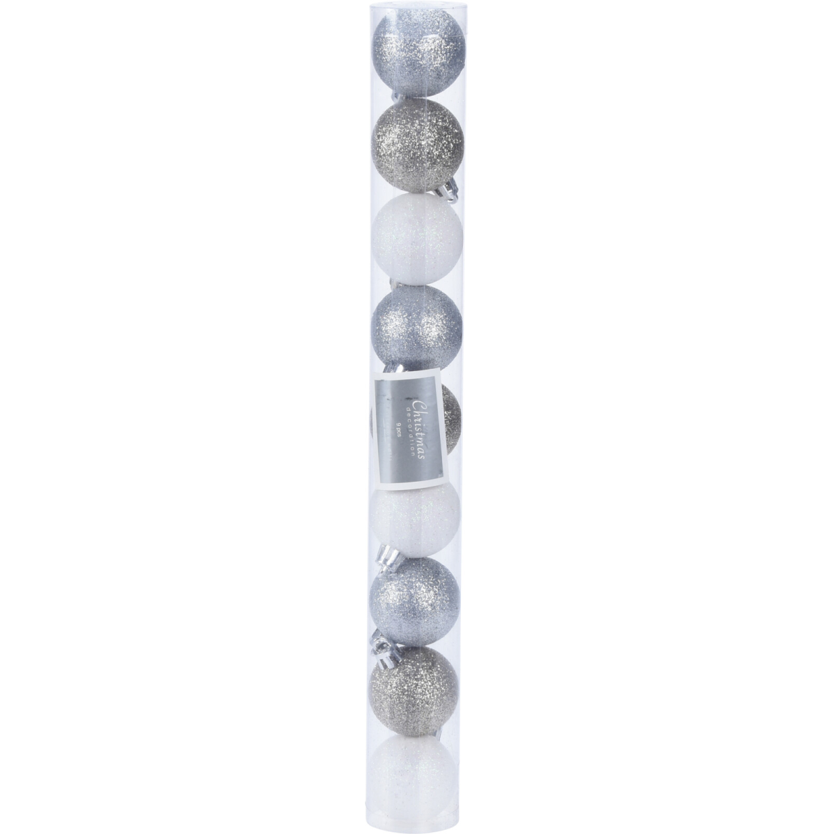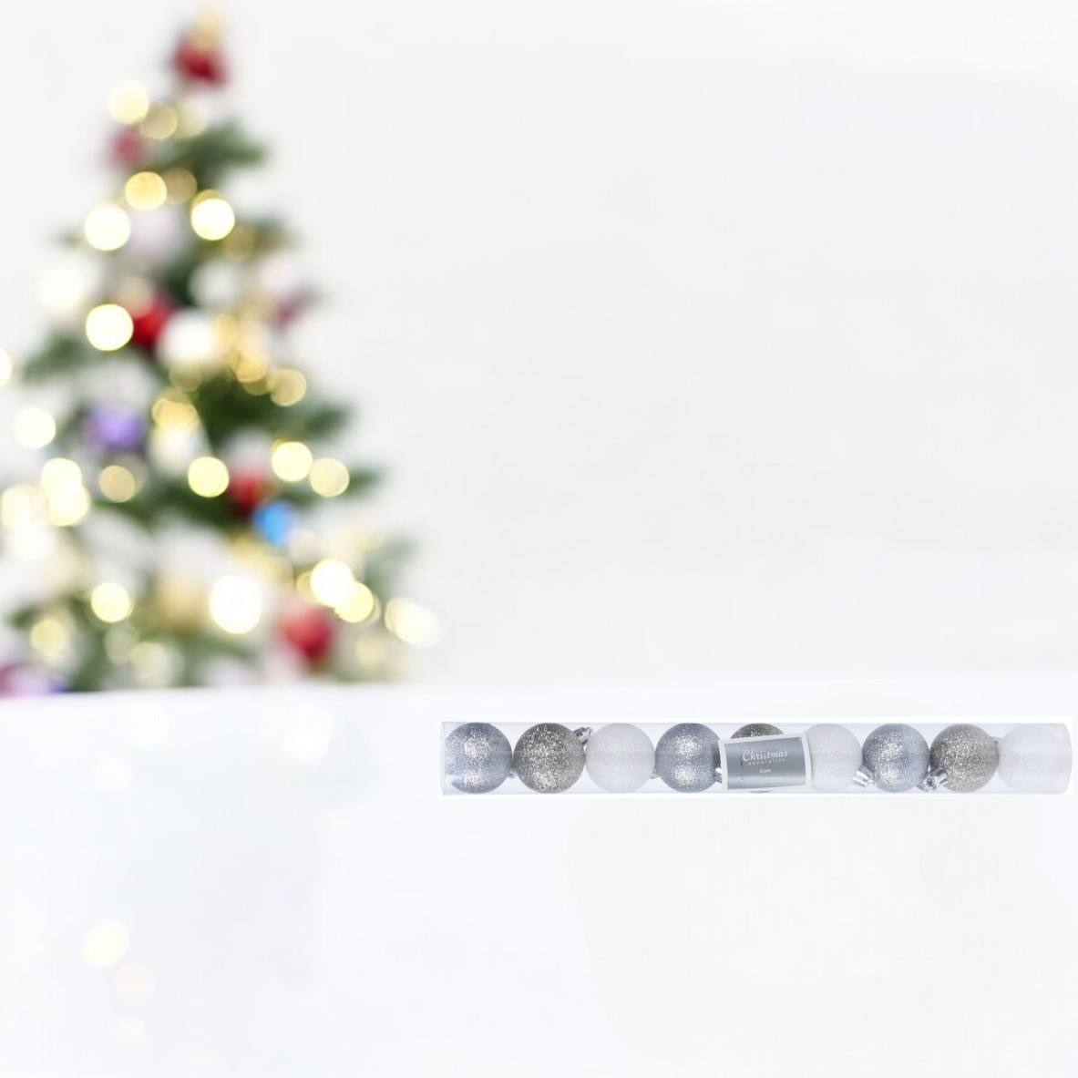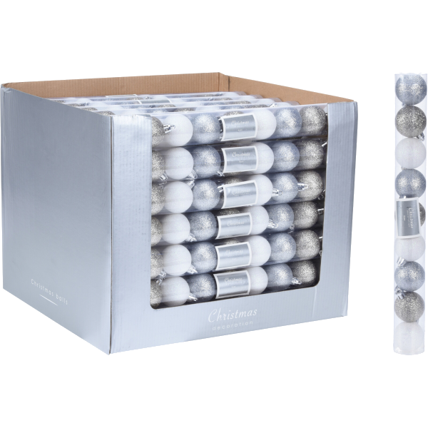 9 db-os, polisztirénből készült karácsonyfadísz gömb szett A csillámos gömb mérete: 40 mm, ezüst és fehér színben található meg a csomagban. Ezzel a műanyag gömb szettel igazán egyedi hangulatúvá varázsolhatod karácsonyfád vagy akár adott helyiséget.