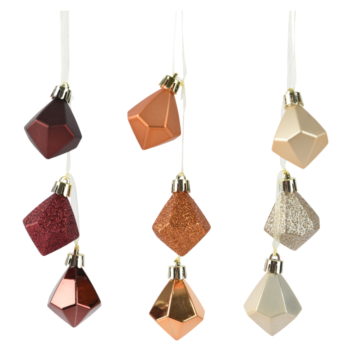 Dobd fel az ünnepi dekorációt ezekkel az egyedi gyémánt formájú karácsonyfadíszekkel! A díszek 5,8 cm-es méretűek, polisztirolból készültek, és három különböző színárnyalatban, valamint háromféle felülettel – matt, fényes és csillámos – érhetők el. A különleges forma és változatos felületkombinációk változatosságot visznek a karácsonyfadíszítésbe.