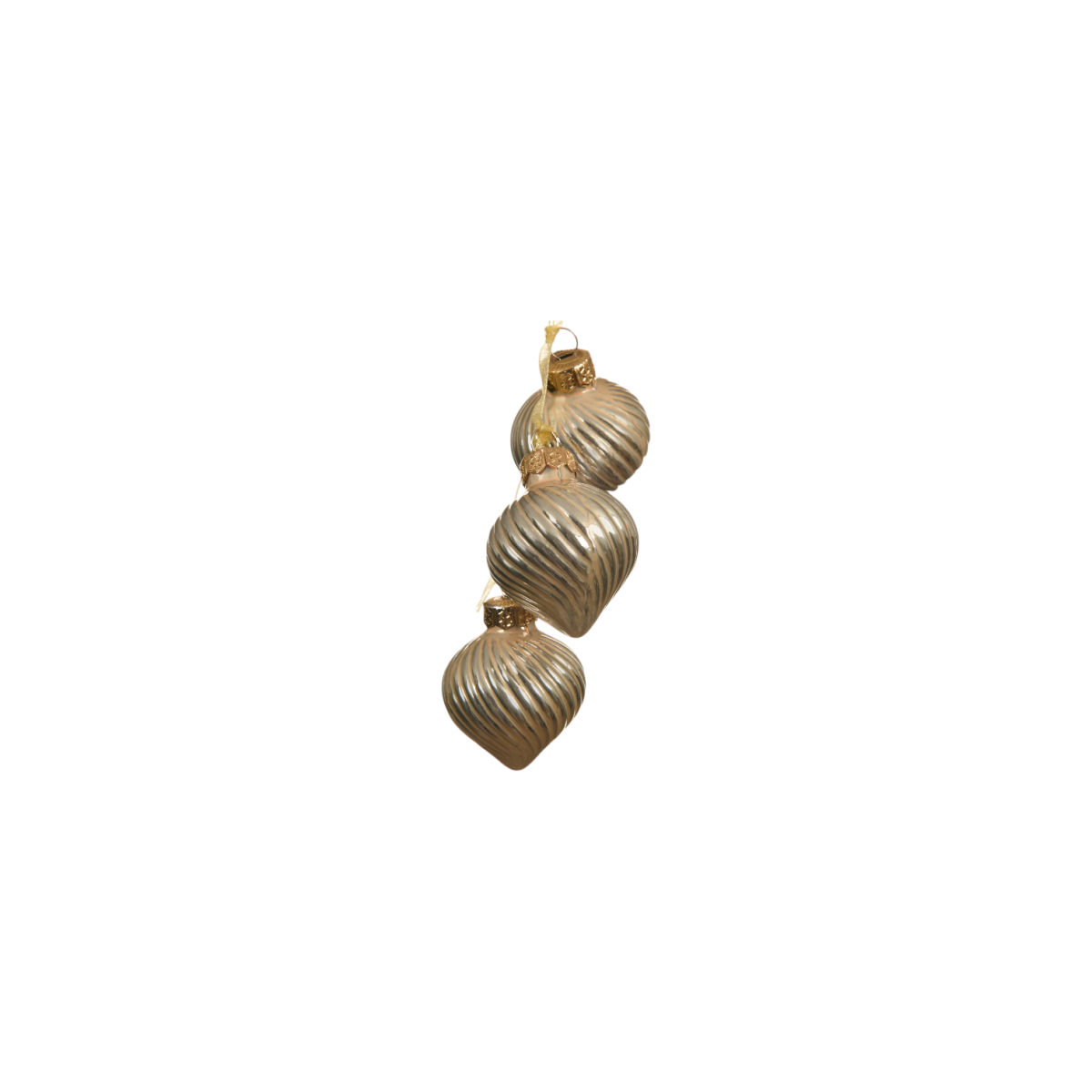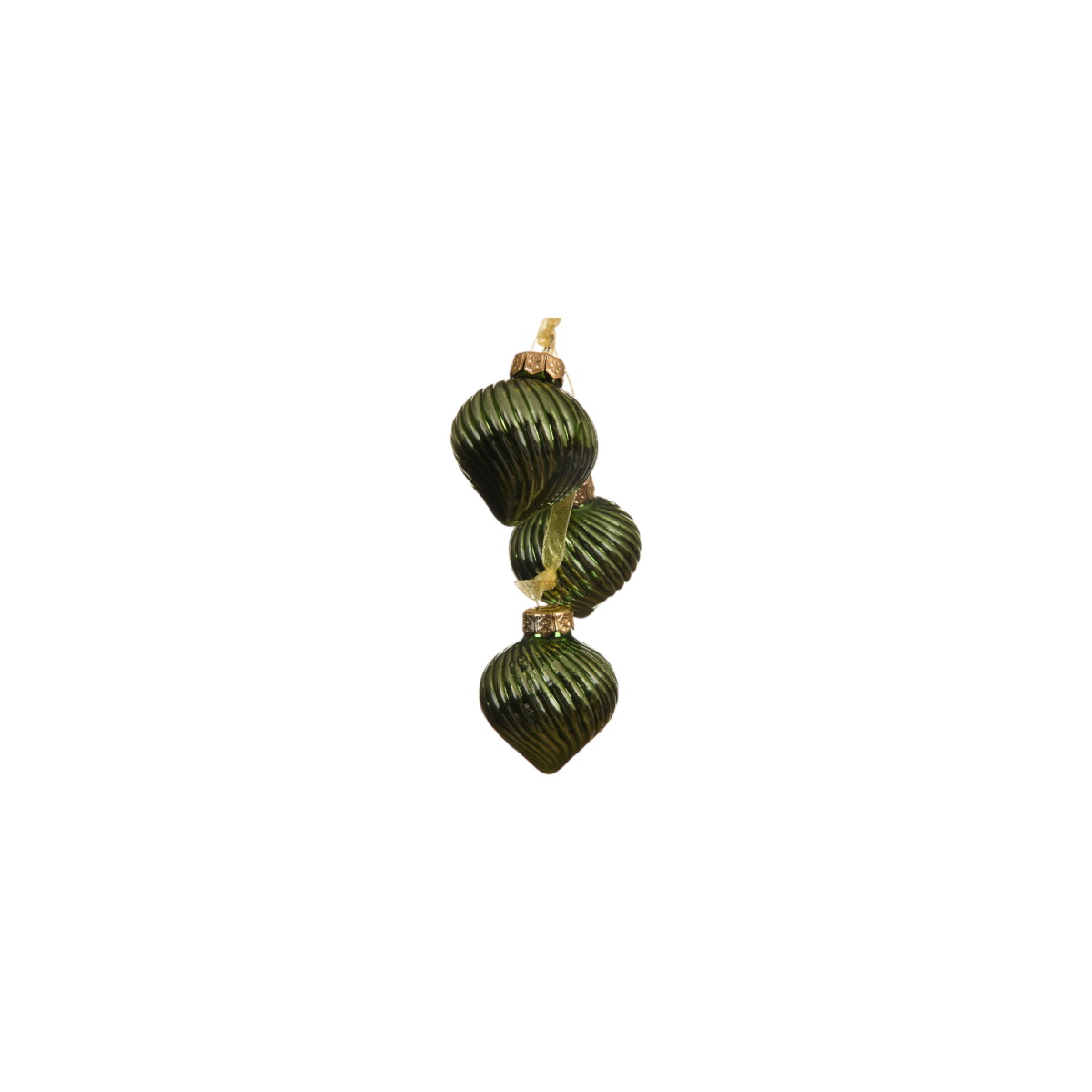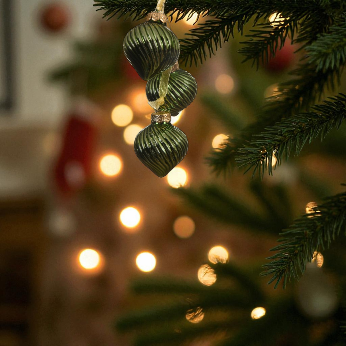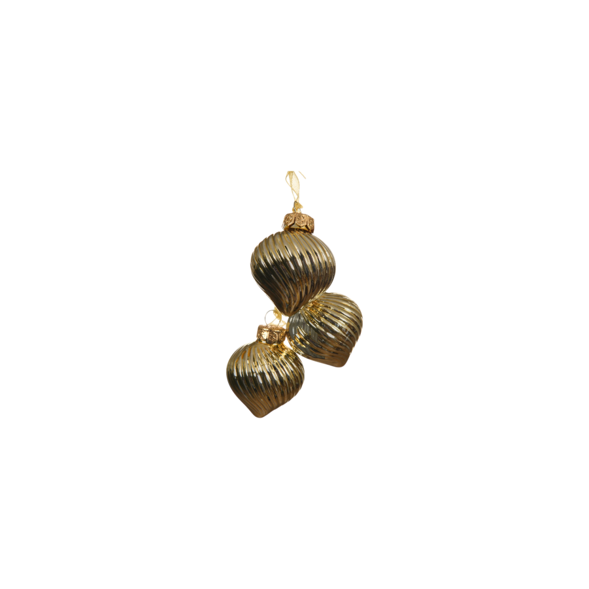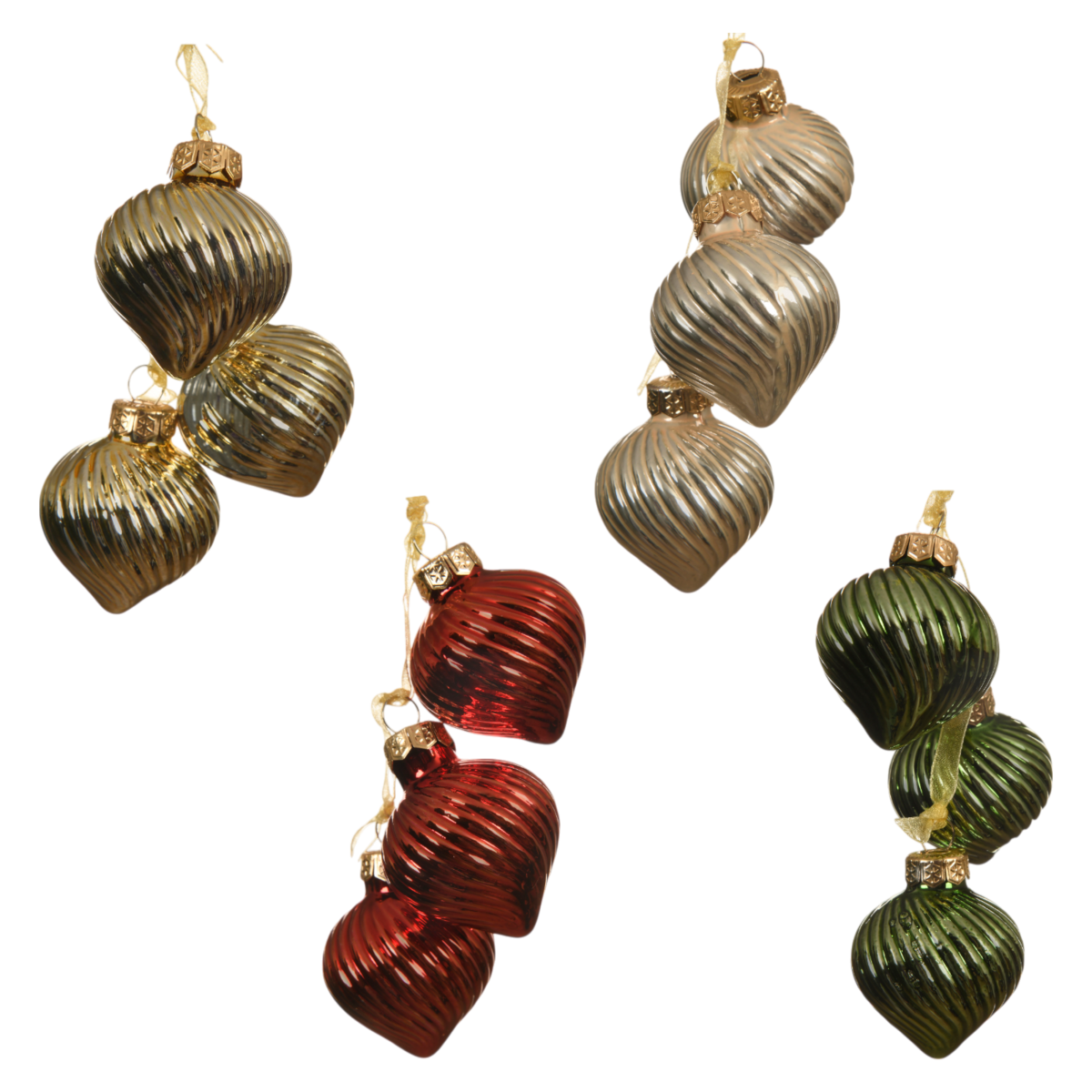 Tedd különlegessé az ünnepi dekorációt ezzel az egyedi karácsonyfadísszel, amely három, egybefűzött kisebb hagymaalakú elemből áll. Az üvegből készült dísz elegáns megjelenésével tökéletes választás a klasszikus és modern karácsonyfákhoz egyaránt. Az aranyszínű fémkupak és a hozzá tartozó organza akasztószalag megkönnyítik az elhelyezést. A dísz három egybefűzött apró hagyma alakú részből áll. A dísz teljes magassága hozzávetőlegesen 12,9cm, a kis hagyma formák mérete egyenként kb. 4,3x3,5x3,5cm.