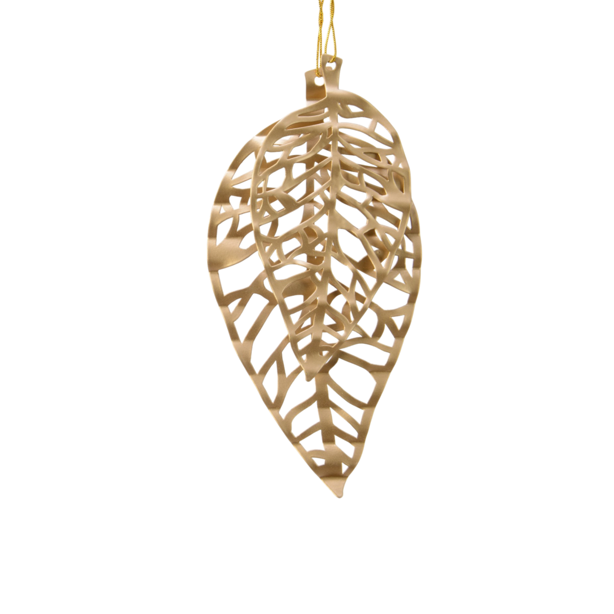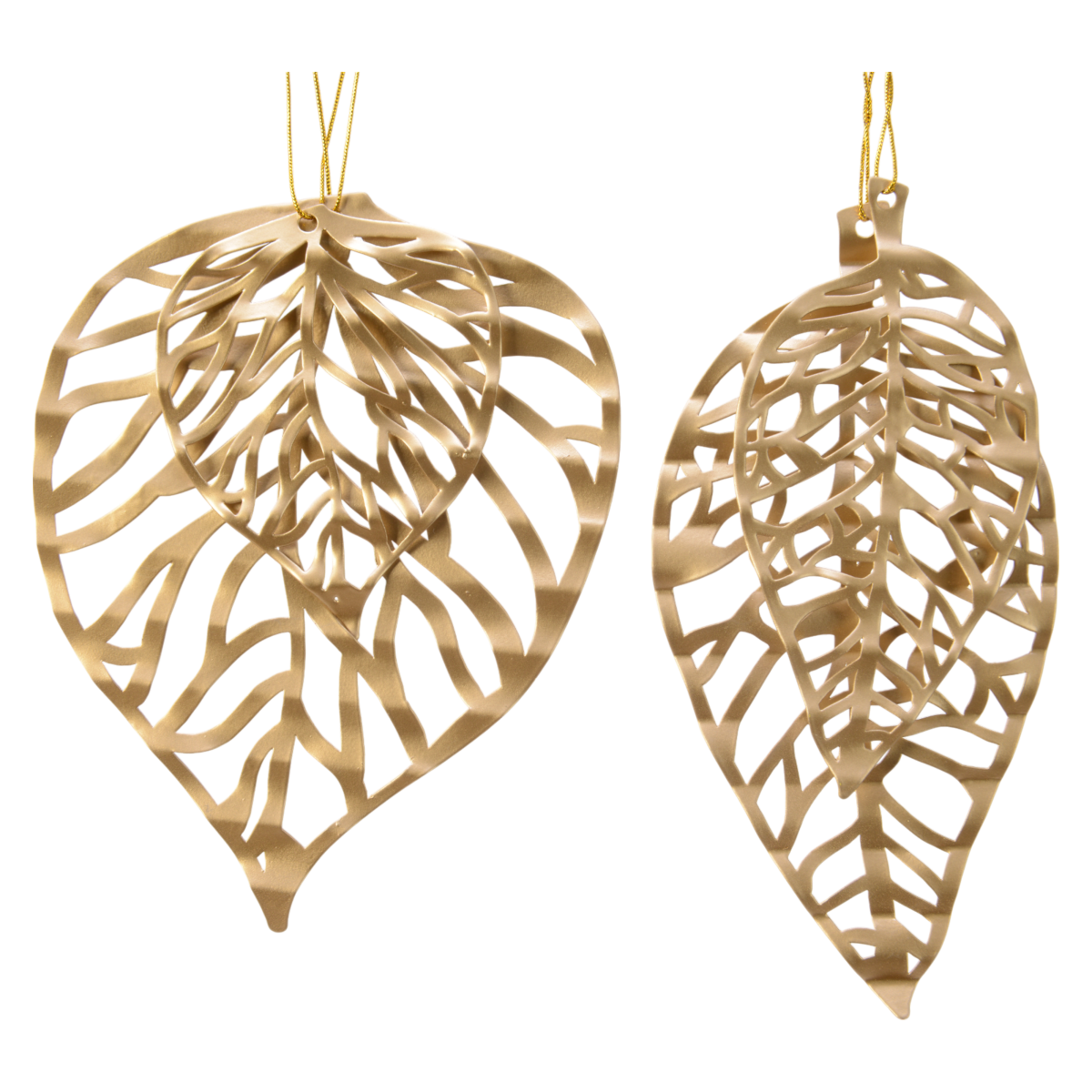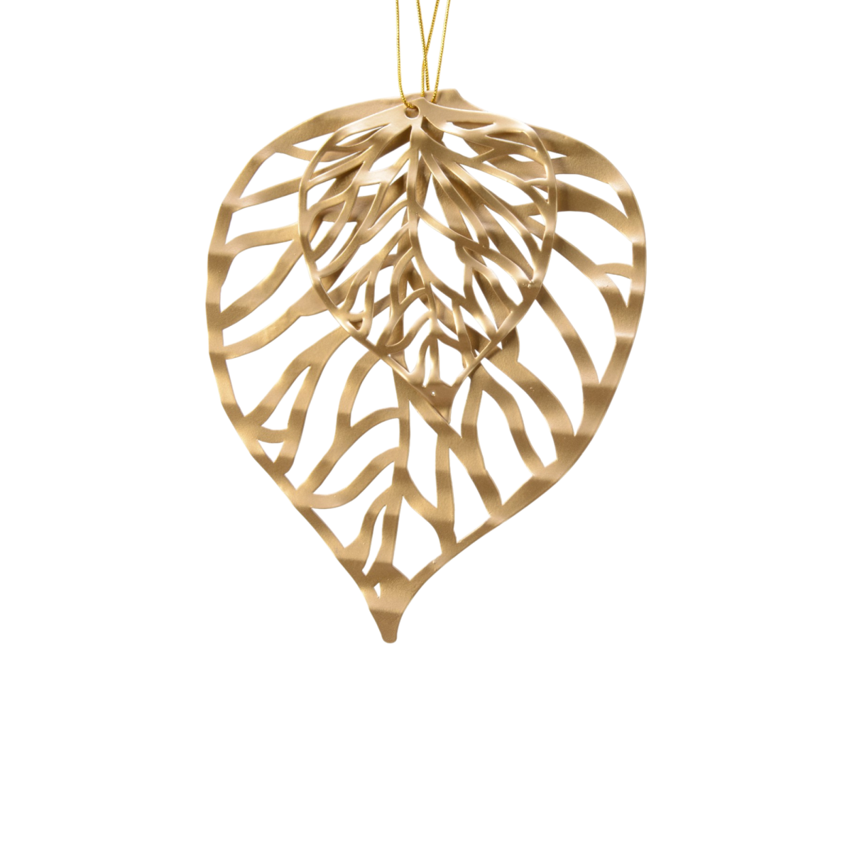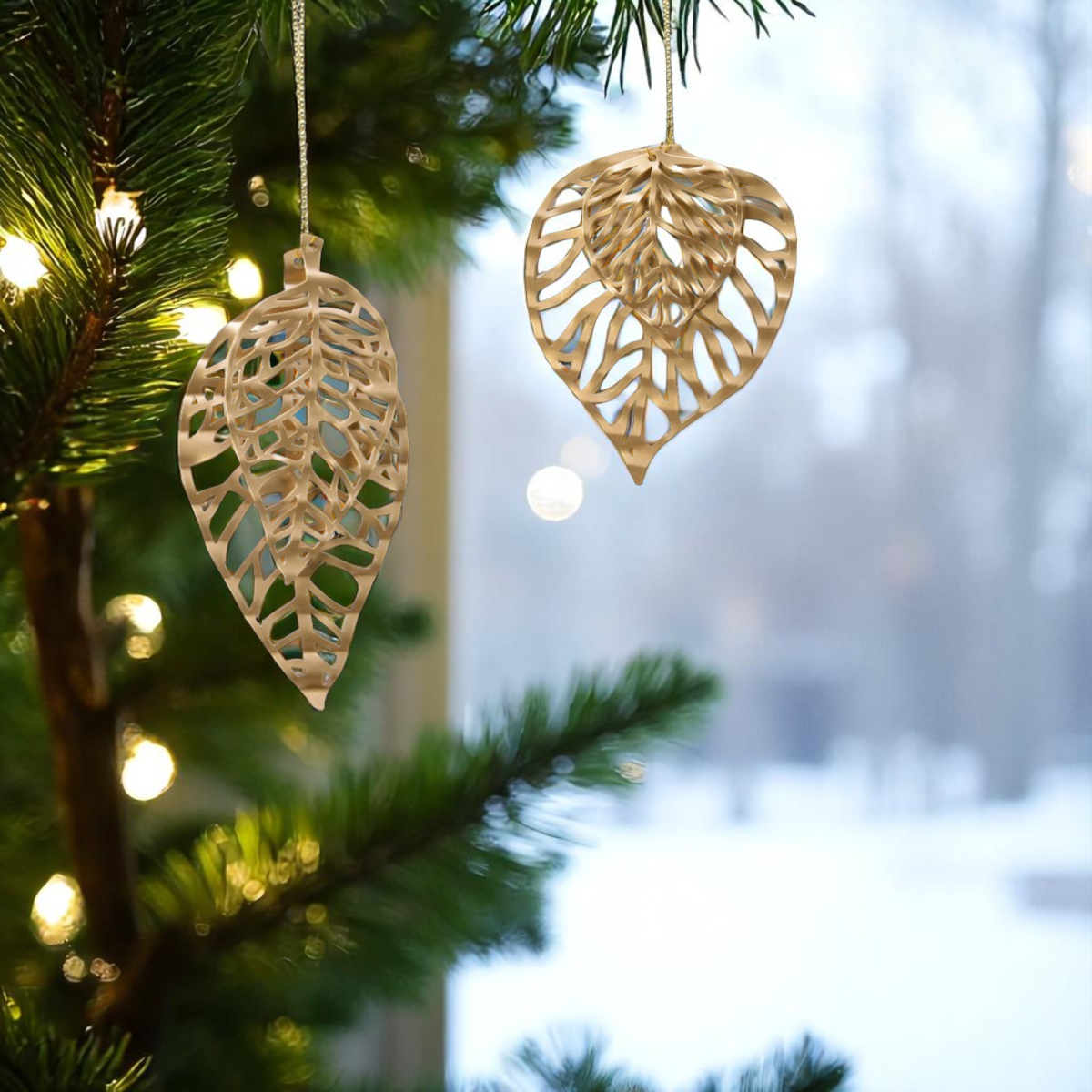 Ez a részletgazdag kidolgozású, levélformájú karácsonyfadísz 11,5 cm-es méretével és arany színű, áttört fém kivitelével igényes és modern hatást kelt. A dísz vékony vaslemezből készült, ami könnyű, mégis tartós megoldás, akár hosszabb távú dekorációként is. A szettben négy különböző levélmintás változat található, amelyek egymással harmonizáló, mégis egyedi megjelenést kínálnak.