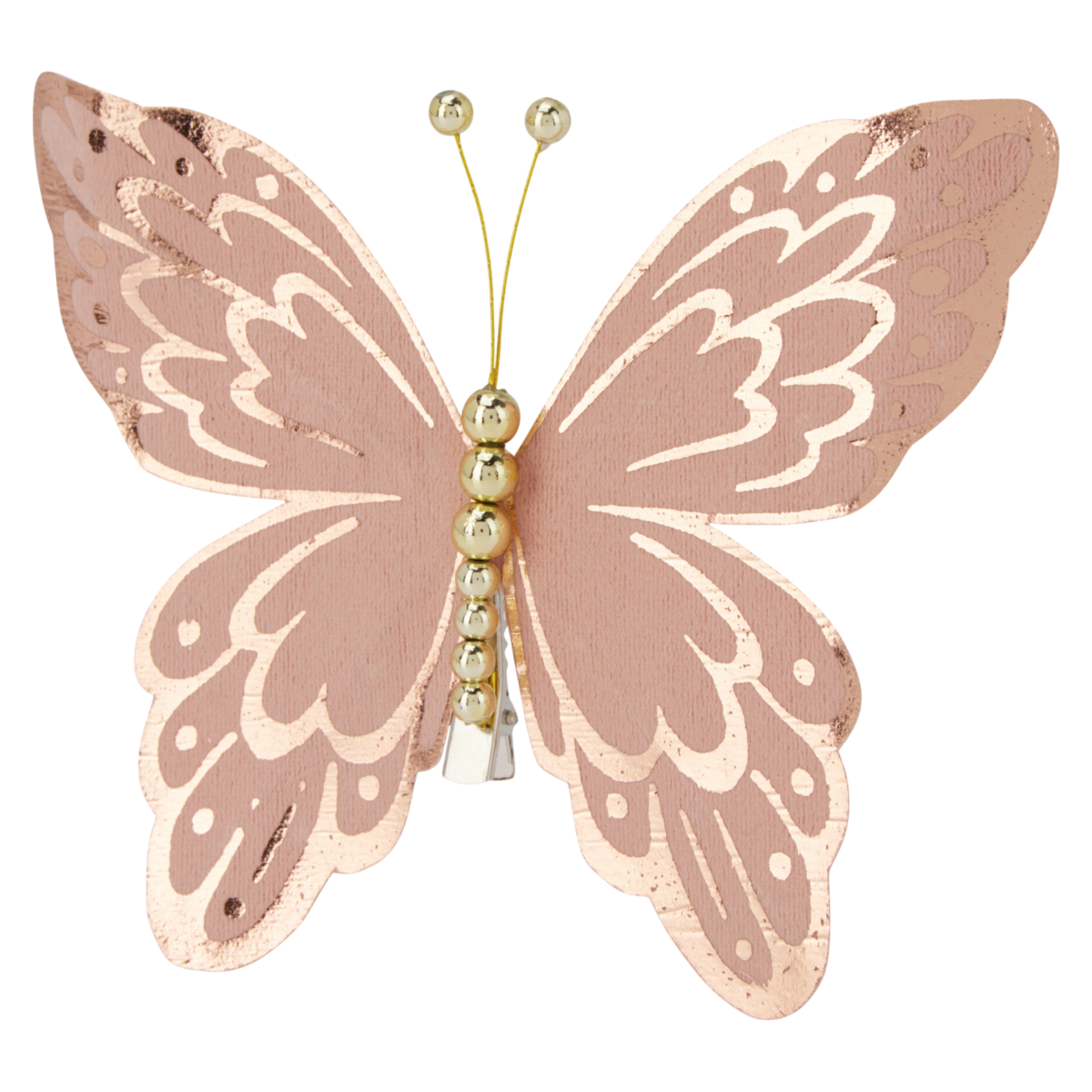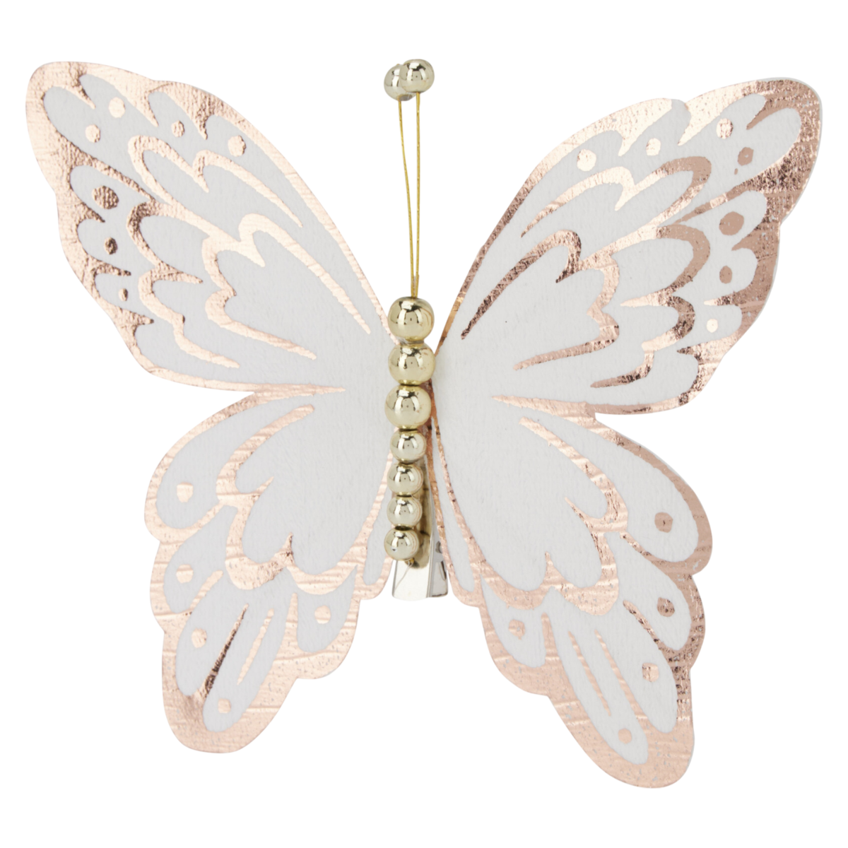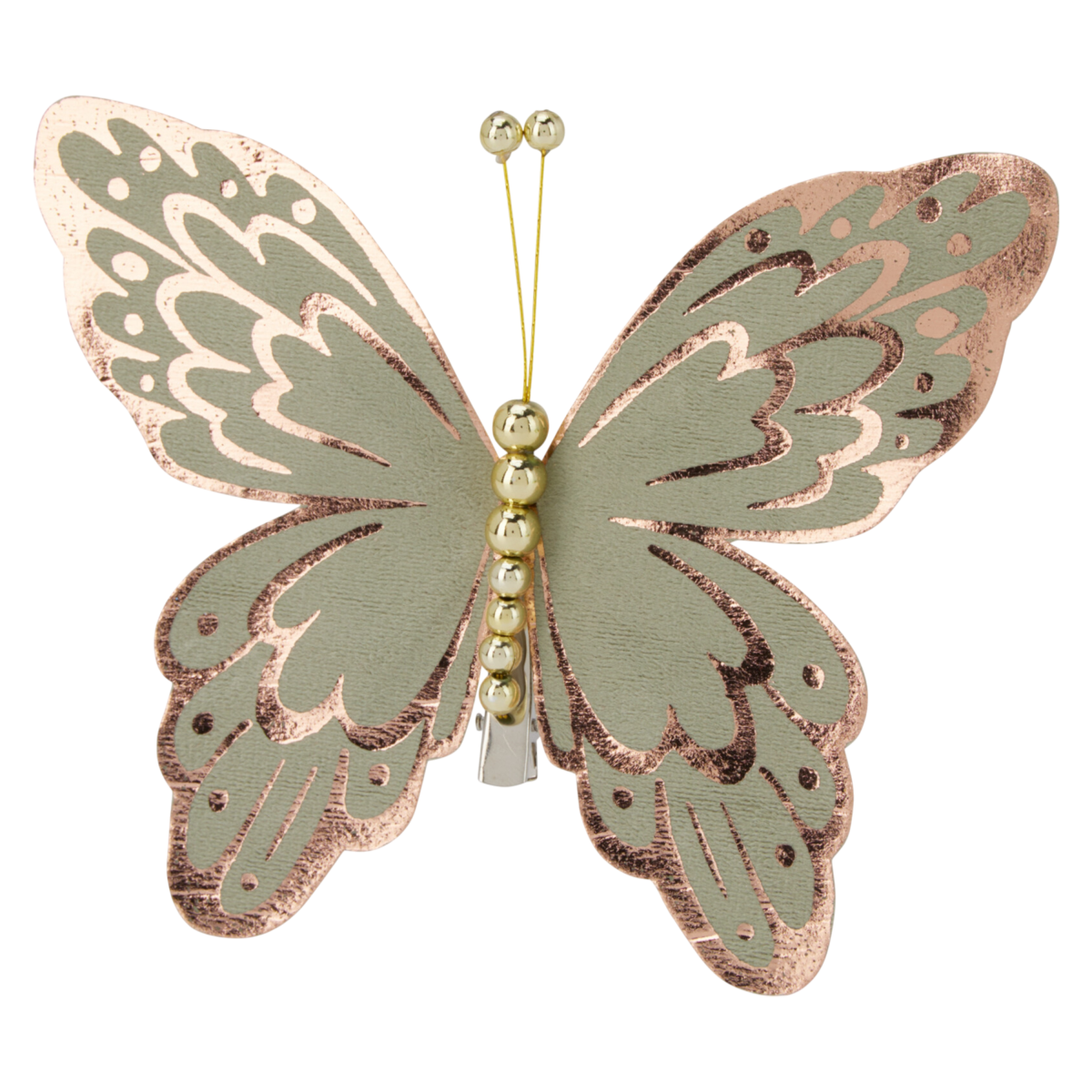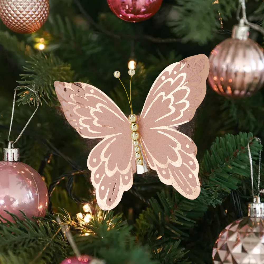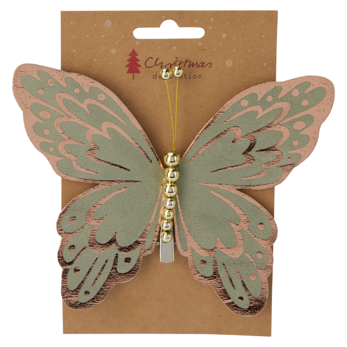 Tedd különlegessé az ünnepi dekorációt ezzel a mutatós pillangó formájú karácsonyfadísszel! A poliészter és polipropilén anyagból készült dísz könnyű, mégis stabil, így biztonságosan rögzíthető az ágakra. 15×16 cm-es méretével jól látható, mégsem hivalkodó. Három színváltozatban – zöld, fehér és rózsaszín – választható, így könnyen illeszthető bármilyen karácsonyi színvilághoz.