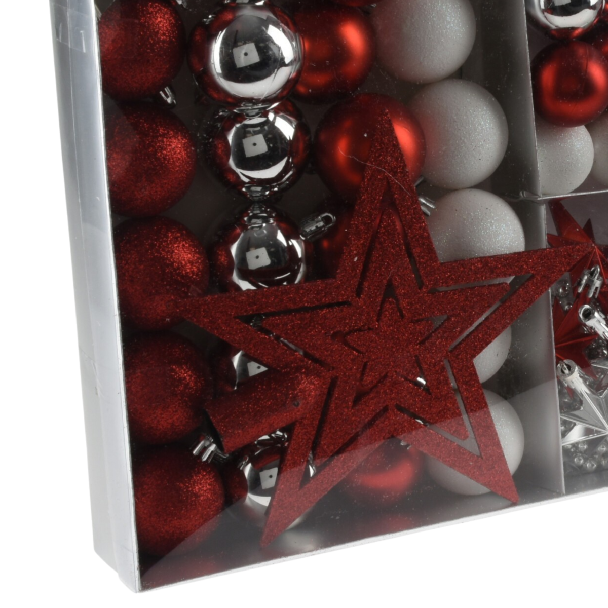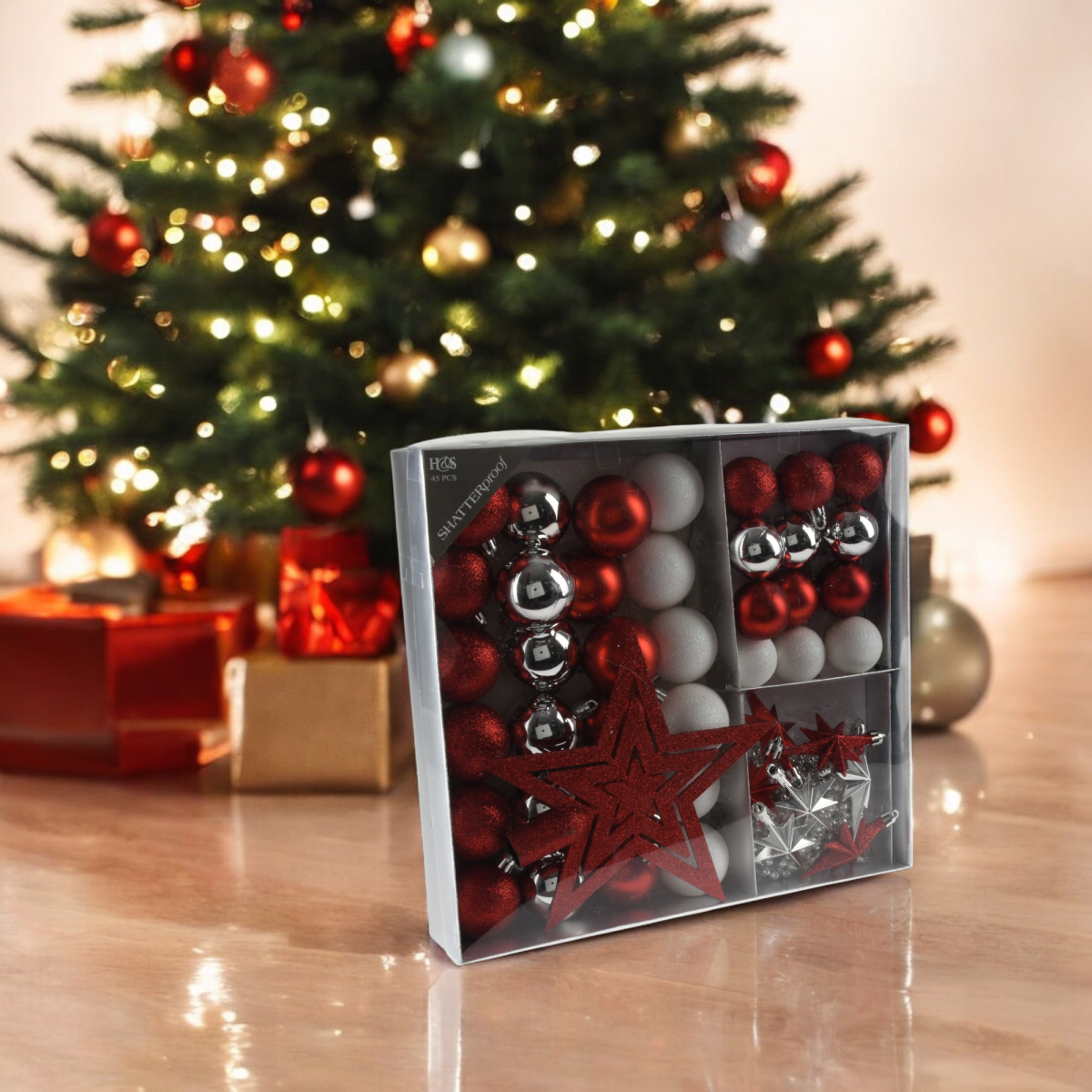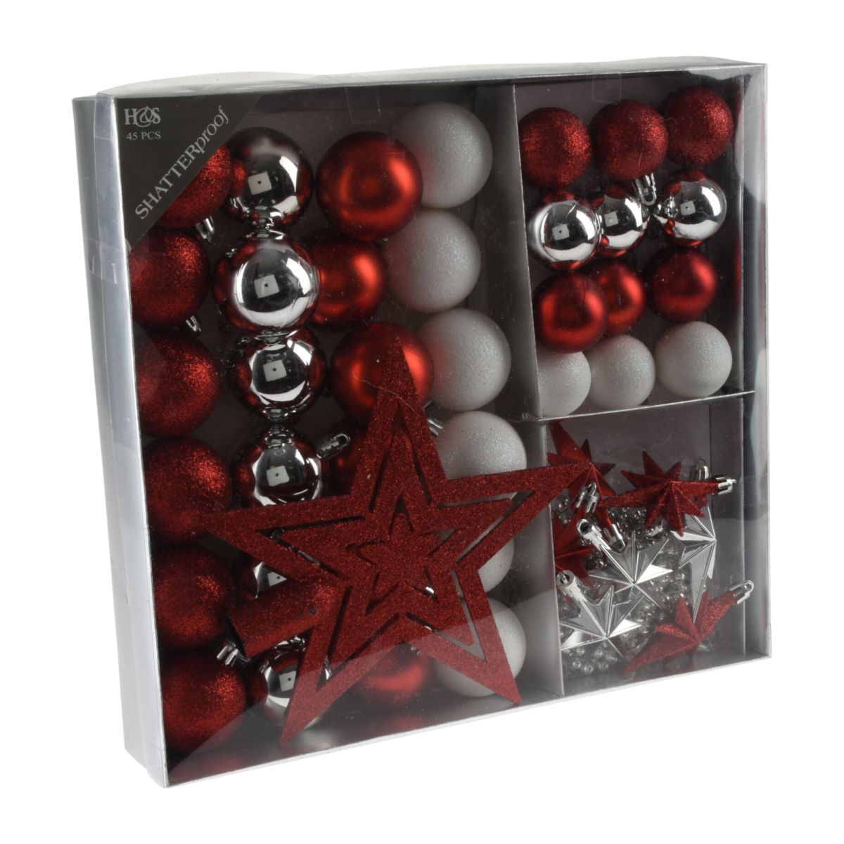 Polipropilénből készült, 45 darabos díszítő szett különböző színekben (piros, fehér, ezüst). Tartalma 24 db 50 mm-es gömb, melyből 6 db fényes, 6 db matt, 12 db glitteres; továbbá 12 db 40 mm-es gömb, melyből 3 db fényes, 3 db matt, 6 db glitteres; gyöngy girland 8 mm x 4 m, 1 db csúcsdísz 200 mm, 7 db 80 mm-es csillag dekor, melyből 3 db fényes, 2 db matt, 2 db glitteres. Ezzel a komplett díszítő szettel igazán vonzóvá varázsolhatjuk karácsonyfánkat és akár adott helyiséget.