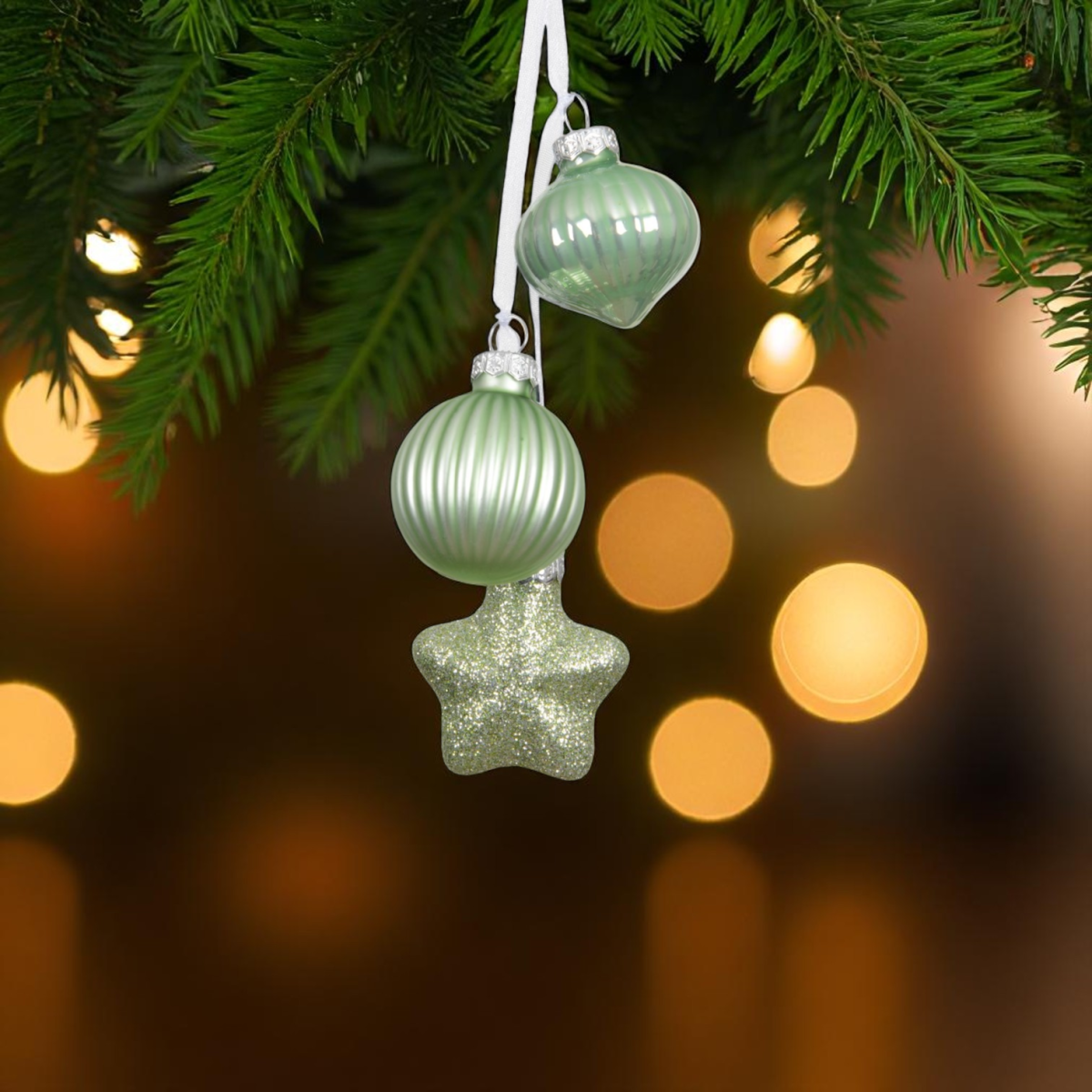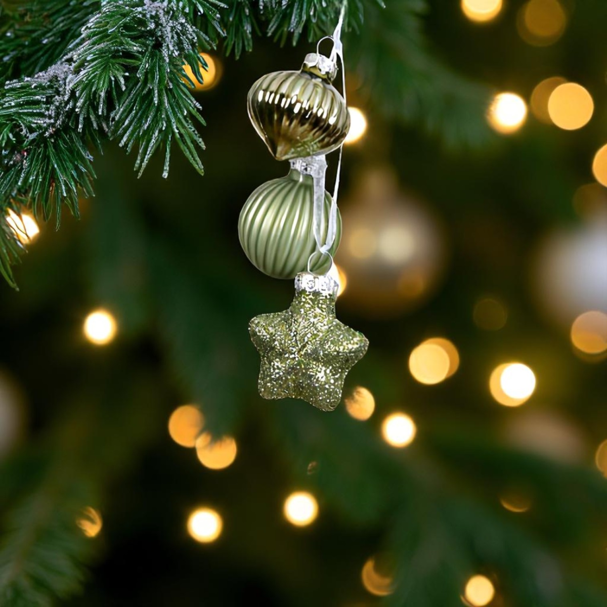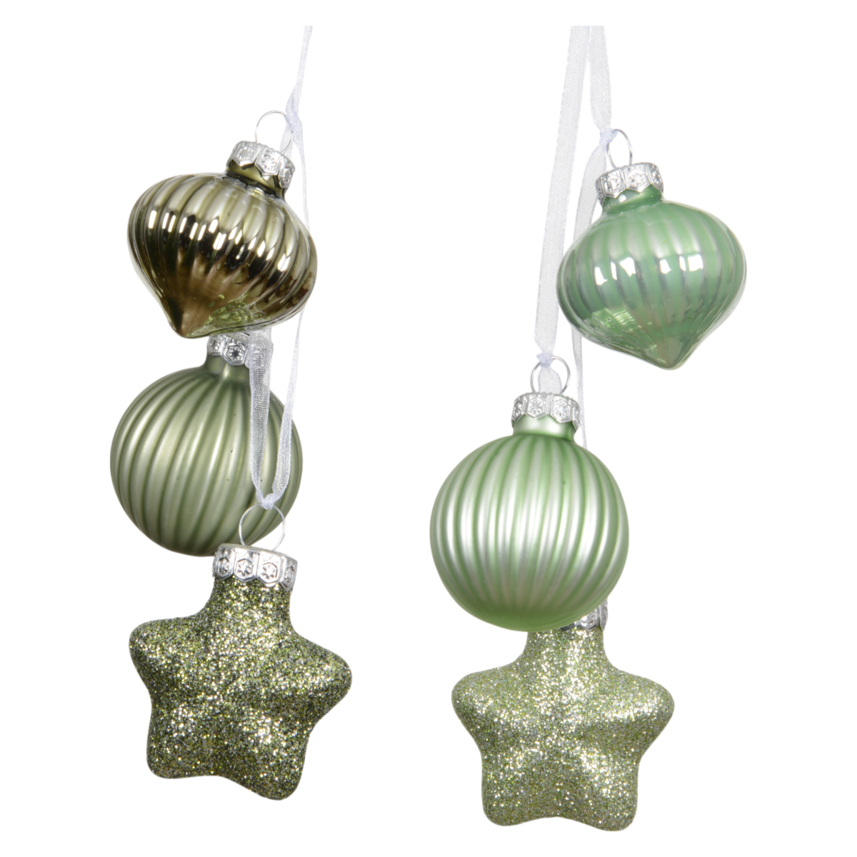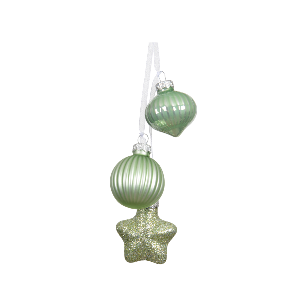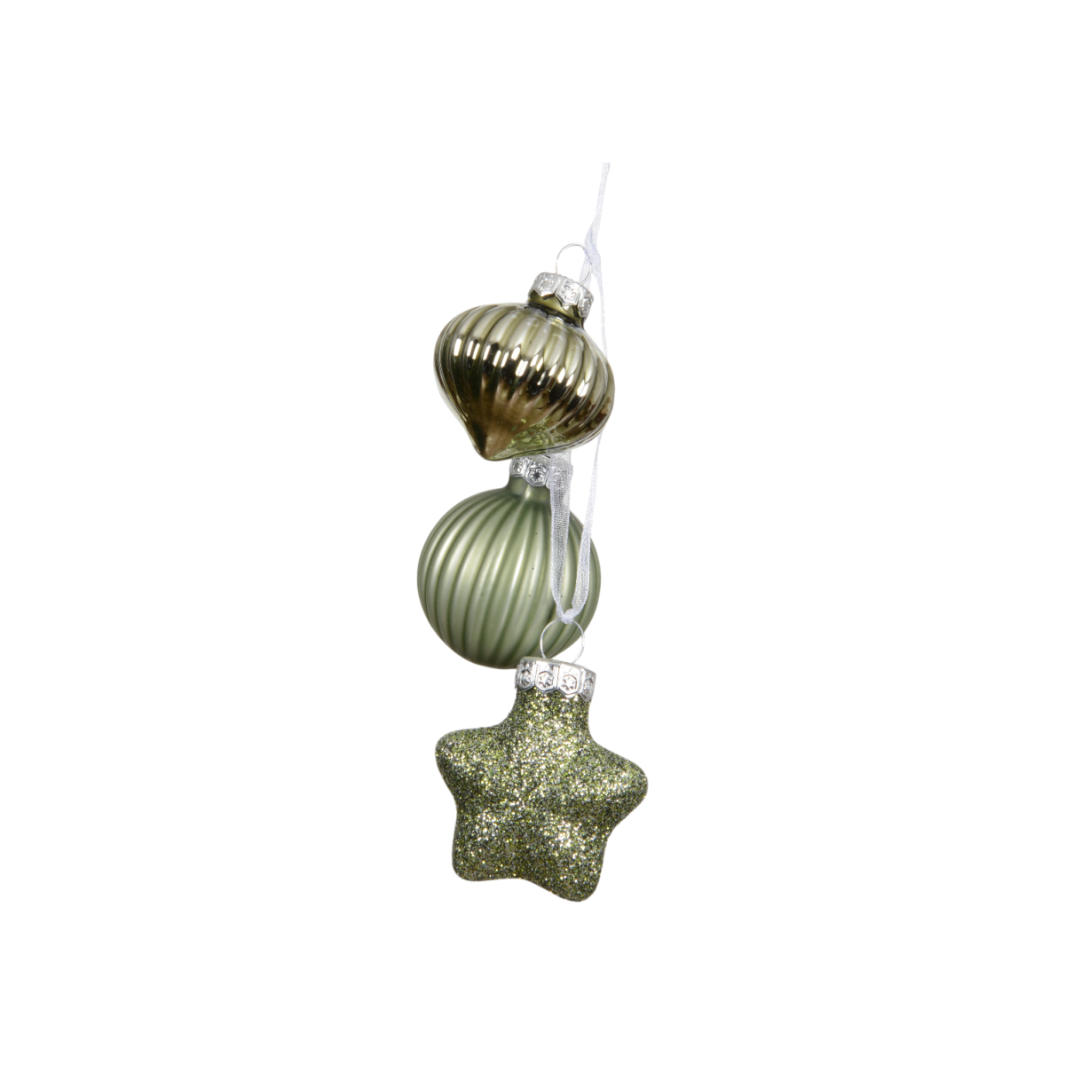Ez a különleges, 3 elemből álló karácsonyfadísz stílusos és friss színvilágával hoz természetközeli hangulatot a beltéri ünnepi dekorációba. A dísz egy hagymaformájú, egy bordázott gömb és egy csillag alakú elemből áll, amelyeket fehér szalag fűz egy dísszé. A dísz teljes magassága hozzávetőlegesen 11,5cm.
