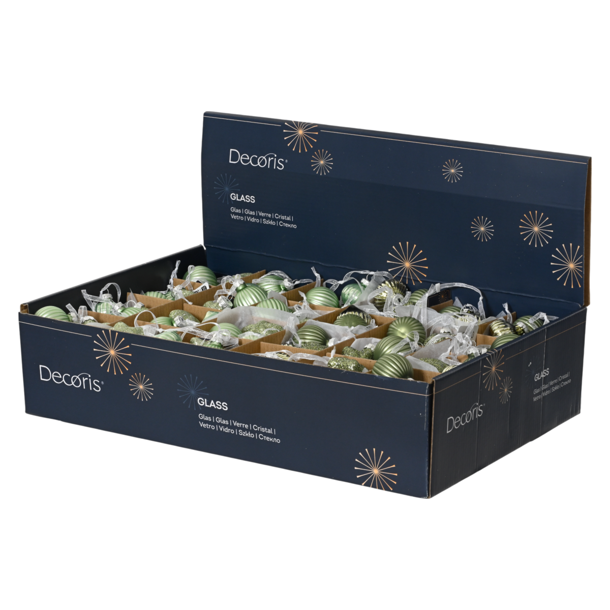 ✅ Részletgazdag kidolgozás – csillámos csillag, bordázott matt gömb, bordázott fényes hagymaforma