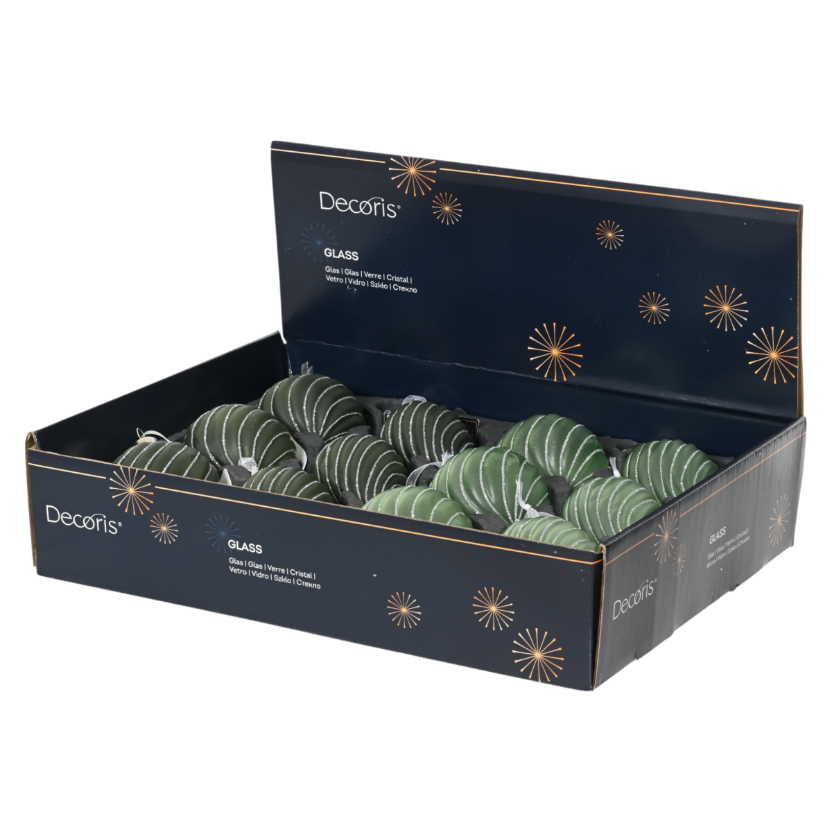 Tedd különlegessé az ünnepi dekorációt ezekkel az elegáns, üveg karácsonyfadíszekkel, amelyek harmonikus zöld árnyalataikkal és finom ezüst glitteres mintázatukkal természetes, mégis ünnepi hangulatot varázsolnak otthonodba.