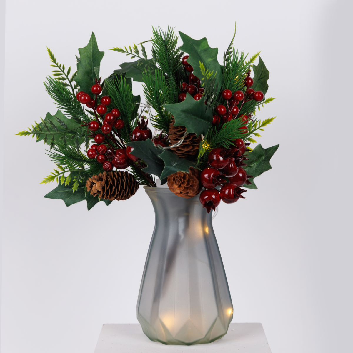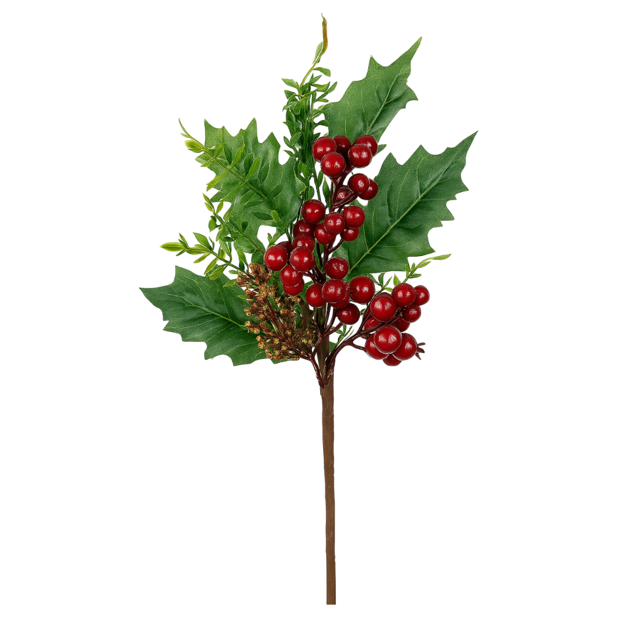Ez a 33 cm hosszú, piros bogyókkal díszített karácsonyi műág klasszikus ünnepi hangulatot áraszt, és sokoldalúan használható a lakásdekoráció részeként. A részletgazdag levelek és a fényes bogyók élethű megjelenést kölcsönöznek, így kiváló választás adventi koszorúkhoz, ünnepi asztaldíszekhez vagy akár vázába, virágcserépbe helyezve is.