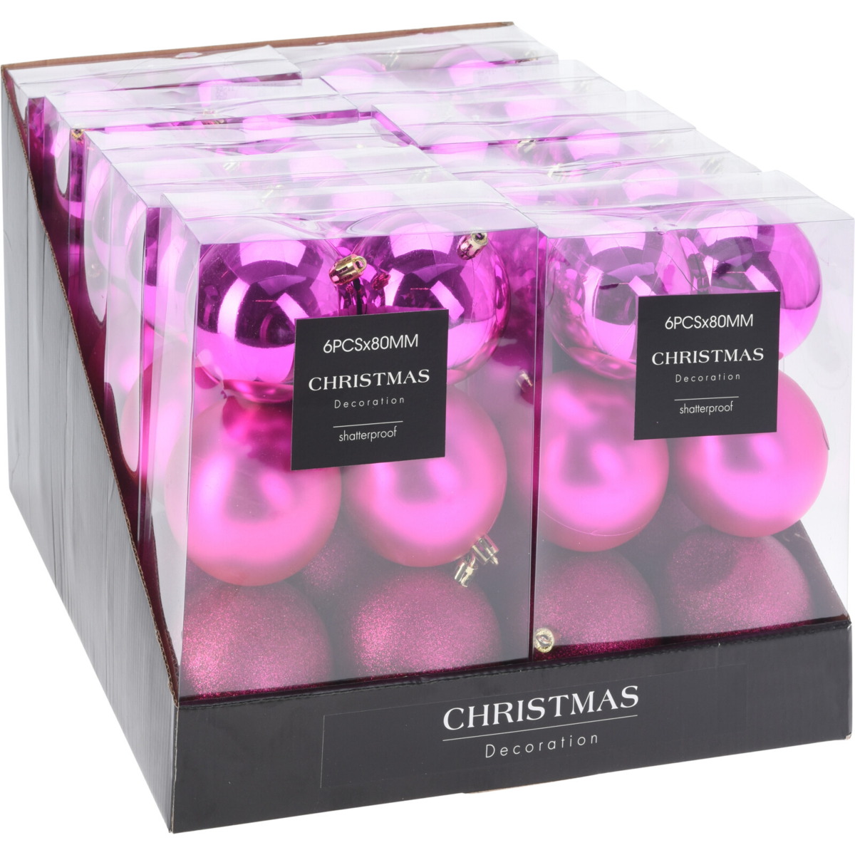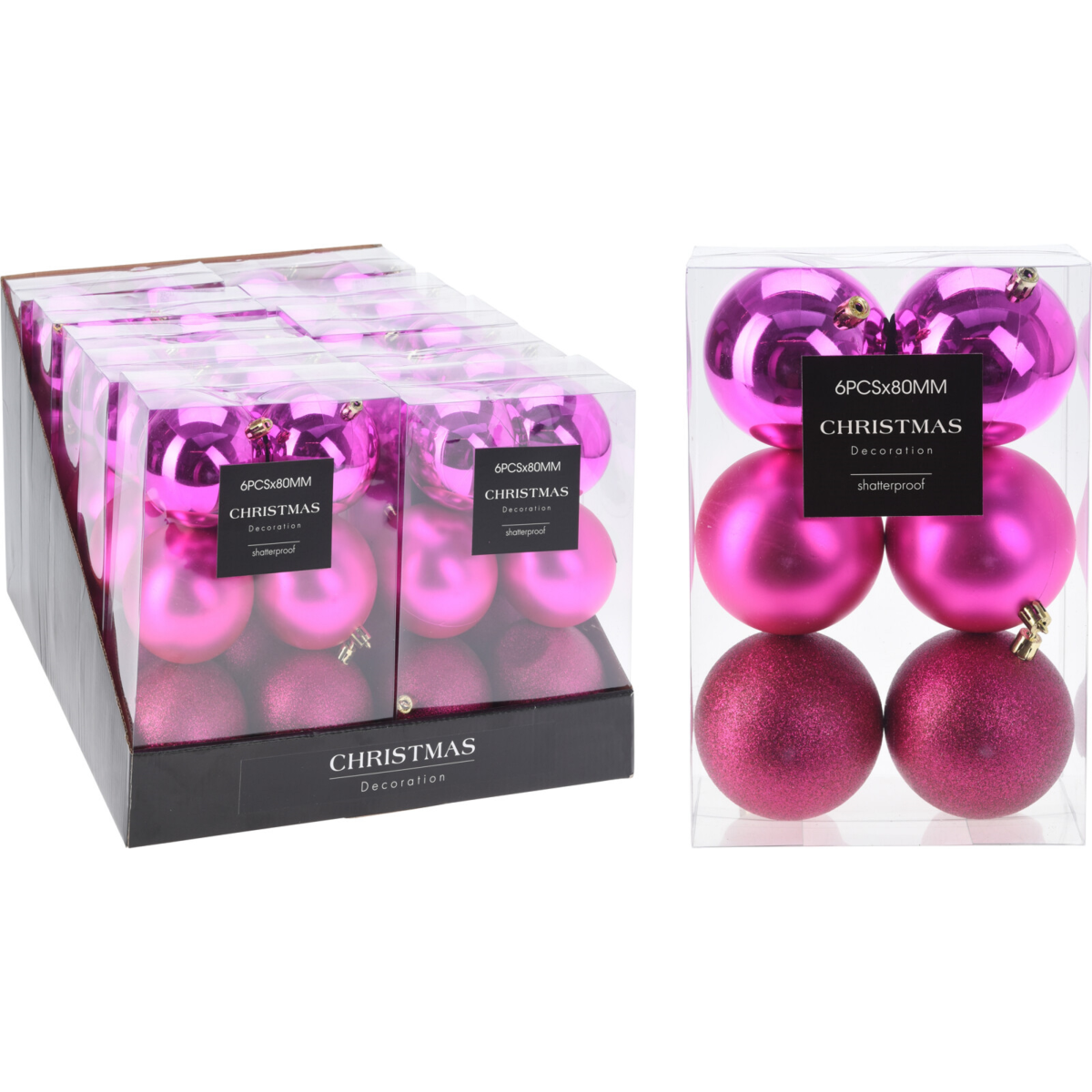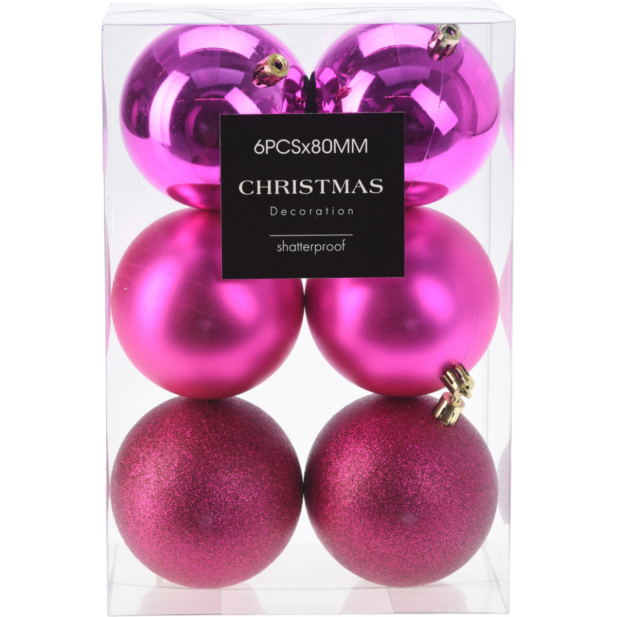 Karácsonyi hangulatú dekorációs kellék, mellyel szebbé varázsolható az otthon. Polipropilénből készült, fukszia színben érhető el. 1 gömb mérete 8 cm, egy csomag 6 db gömböt tartalmaz.