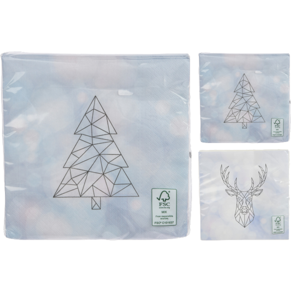 Papír szalvéta, 20 db/csomag. Mérete: 33X33 cm. 2-féle modell (fenyőfa, rénszarvas). Online rendelés esetén kérjük, szíveskedjen feltüntetni az igényelt modellt a rendelés véglegesítése előtt a megjegyzés rovatban! Továbbá kérjük, szíveskedjen előzetesen érdeklődni az igényelt modell rendelkezésre állásáról, mivel a készlet áruházanként eltérő.