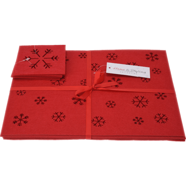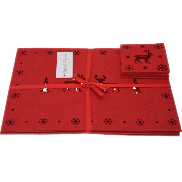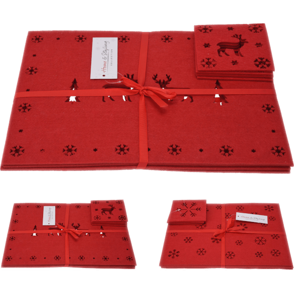 Anyaga: filc. A tányéralátét mérete: 33x25cm. A poháralátét: 10x10cm. 4 db / szett mind a kettőből. 2-féle modell: rénszarvas/ hópihe. Online rendelés esetén kérjük, szíveskedjen feltüntetni az igényelt modellt a rendelés véglegesítése előtt a megjegyzés rovatban! Továbbá kérjük, szíveskedjen előzetesen érdeklődni az igényelt modell rendelkezésre állásáról, mivel a készlet áruházanként eltérő.