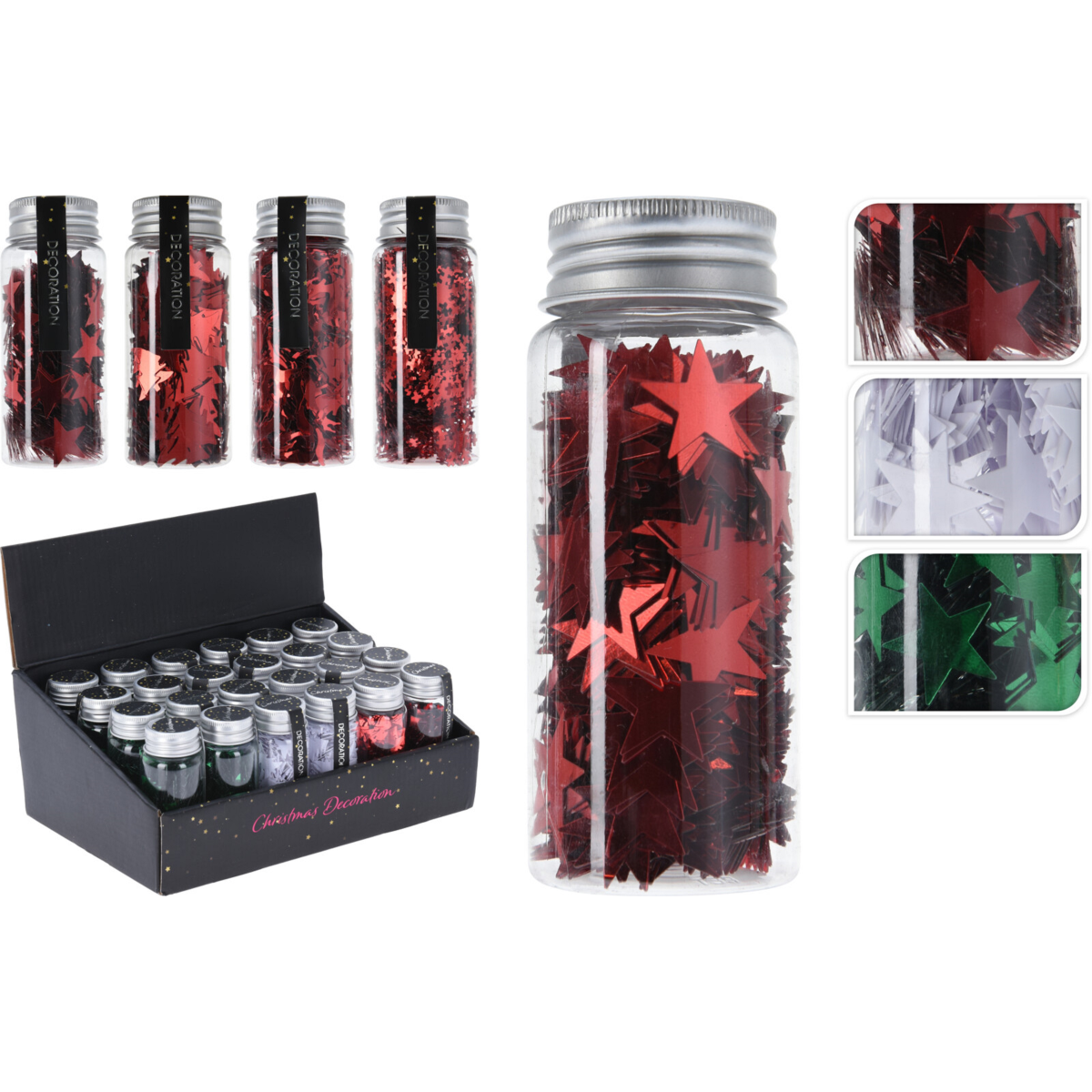 A termék egy karácsonyi hangulatú dekorációs elem, amelynek méretei 9x4x4 cm. A három vegyes szín - zöld, piros és fehér - valamint a csillag, hópihe, rénszarvas és fenyő minták mind hozzájárulnak az ünnepi atmoszférához. A konfetti három különböző színben jelenik meg, ami tovább fokozza a dekoratív hatást. Ez a termék tökéletes lehet az ünnepi asztal díszítésére vagy ajándékként is adható, hogy növelje a karácsonyi hangulatot.
