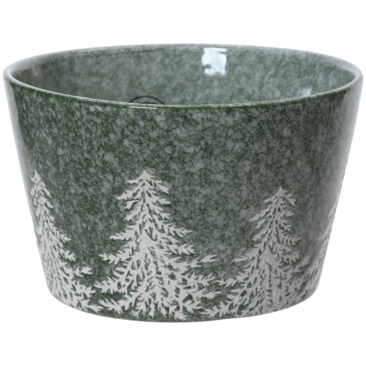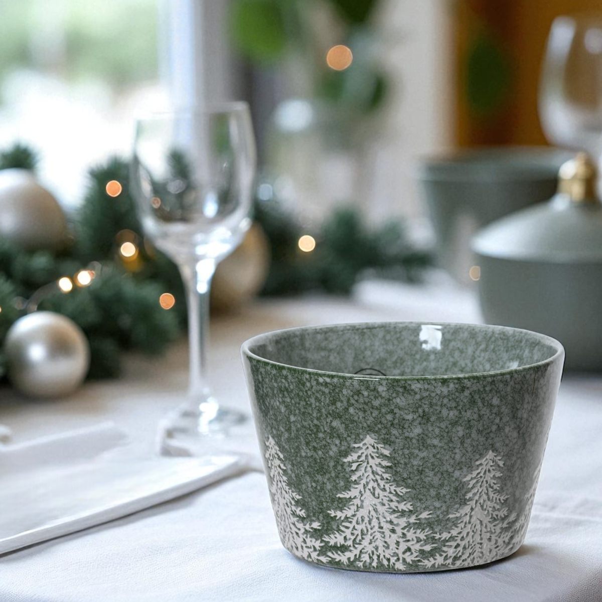 Ez a mély, zöld színű kerámia dísztál ünnepi mintájával tökéletes választás a karácsonyi dekorációkhoz. A 13 cm átmérőjű, 8 cm magas kialakítás praktikus kisebb ajándékok, édességek vagy dekorációs elemek tárolására, de önmagában is dekoratív kiegészítője lehet az ünnepi asztalnak vagy polcnak.